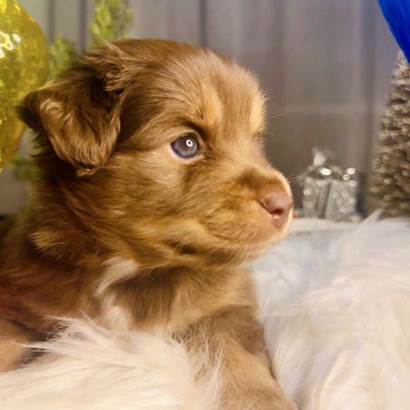 The Gorgeous Red Tri Mini Aussie with Stunning Amber Eyes!