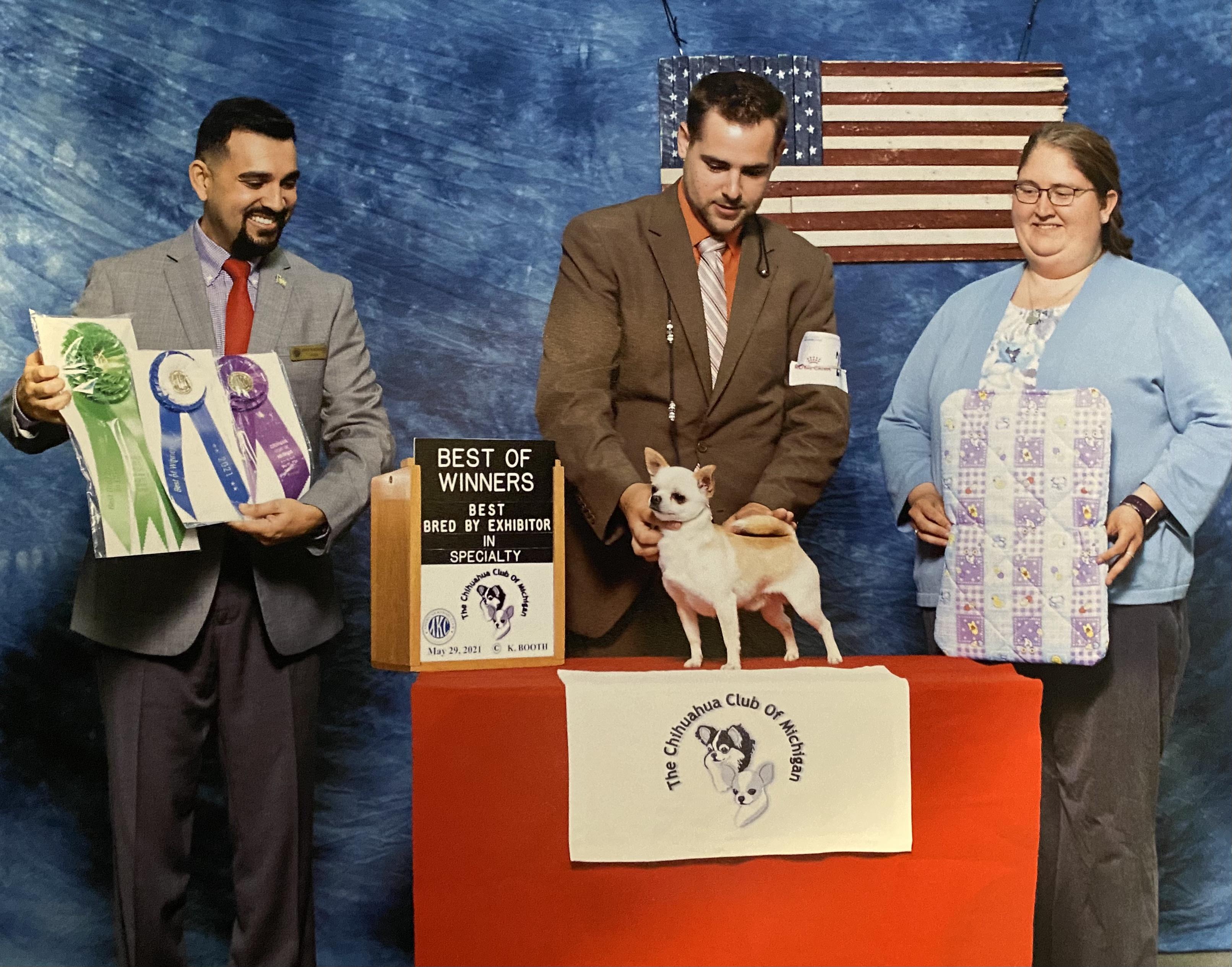 My love for the breed has been life long. My grandmother bred chihuahuas for 50+ years and I’ve always been associated. There’s not been a day in my life I haven’t had a chihuahua. I started showing our dogs when I was 12, showing in both juniors and the breed ring with success. Now that I’m “grown up” I have taken over grandmas breeding program and began to develop my own.