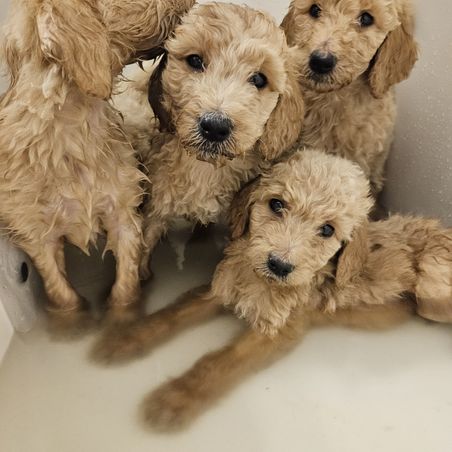 Pups are getting to experience a little mini bath to get comfortable around water! One little girl is super relaxed.