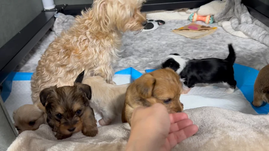 i can not say enough great things about alivia and the entire experience from beginning to end! alivia was so responsive, accommodating, helpful, friendly, and just a lovely person! and baby penelope has captured my heart and already brought so much love and warmth to our home after just one day! she has such a sweet, playful, and curious temperament, but LOVES being cuddled, which is exactly what i was hoping for in my new best friend. she's also vibrant, healthy, and has a good appetite, and immediately knew how to poop on the pad as soon as i put it down in her pen. i was also pleasantly surprised by the very generous goodie package that alivia provided. it was far beyond my expectations, and it's nice to have all the keepsakes of the experience. i would very enthusiastically recommend alivia and sunkissed morkies without hesitation to anyone looking for a new bundle of love in their life!