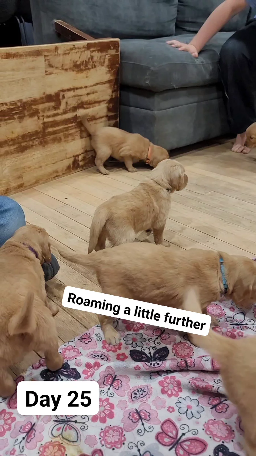 Puppies are 3 weeks old and starting to play and eat puppy food.
