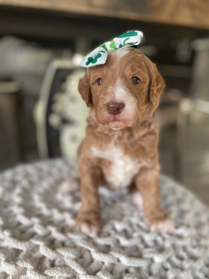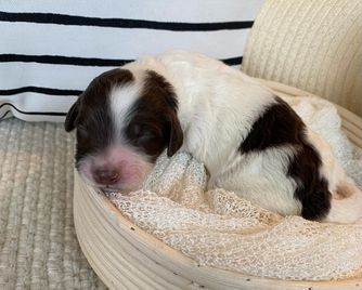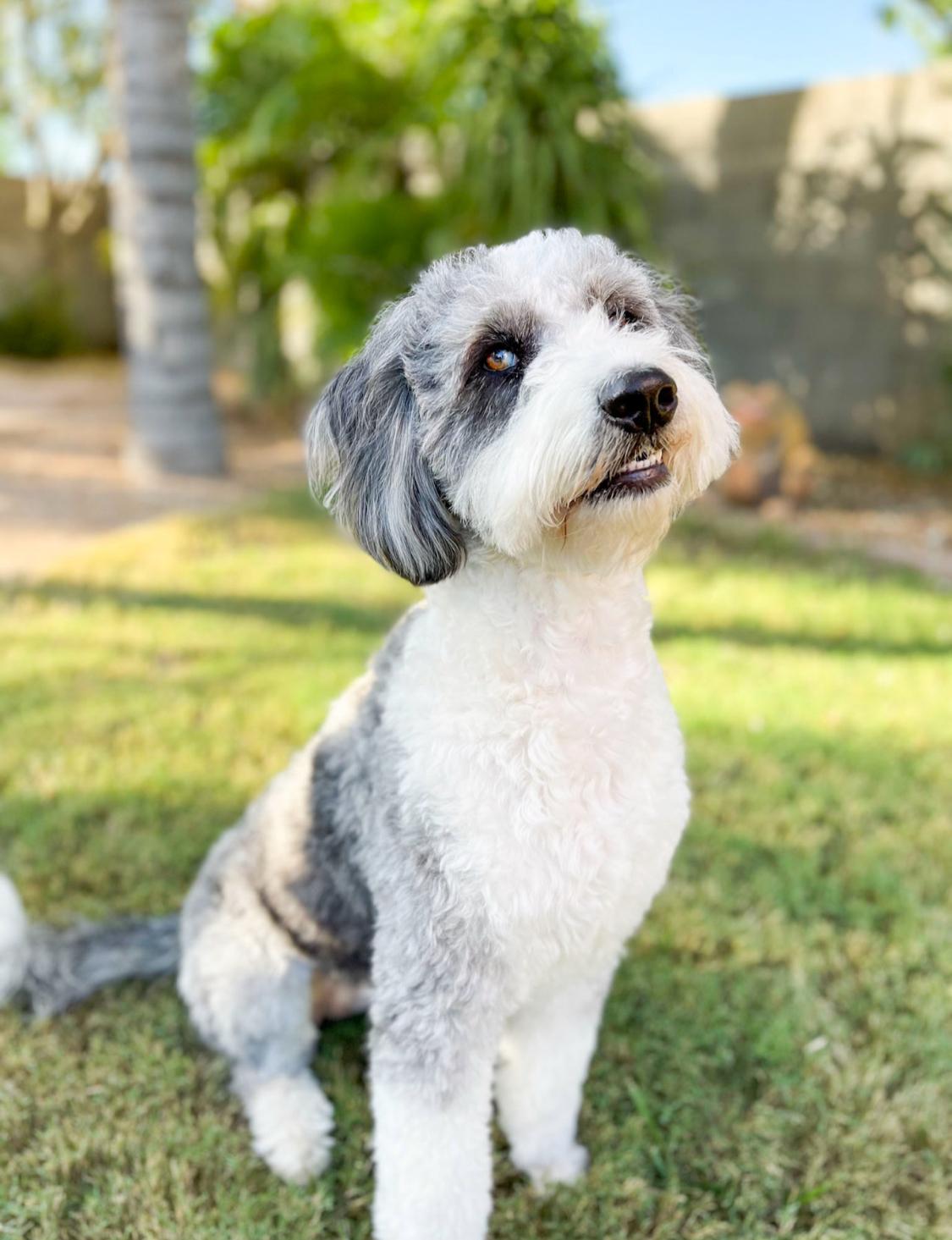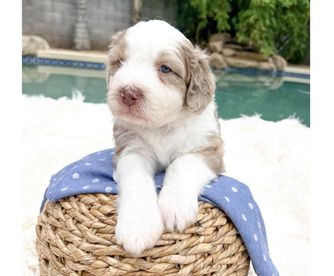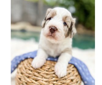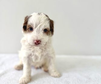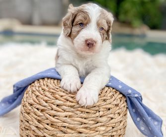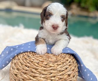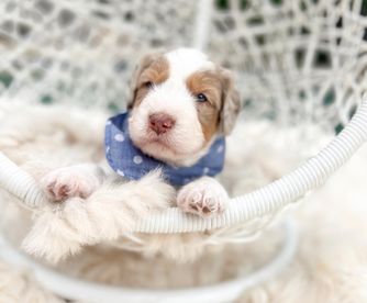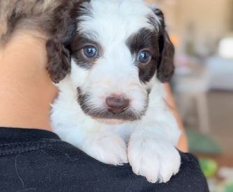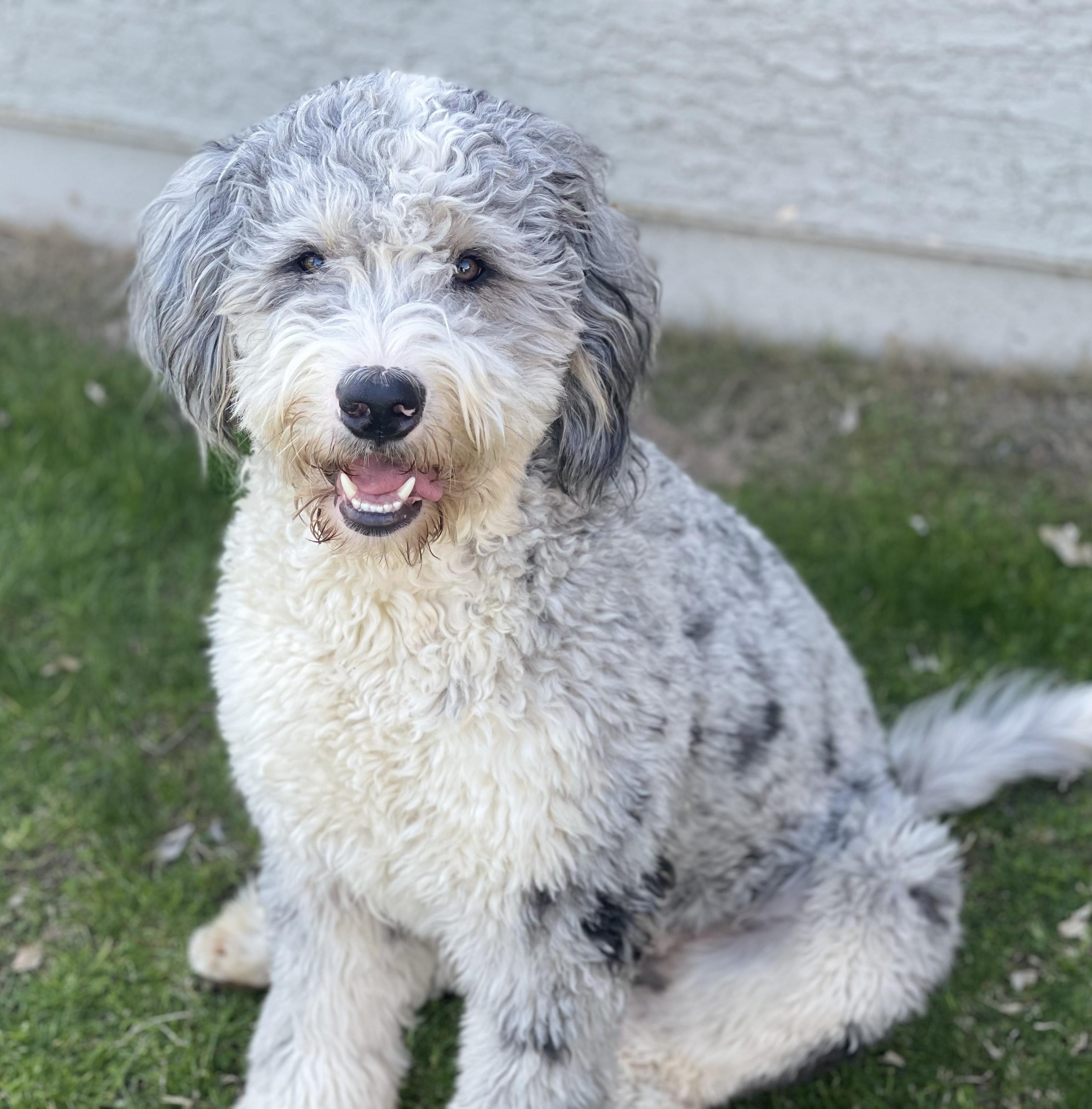Our Sheepadoodle puppies include blue merle and white, blue gray and white, black and white, and blue merle. Goldendoodle puppies include cream, apricot, red, chocolate, black, phantom, merle, and parti. Poodle puppies include brown, parti, and phantom. Aussiedoodle puppies include blue merle, red merle, black and white, and red tri-color. Bernedoodle puppies include black and white, tri-color, phantom, and blue merle. Double Doodle puppies include parti and brown. Colors will vary depending on the parent dogs.