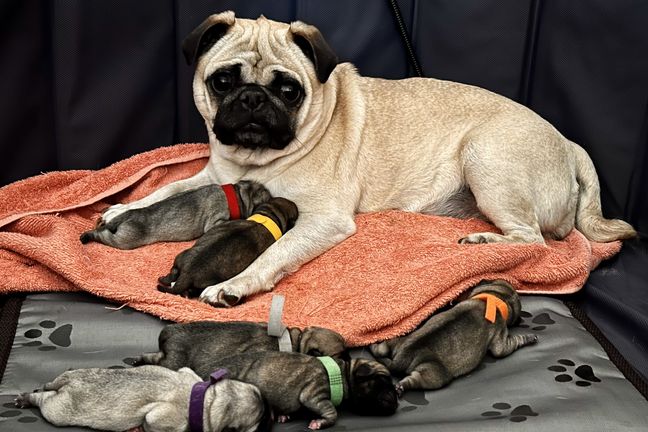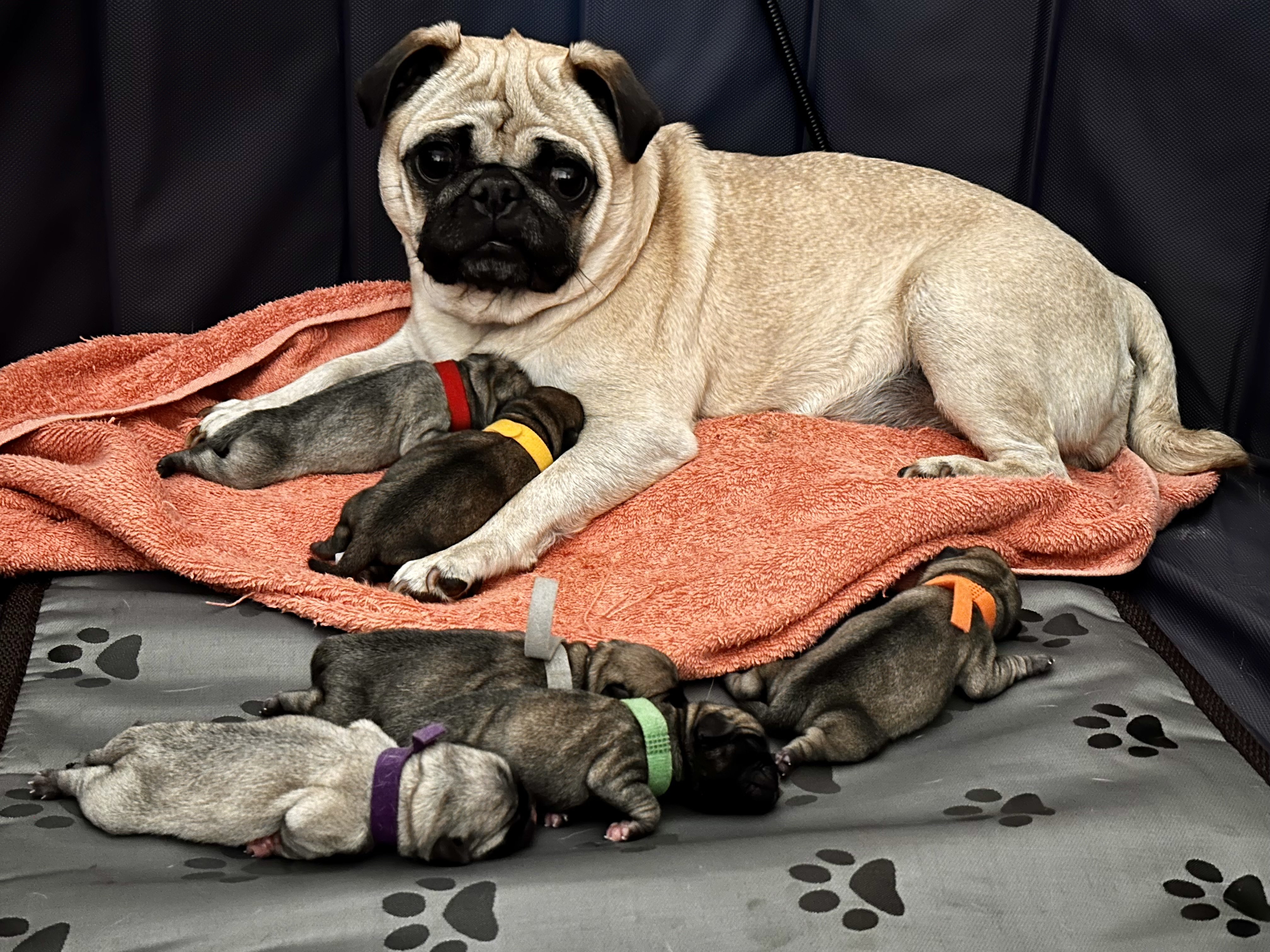 I'm Yvette D., the breeder behind Sunny Pugs located in Sunfield, MI. Mabel is our first pug and this is her first litter. She had been an amazing momma and these babies have gotten so much love already! If you’re looking for some love sprinkled with a little bit of mischief, a pug is for you!