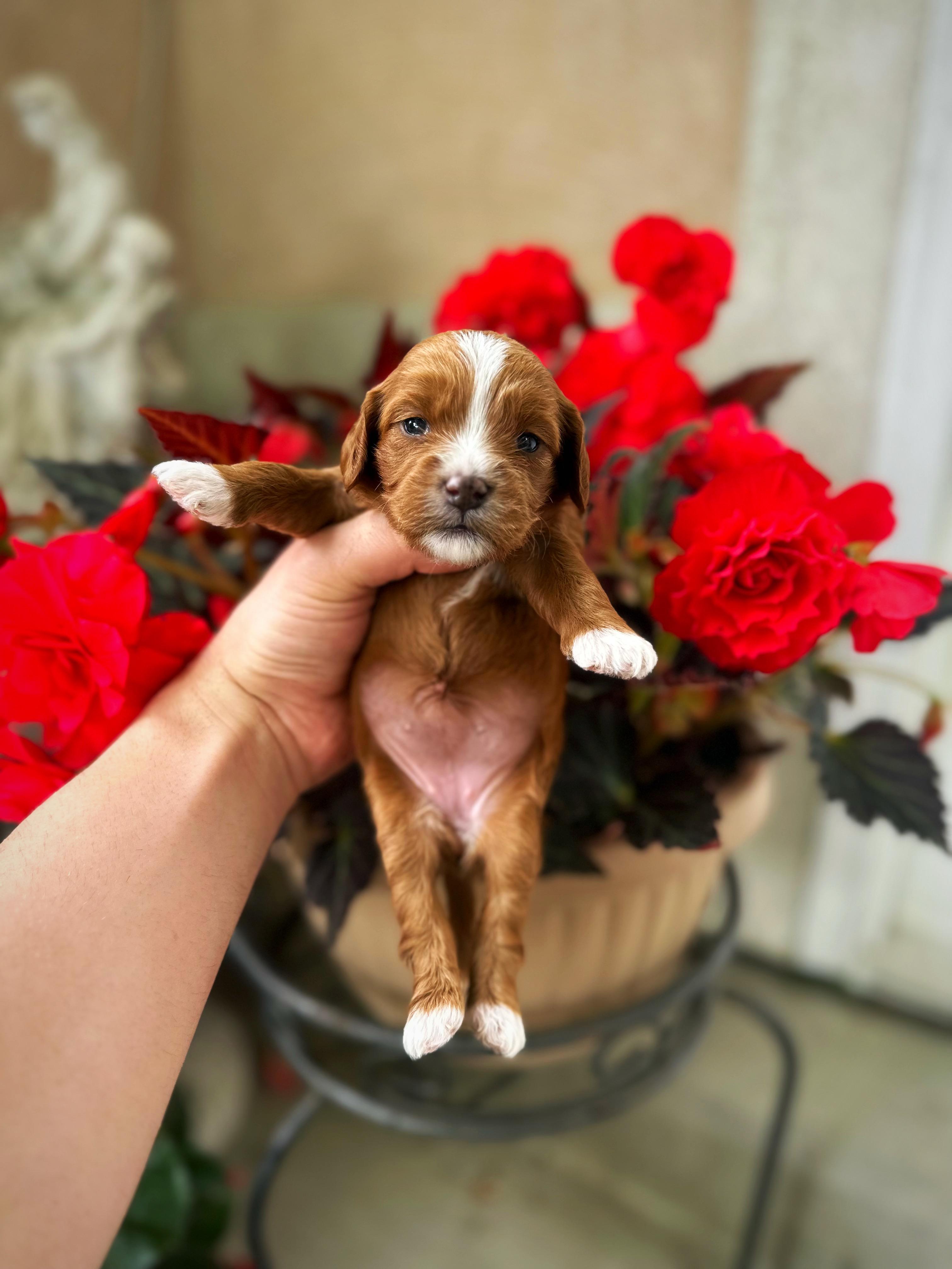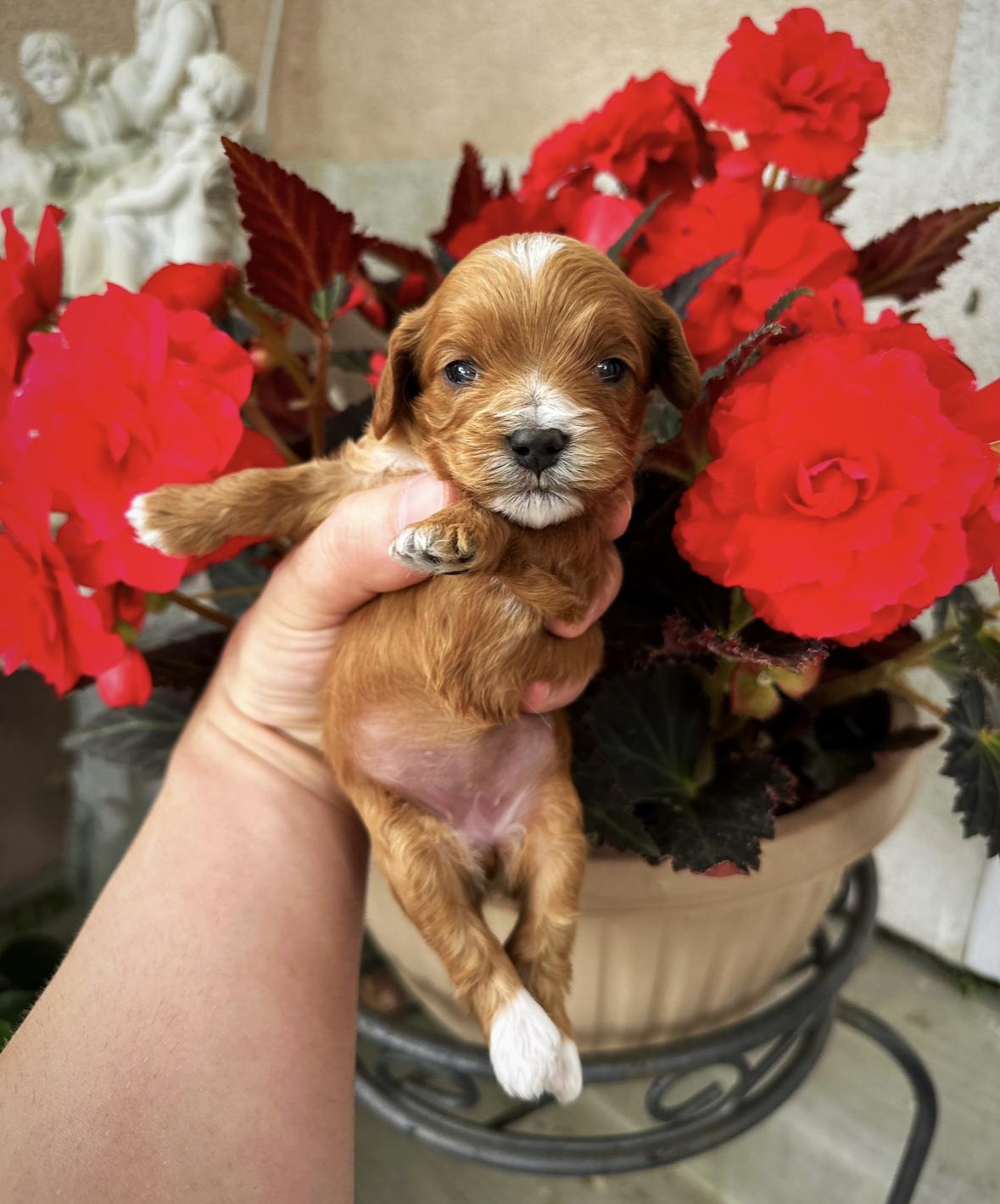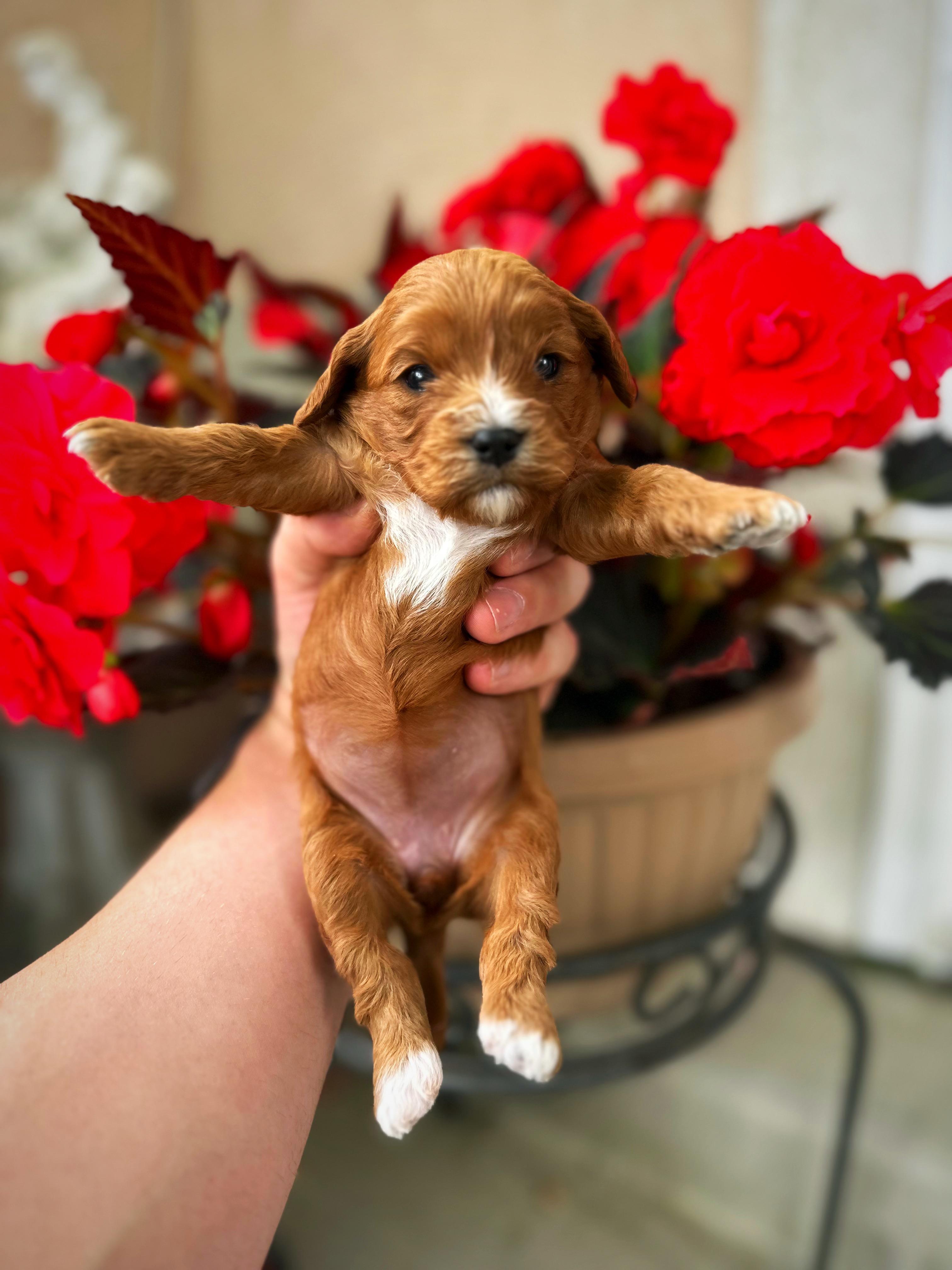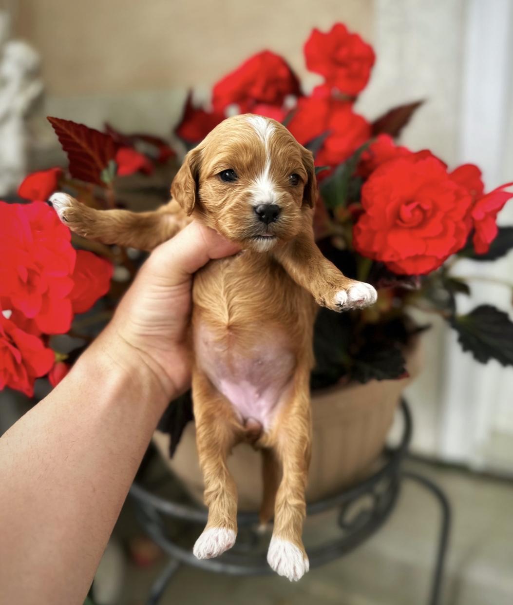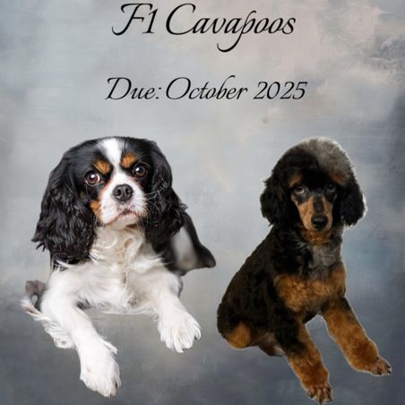 Our Cavapoo puppies include apricot, tri-color, red, black and white, and black and tan. Cockapoo puppies include red, red and white, cream, buff, brown, and black and tan. Colors will vary depending on the parent dogs.