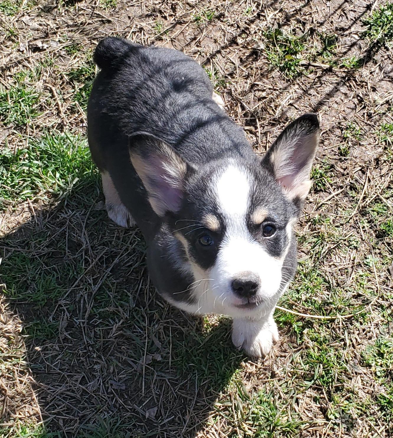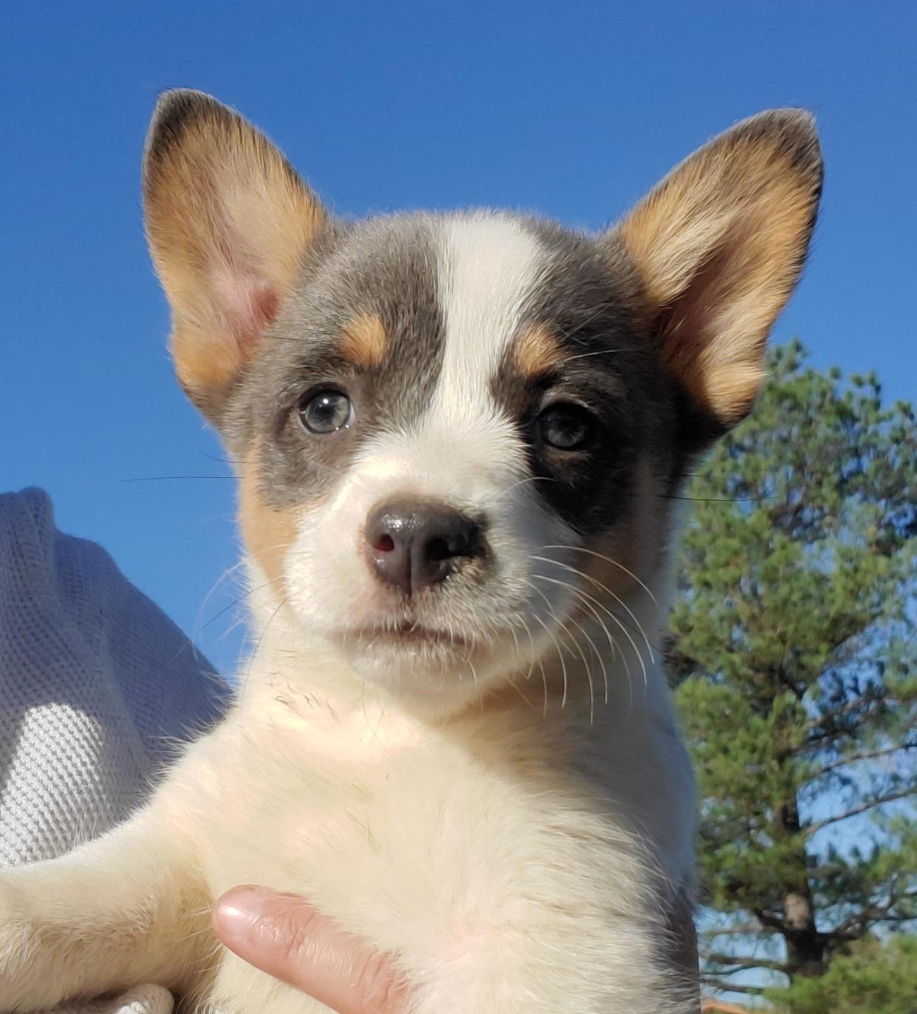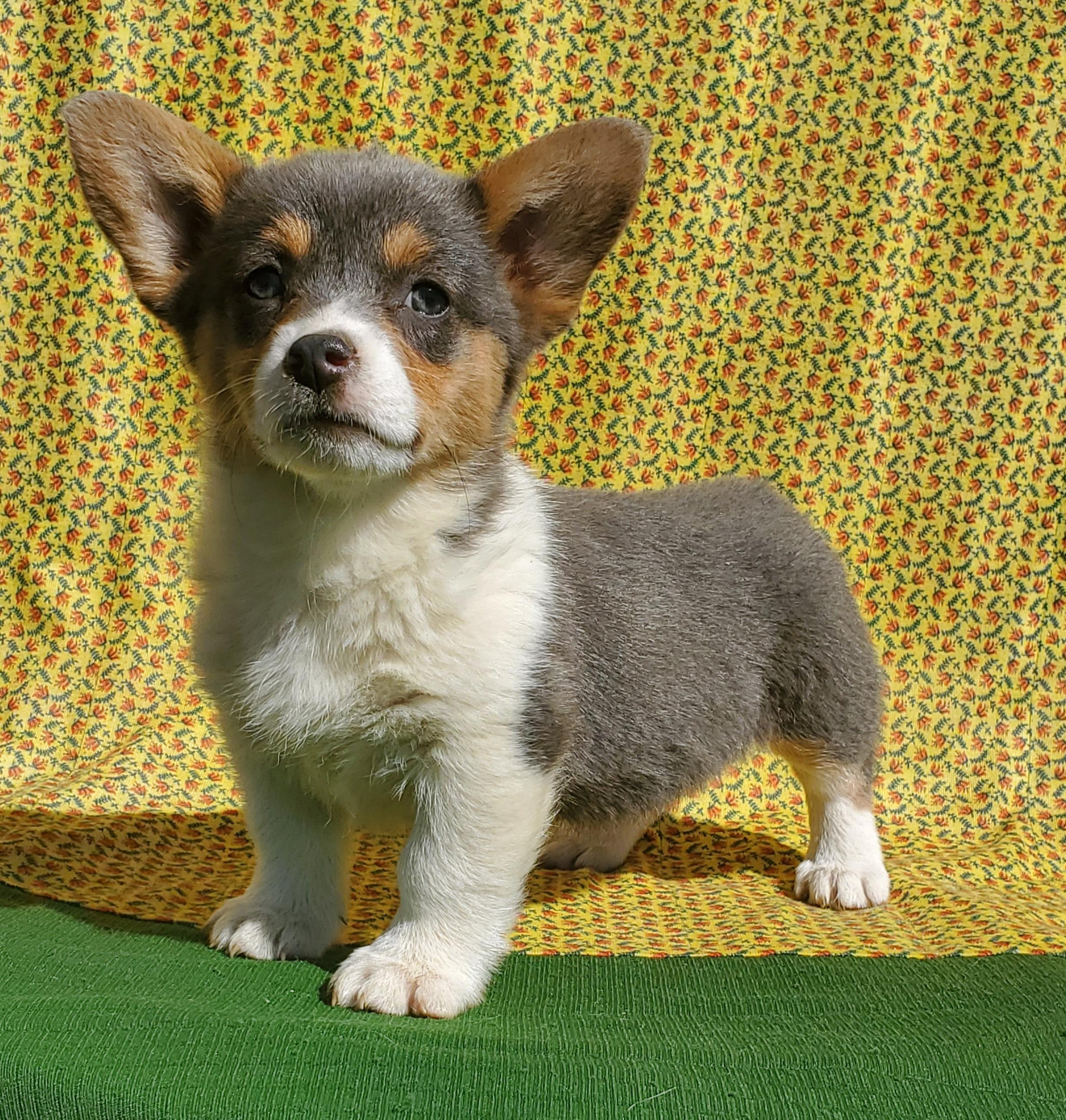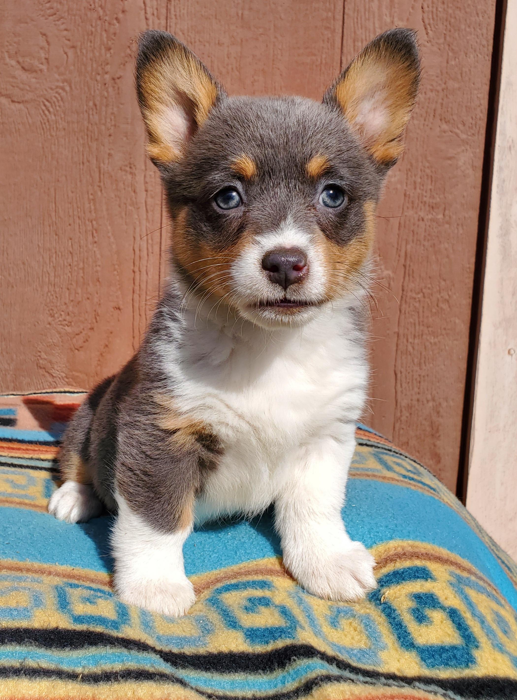 Our Pembroke Welsh Corgi puppies are blue. American Corgi puppies include gray and white, fawn, brindle merle and white, blue merle and white, and black and tan. Colors will vary depending on the parent dogs.