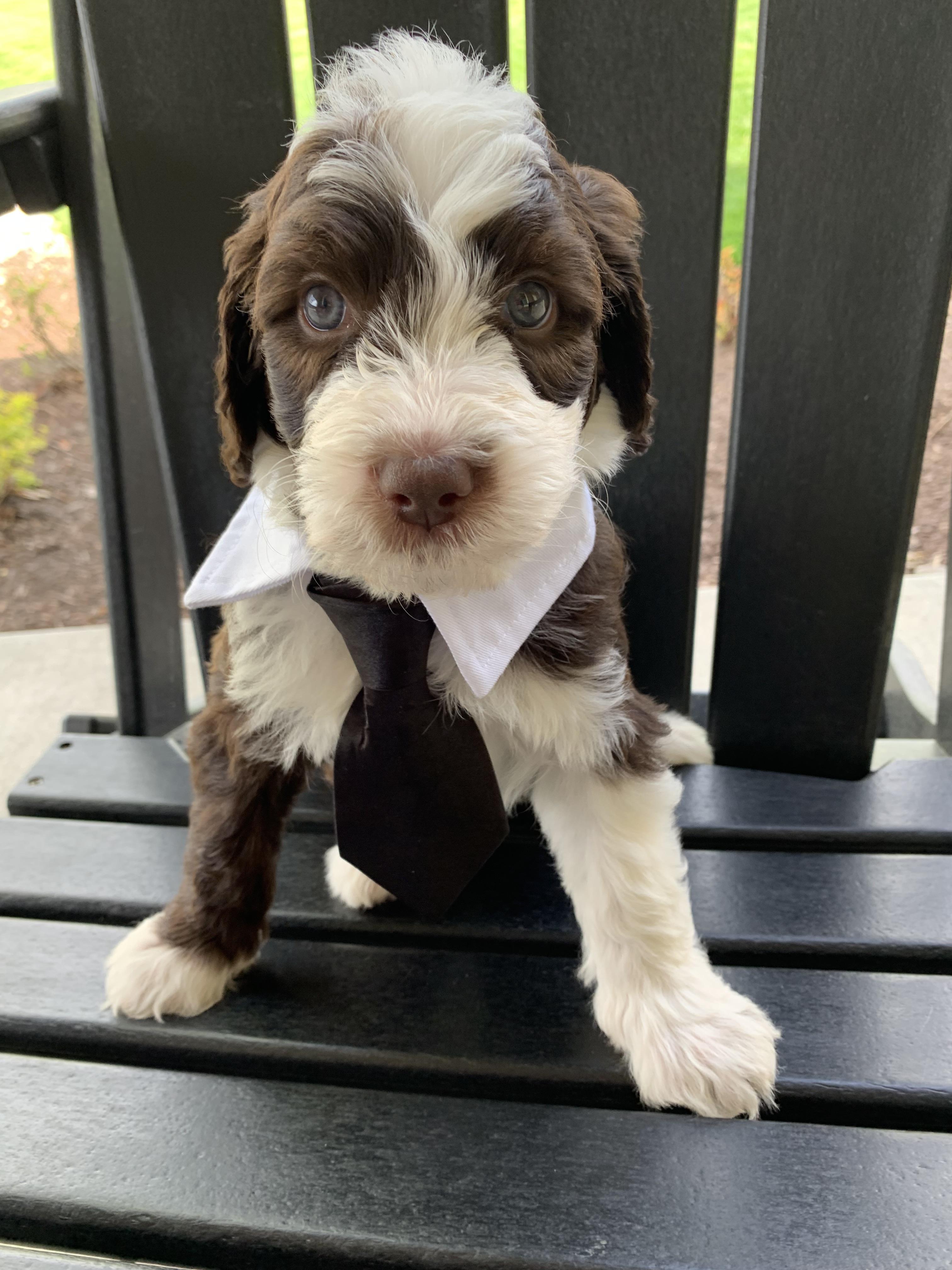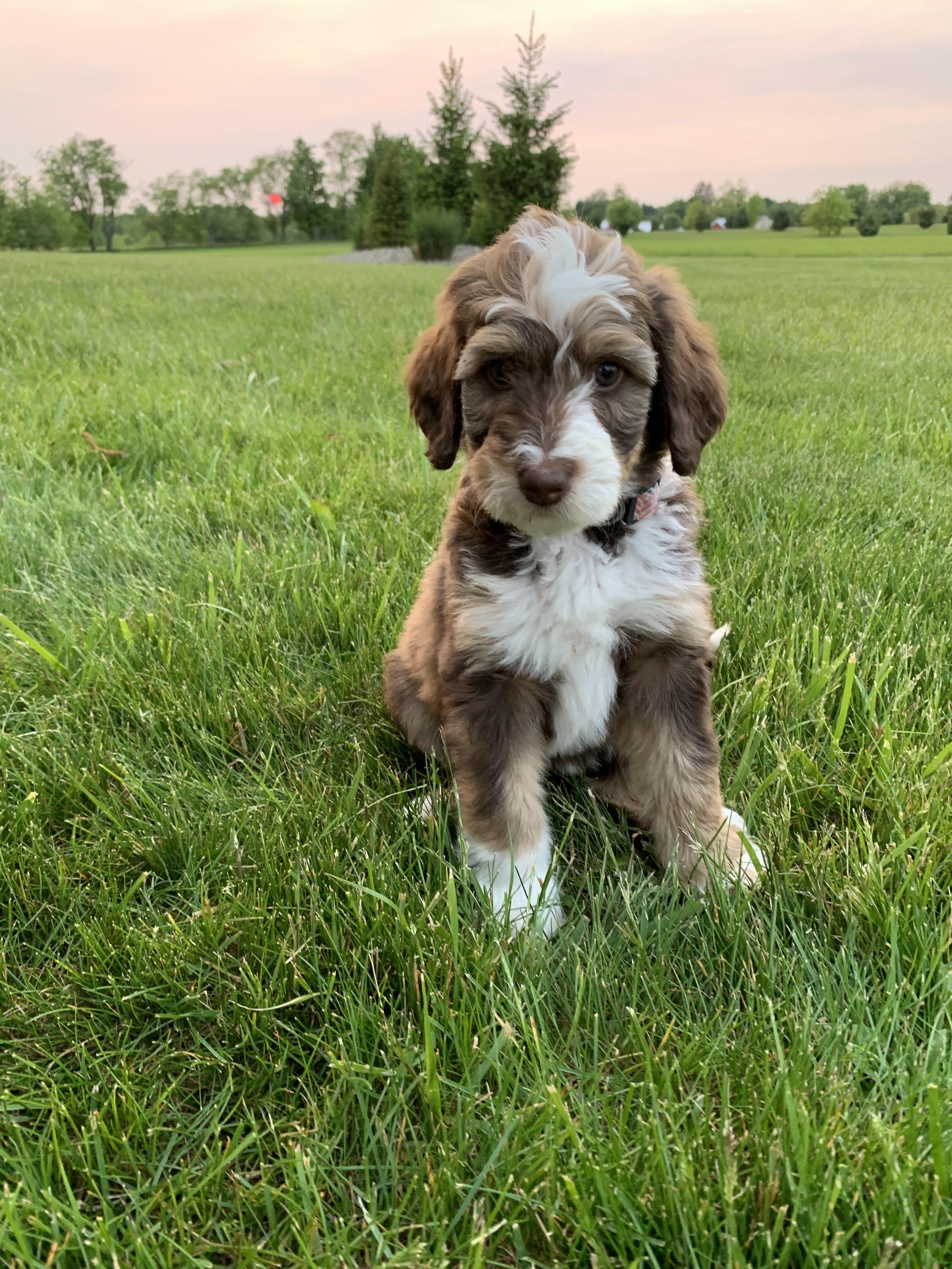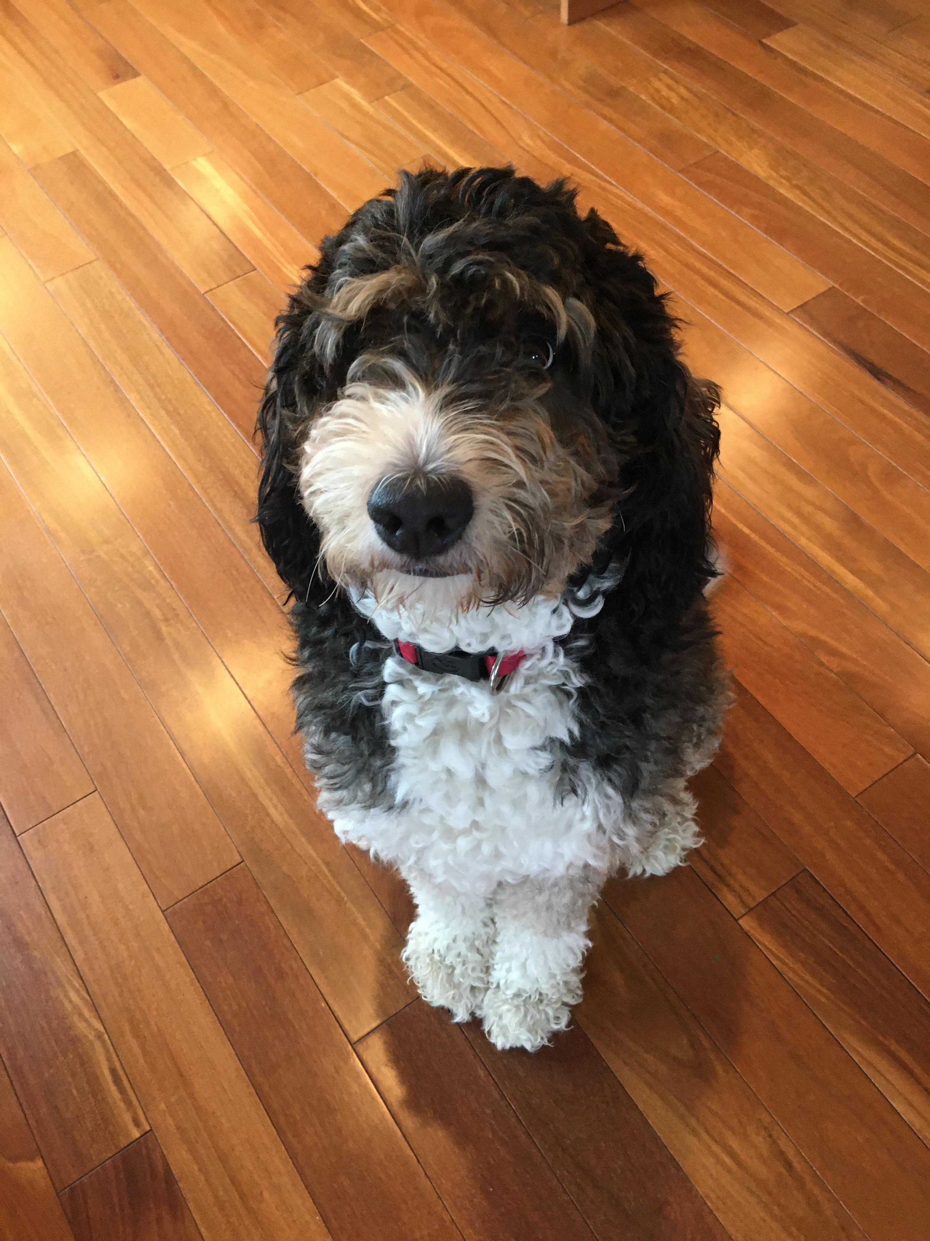 Roxie is our sable Bernedoodle. She is smart, affectionate, and loves to snuggle. She is our resident bed hog. Roxie is 45 lbs and has been genetically tested and clear of any concerns.