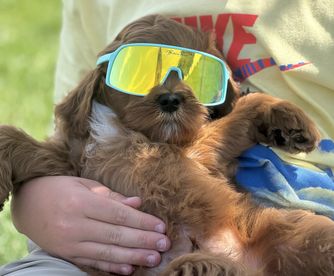 Our Goldendoodle puppies include apricot and red. Bernese Mountain Dog puppies include tri-color and black rust and white. Colors will vary depending on the parent dogs.