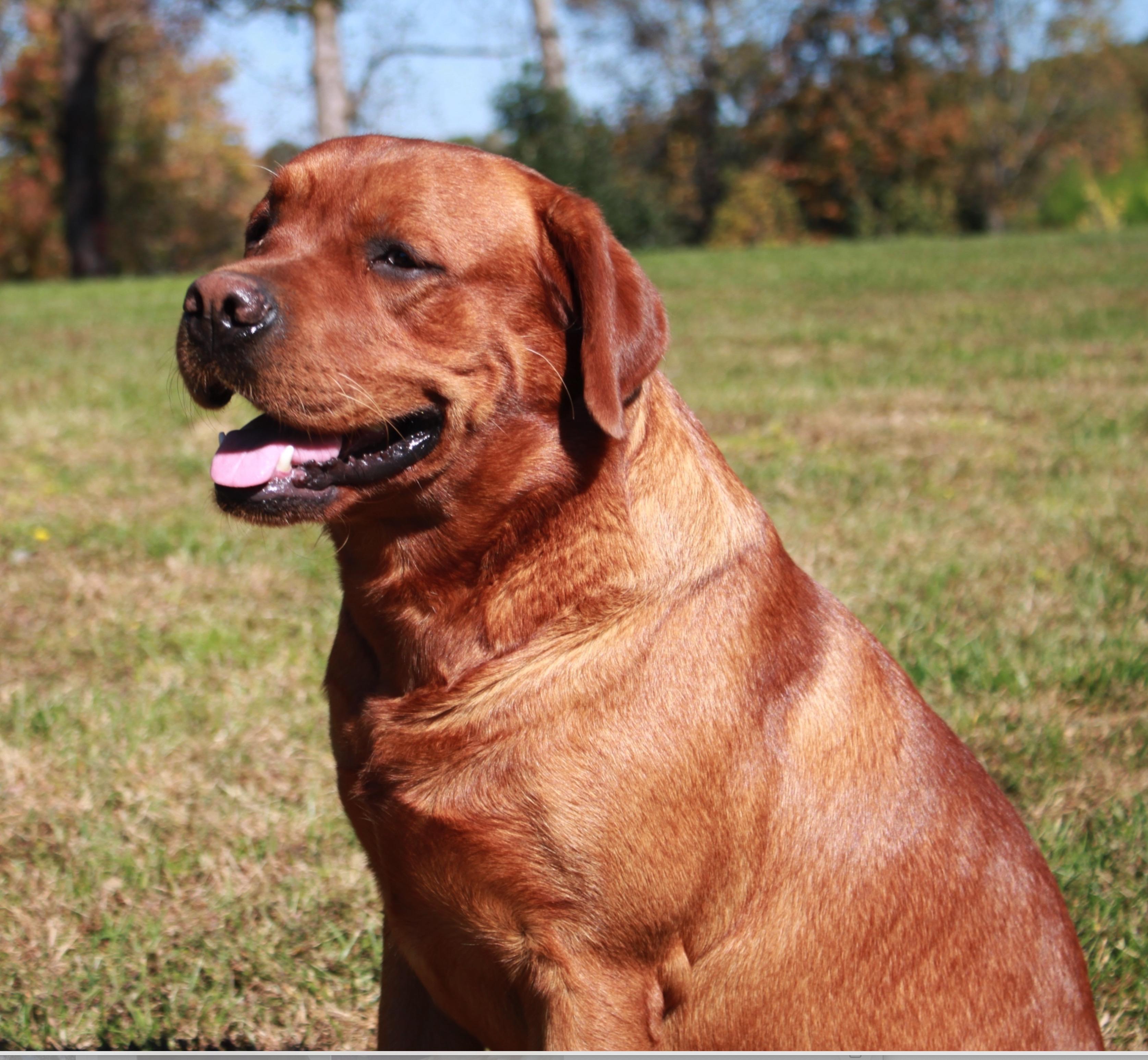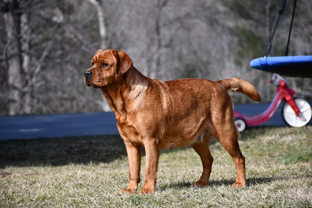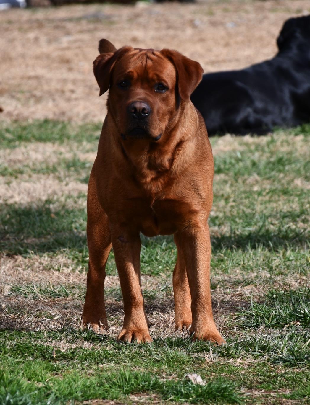 Brock is 100% English fox red coming from the Kelly Green and Keepsake lines. He has a huge boxy head and stocky muscular body. His demeanor and temperament are next to none.