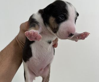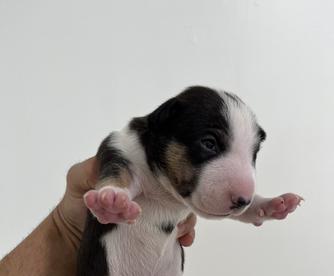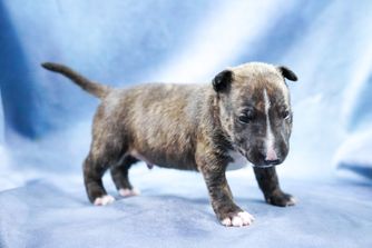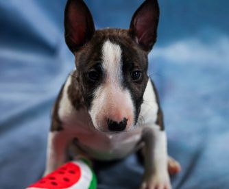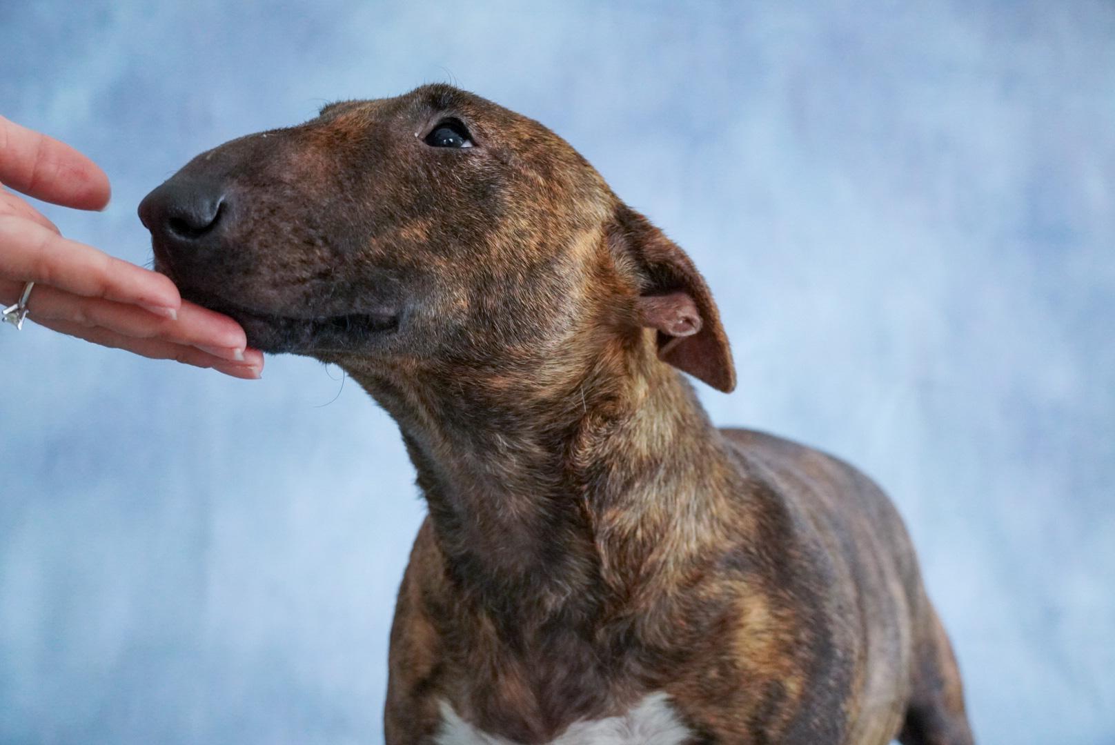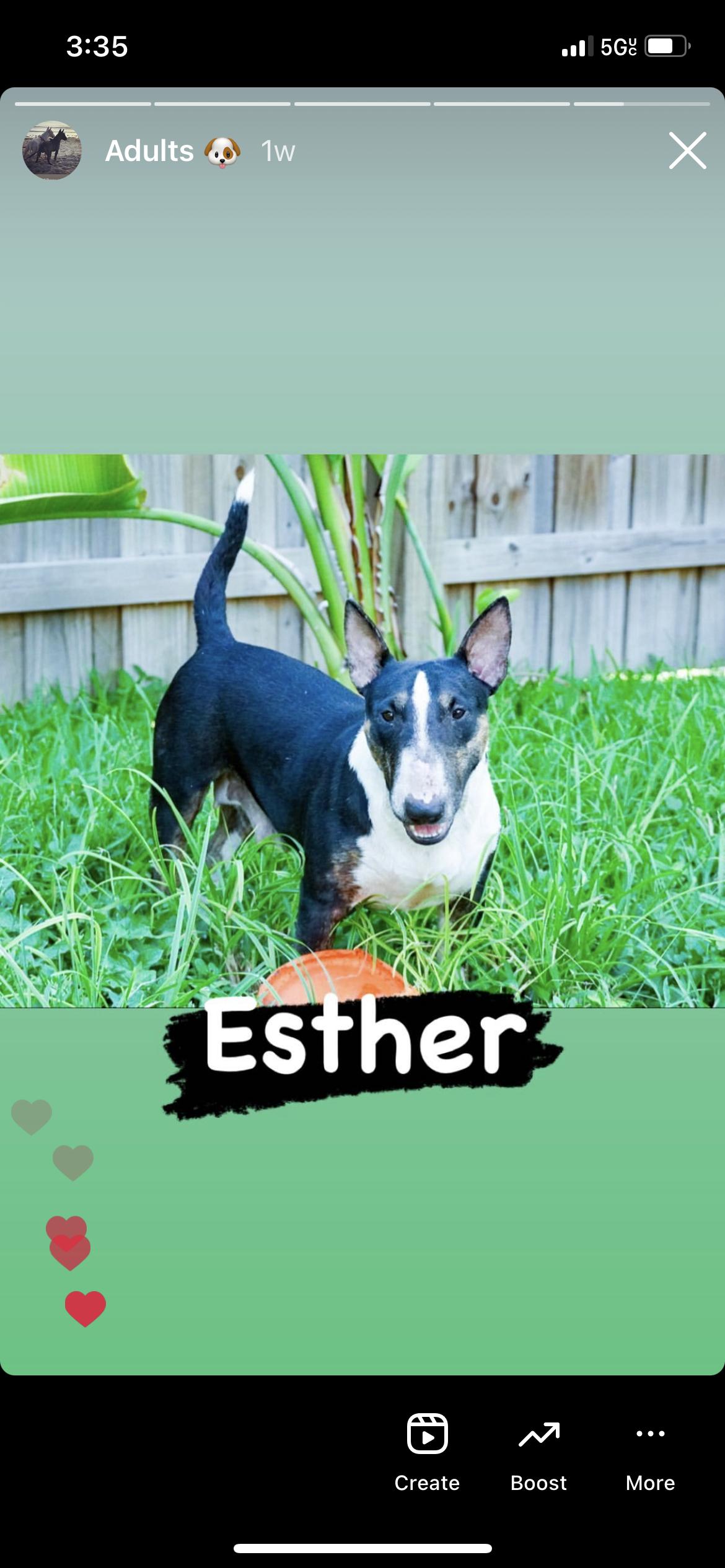 Esther is a female Miniature Bull Terrier. Carefully selected as a great representative of her breed, Aidely decided to make her part of their program. Aidely has passed Good Dog’s screening process, which involved a review of their breeding practices, environment, and the mental and physical health of their dogs.