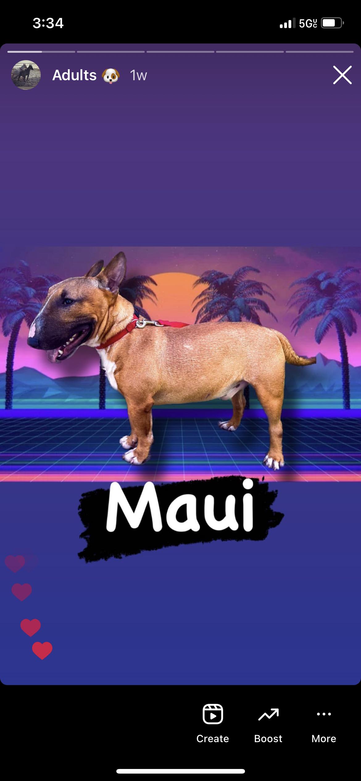 Maui is a male Miniature Bull Terrier. Carefully selected as a great representative of his breed, Aidely decided to make him part of their program. Aidely has passed Good Dog’s screening process, which involved a review of their breeding practices, environment, and the mental and physical health of their dogs.