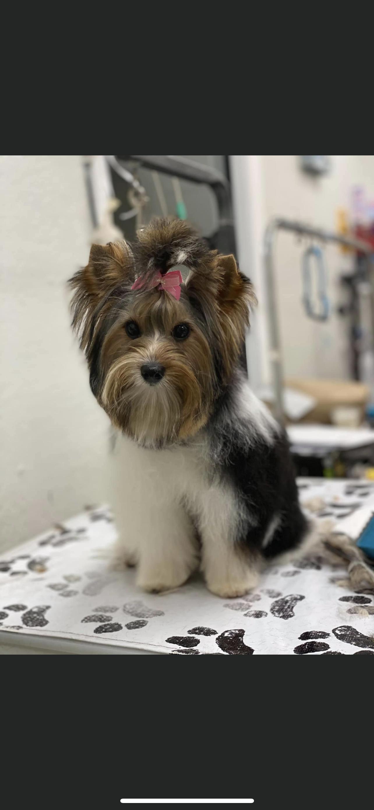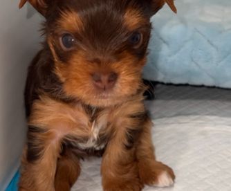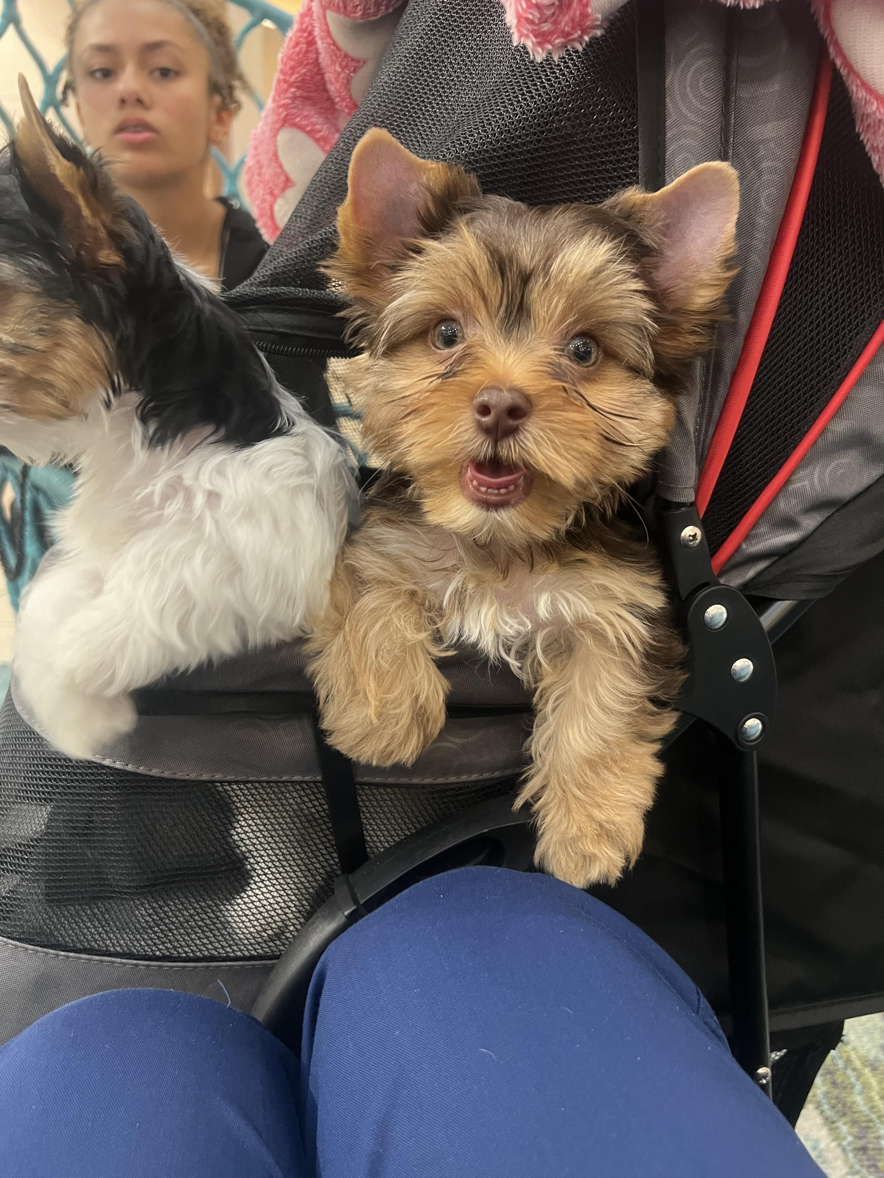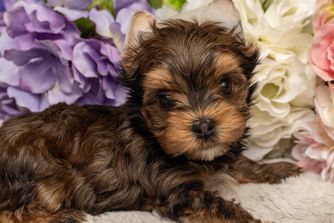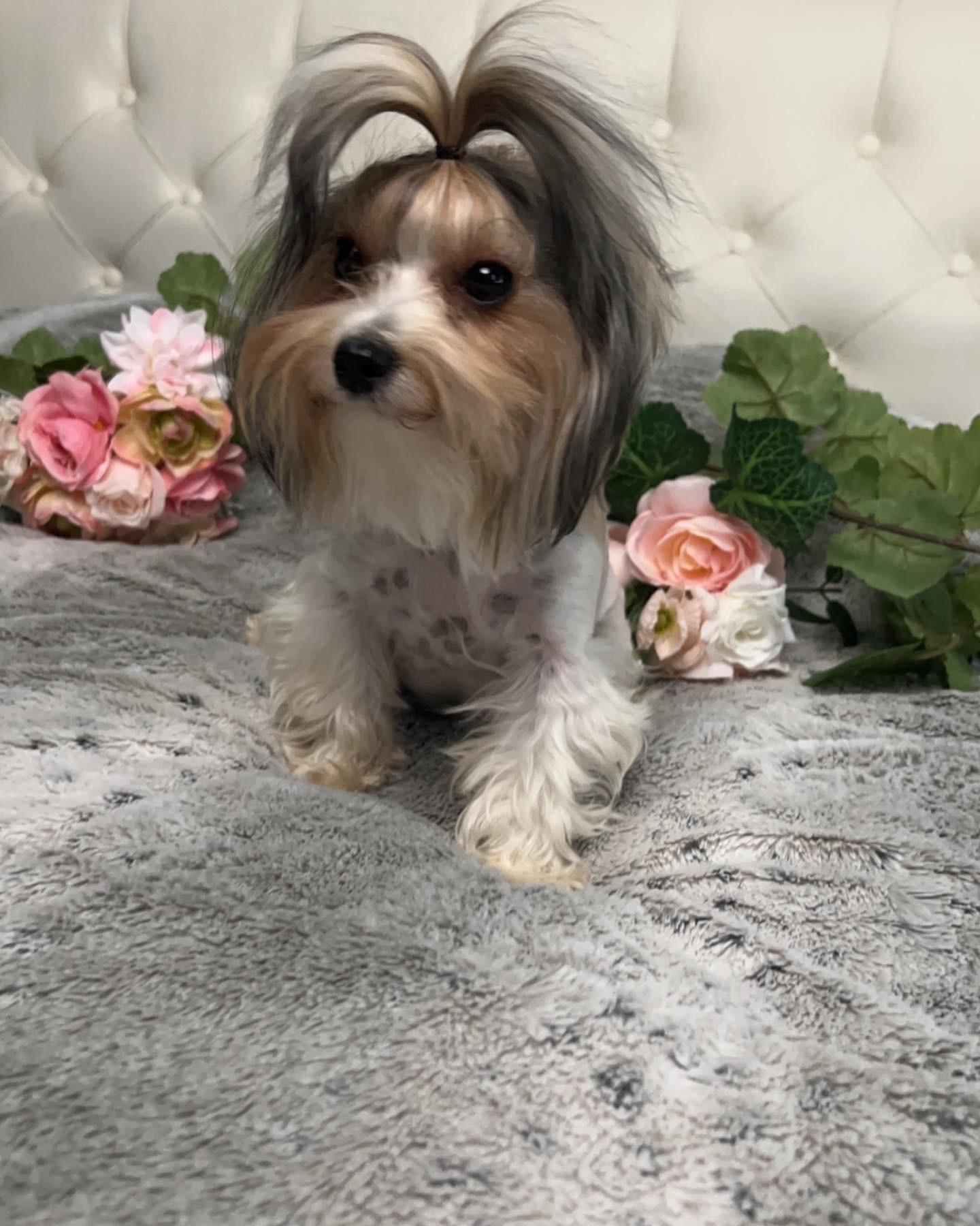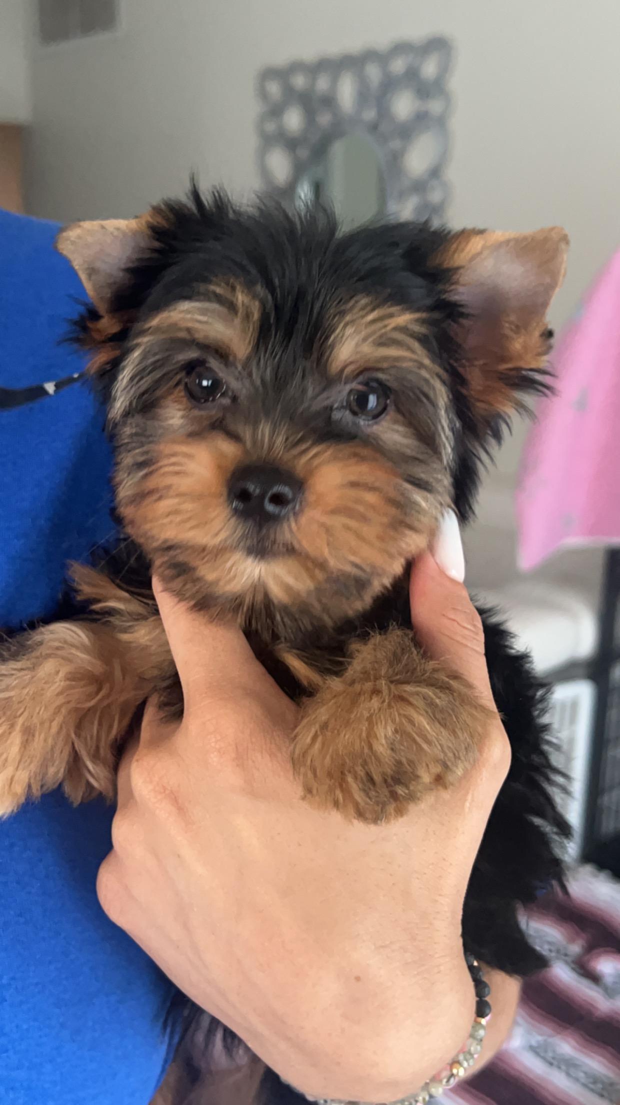 Meet our chocolate Yorkie diva! At around 4 pounds, she’s a tiny queen with a big personality—loving, but definitely not easy to impress. A true snob in the best way, she knows she’s special!