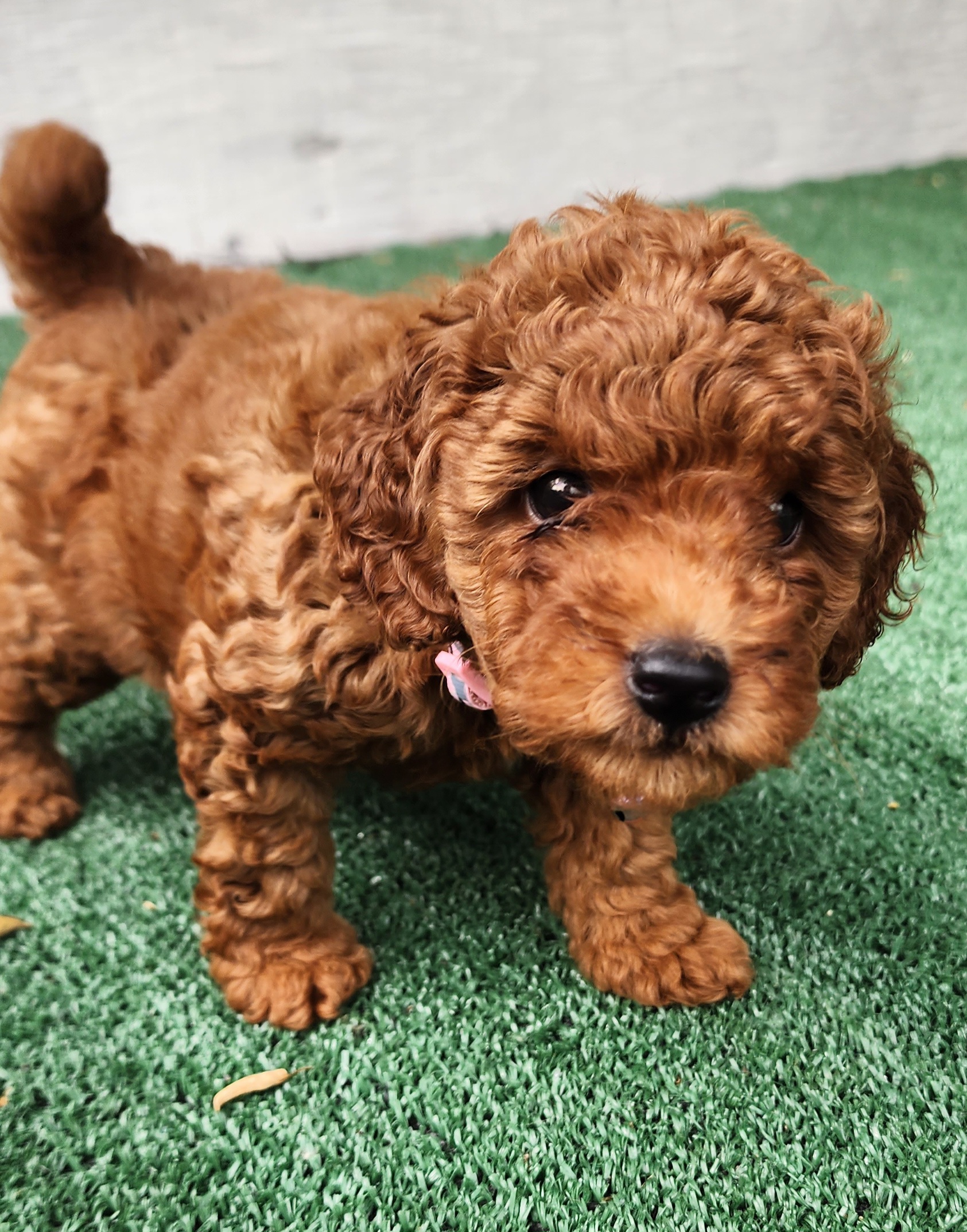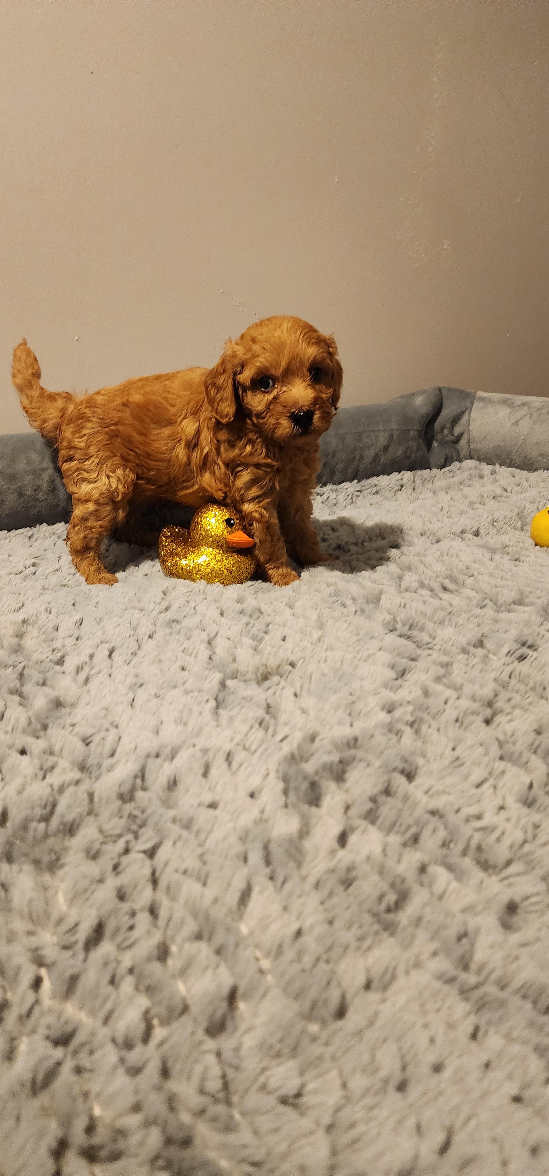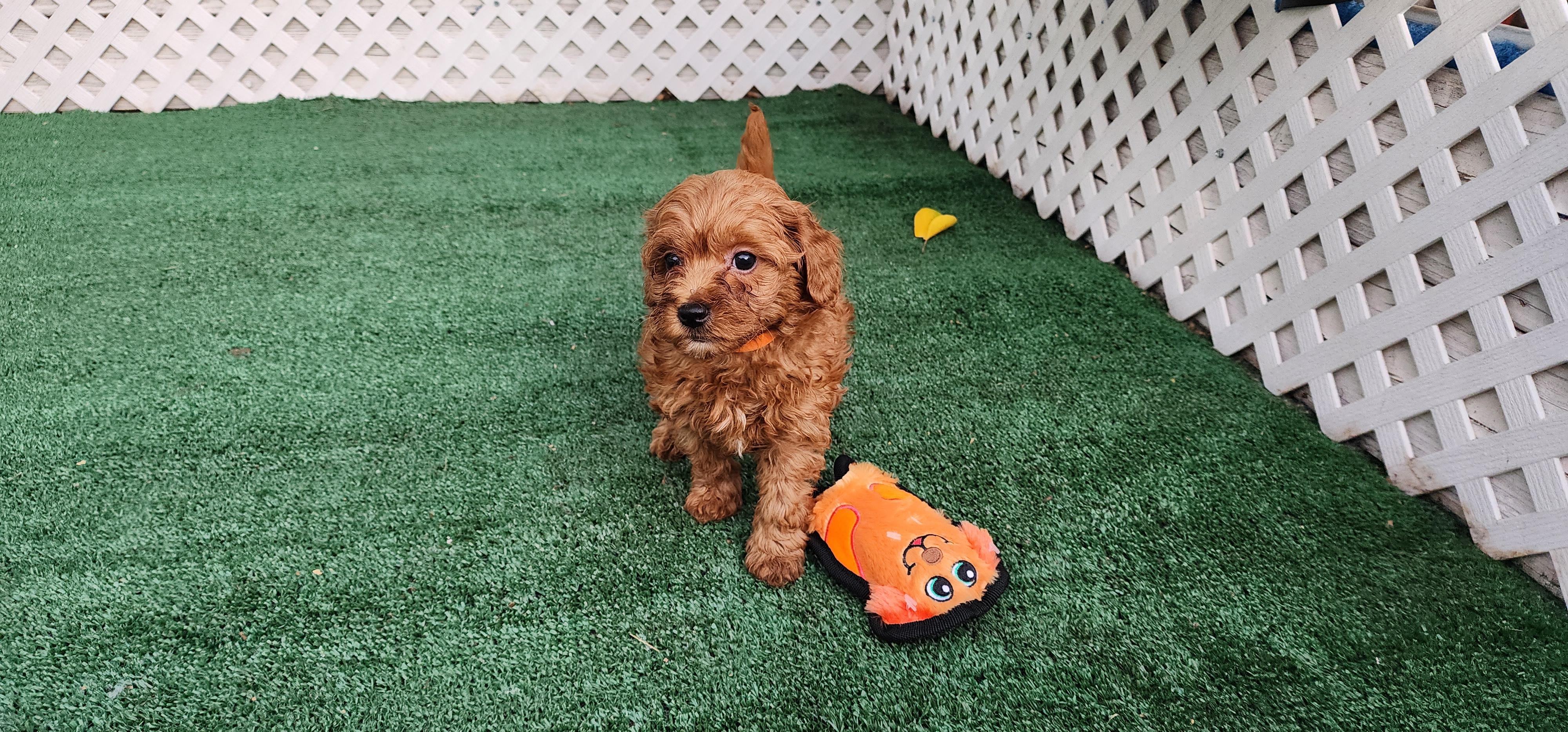 Copper Penny is a gentle natured Mini Goldendoodle who weighs about 22 pounds. She is very kind and loving with our grandchildren.