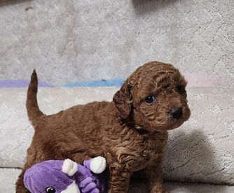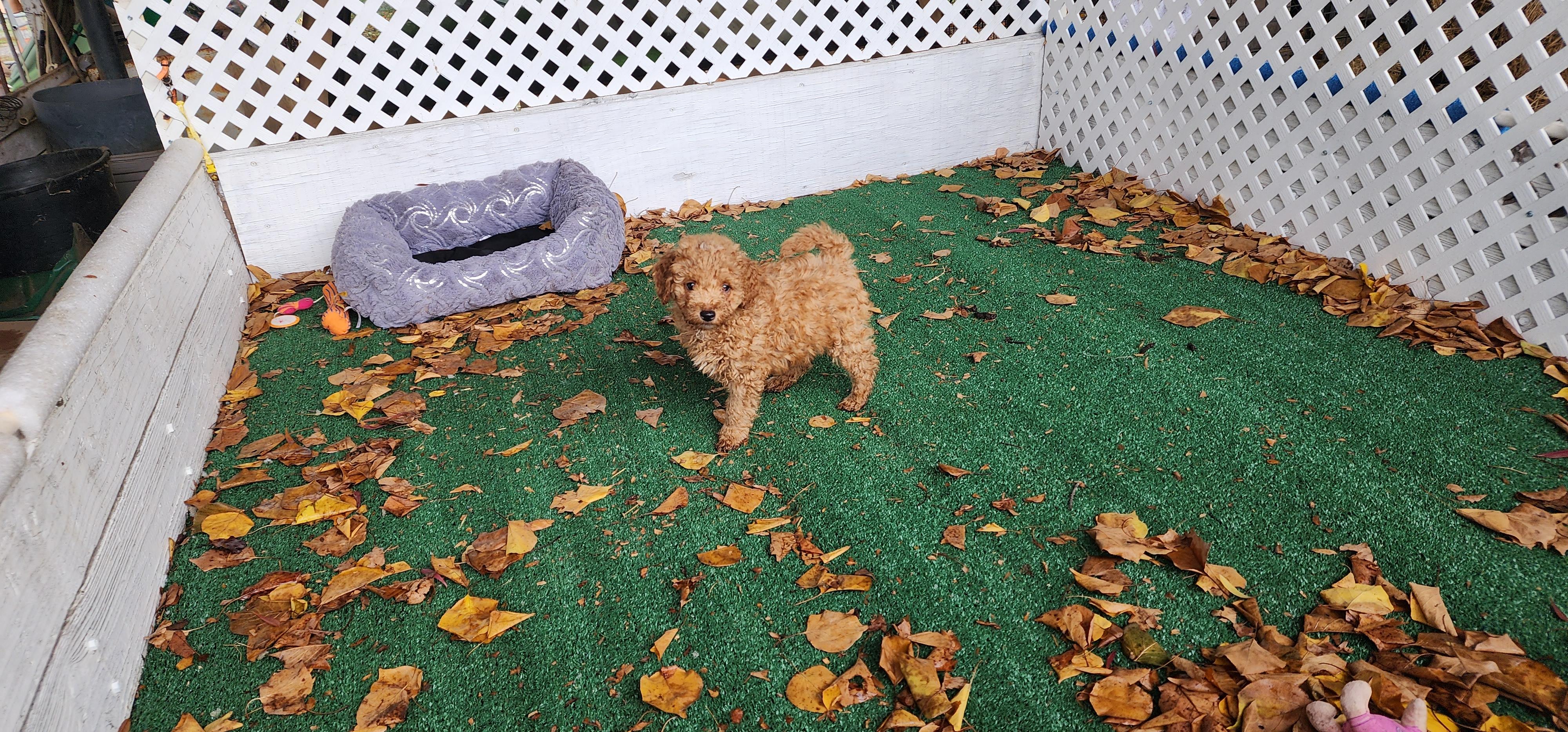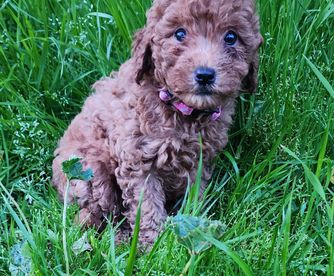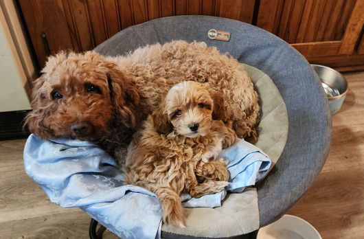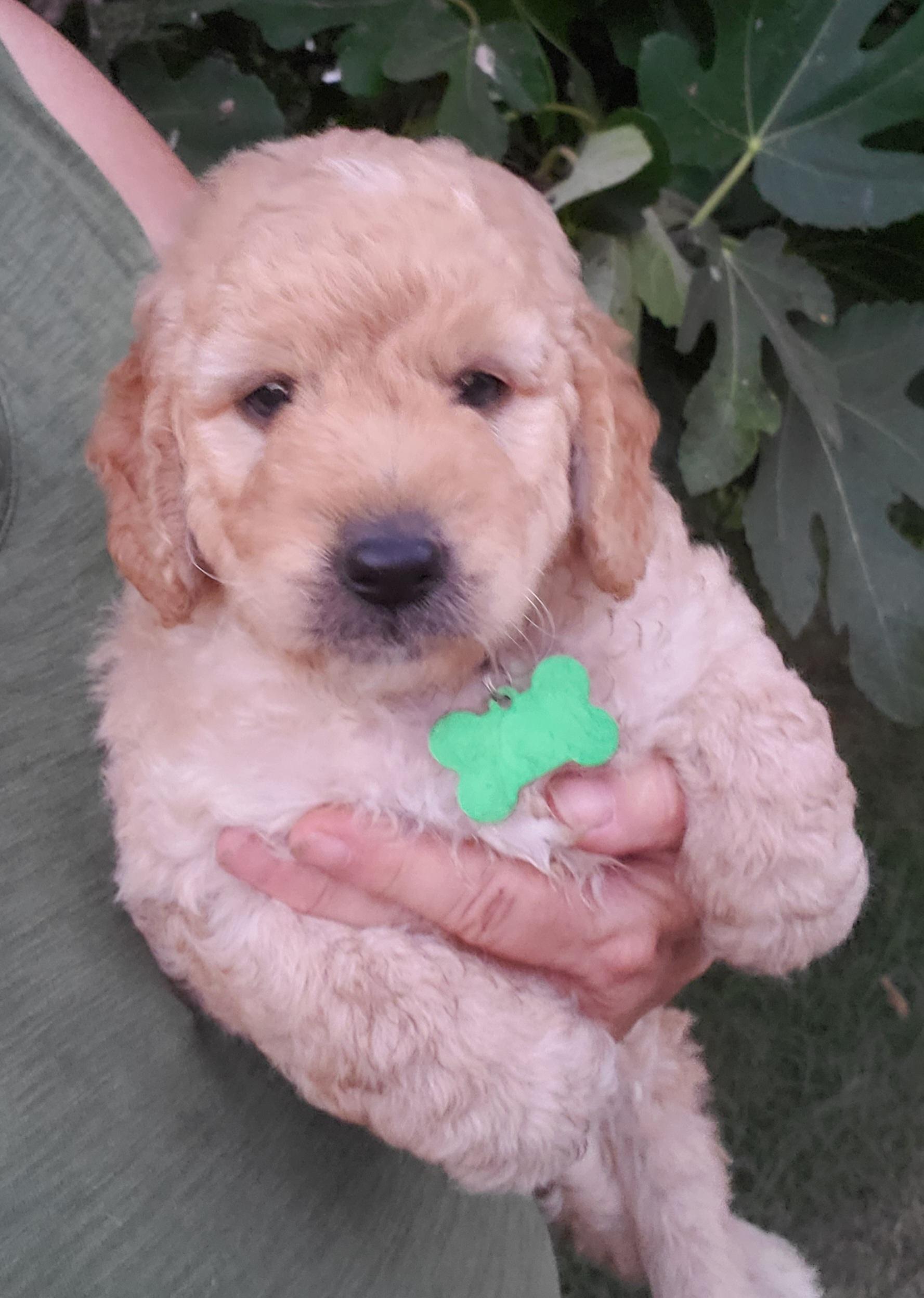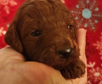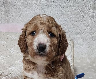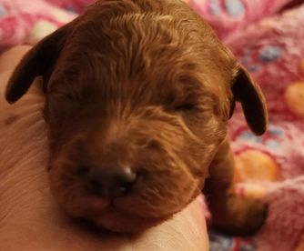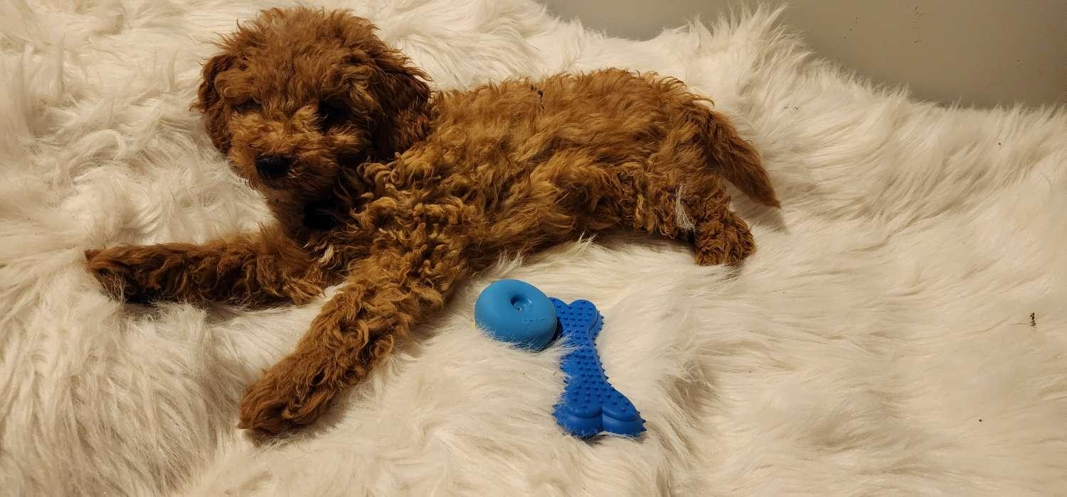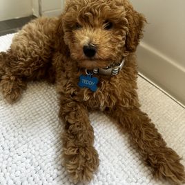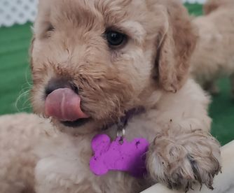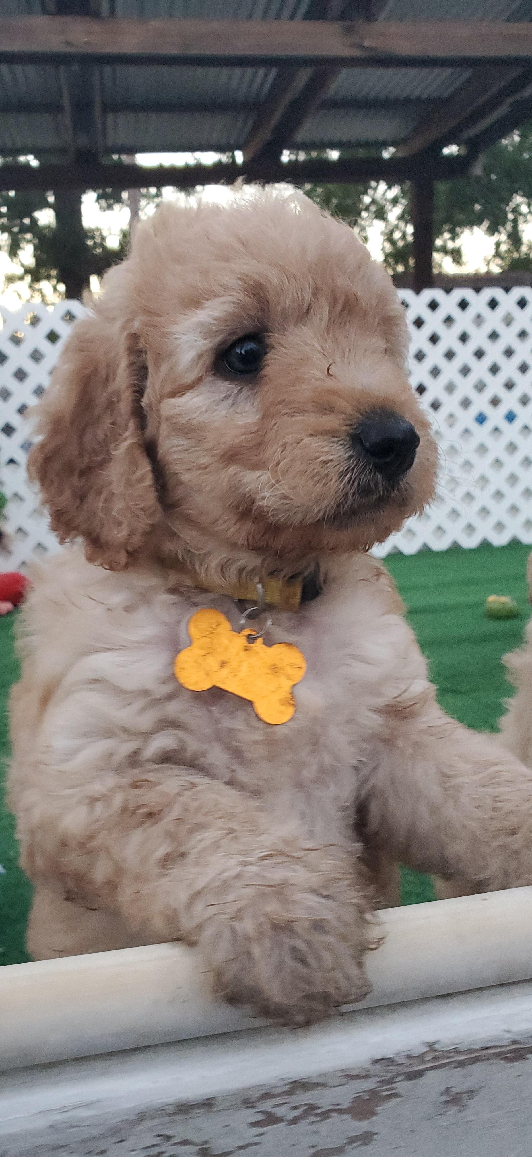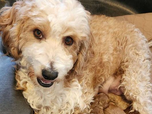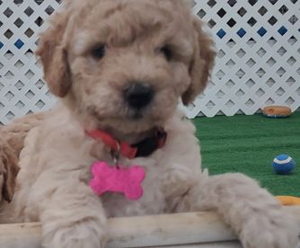 Wiggles is a mini Goldendoodle who weighs 15 pounds. She has an easy going temperament and loves children. She loves to be the loving lap dog of our home. She is a devoted and loving mother and has plenty of milk for her three puppies.
