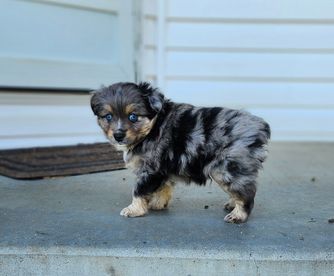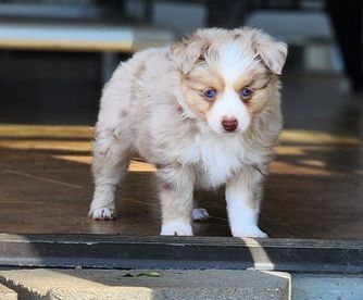 Our Toy Australian Shepherd puppies are blue merle. Miniature Australian Shepherd puppies include blue merle, red merle, red, and black. Colors will vary depending on the parent dogs.