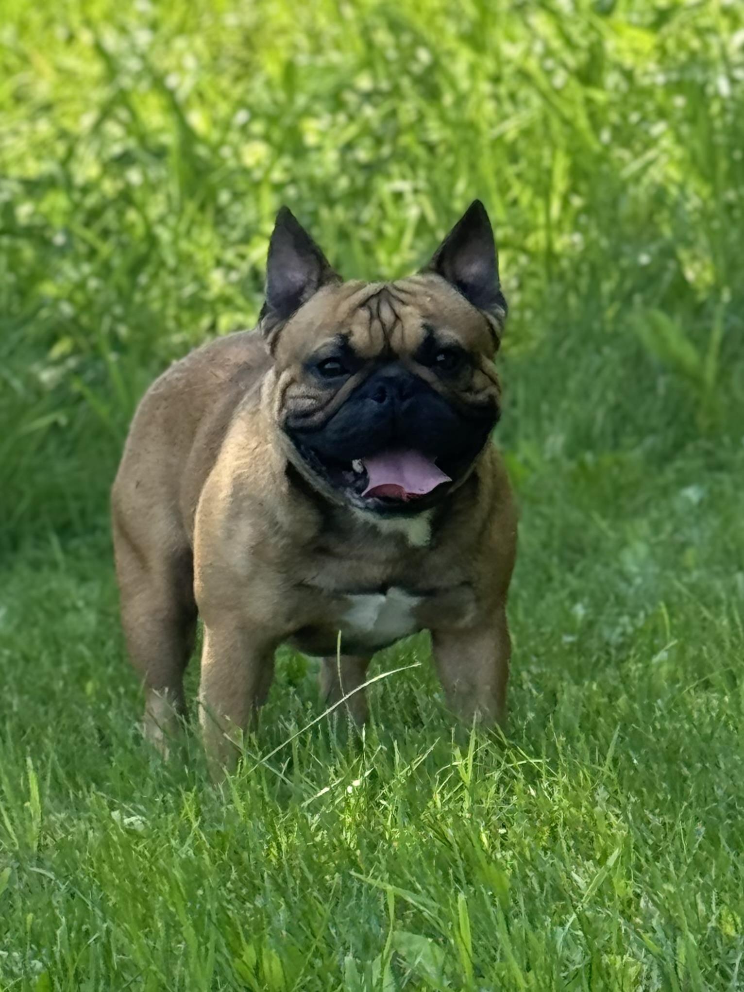 Dewey is a super handsome, solid, well built tradition fawn with a black mask. He is a happy go lucky boy, who is eager to please and very intelligent. Dewey makes a great companion, is well mannered and loved by everyone he meets. A beautiful healthy representation of the French Bulldog.