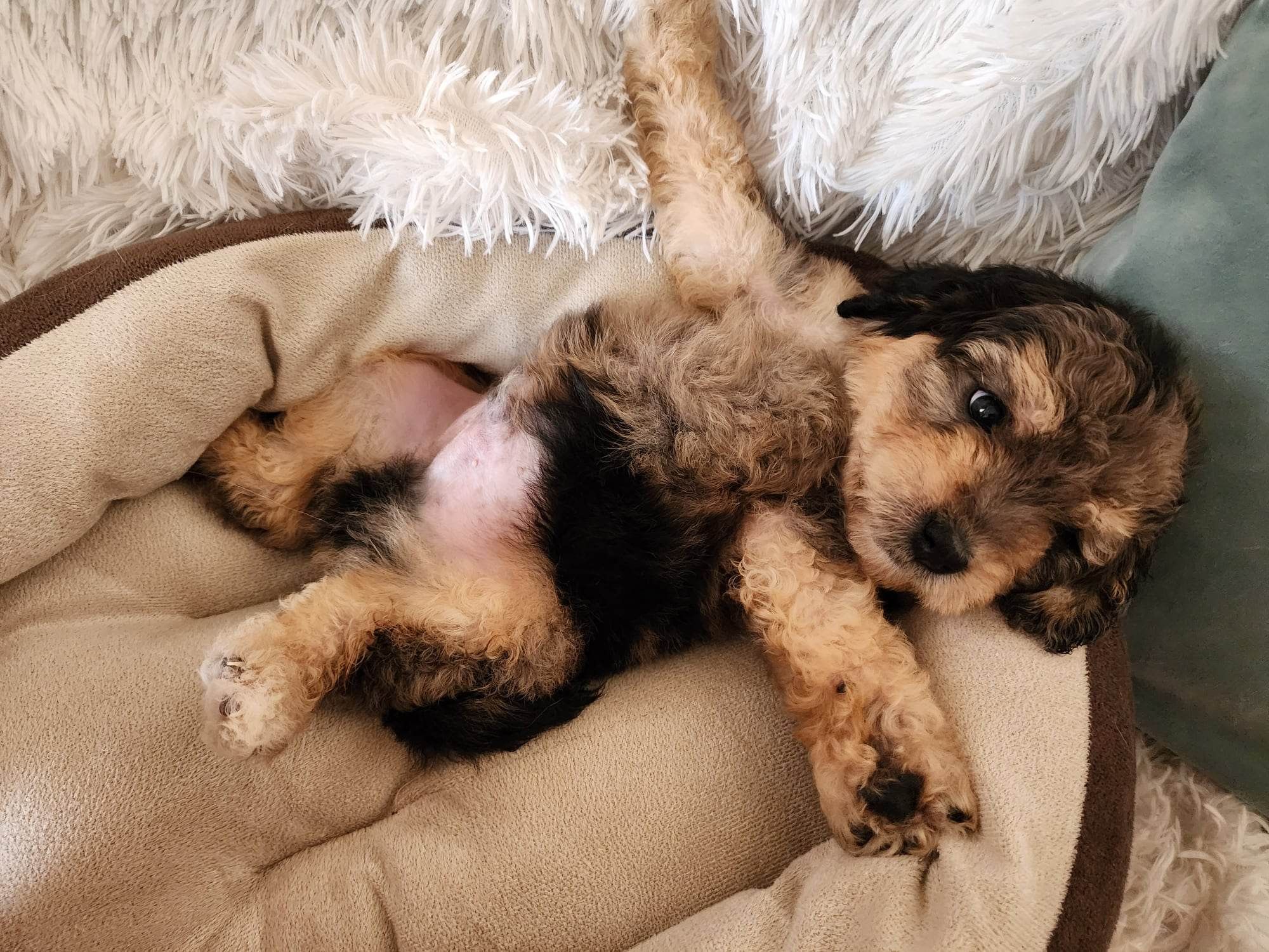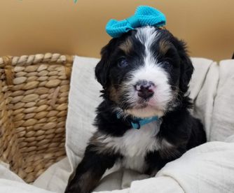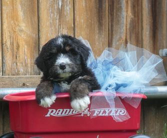 Our Aussiedoodle puppies include blue merle, red merle, black phantom, black and white, black tri-color, red phantom, and red tri-color. Goldendoodle puppies include cream, apricot, red, chocolate, black, phantom, merle, and parti. Bernedoodle puppies are tri-color. Colors will vary depending on the parent dogs.