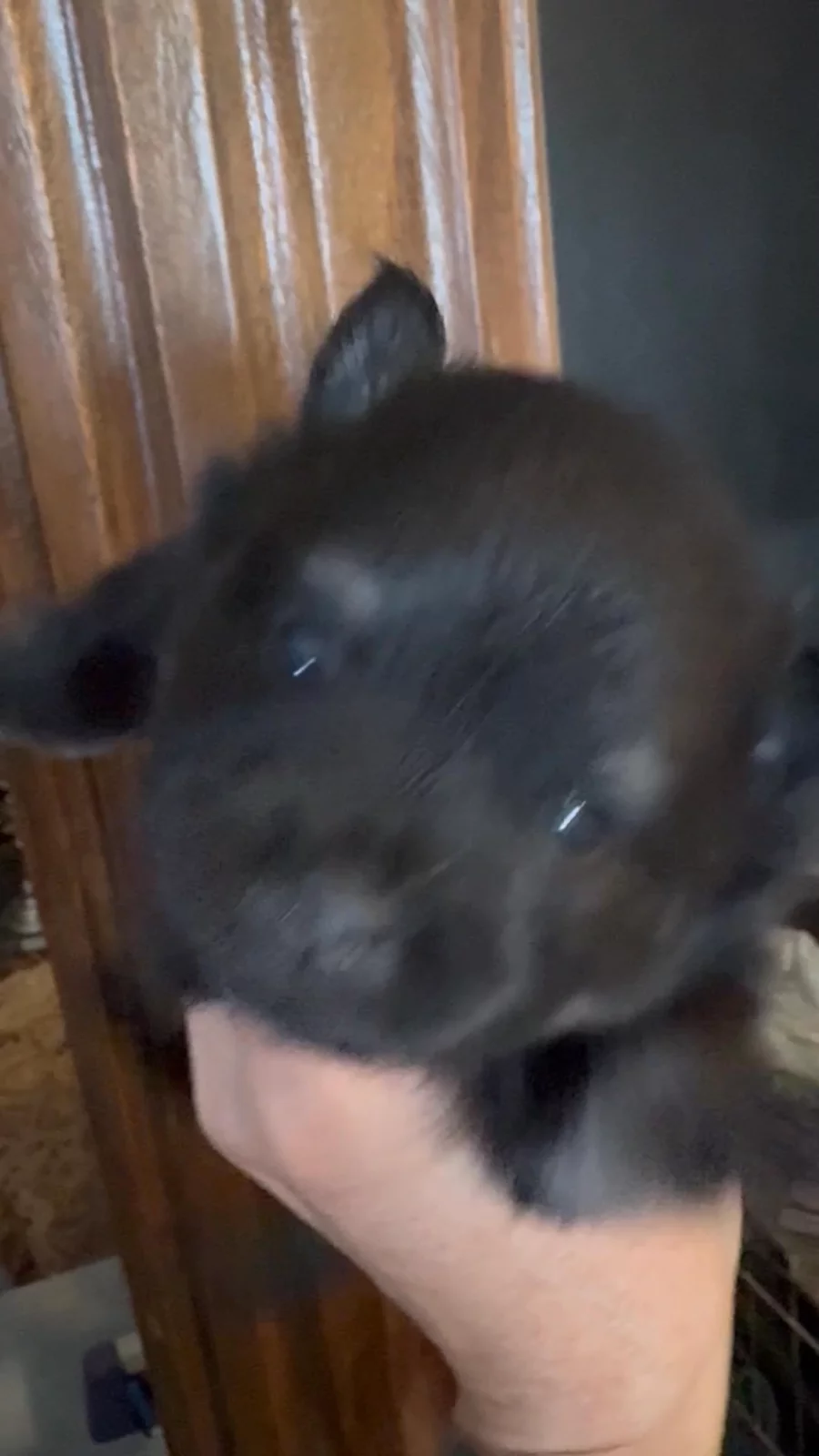 This is Marcus, our beautiful, black and tan boy about three weeks old. Available for deposit. He’s charting on the larger side between 7 and 8 pounds full grown. His tan markings will get brighter as he matures. He is a foxy face and will look similar to his mother.