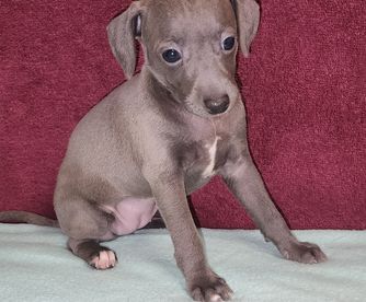 Our Greyhound puppies are black. Italian Greyhound puppies include fawn, blue fawn, and blue. Colors will vary depending on the parent dogs.