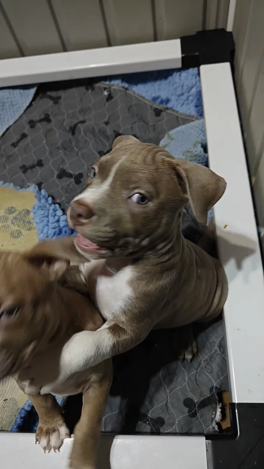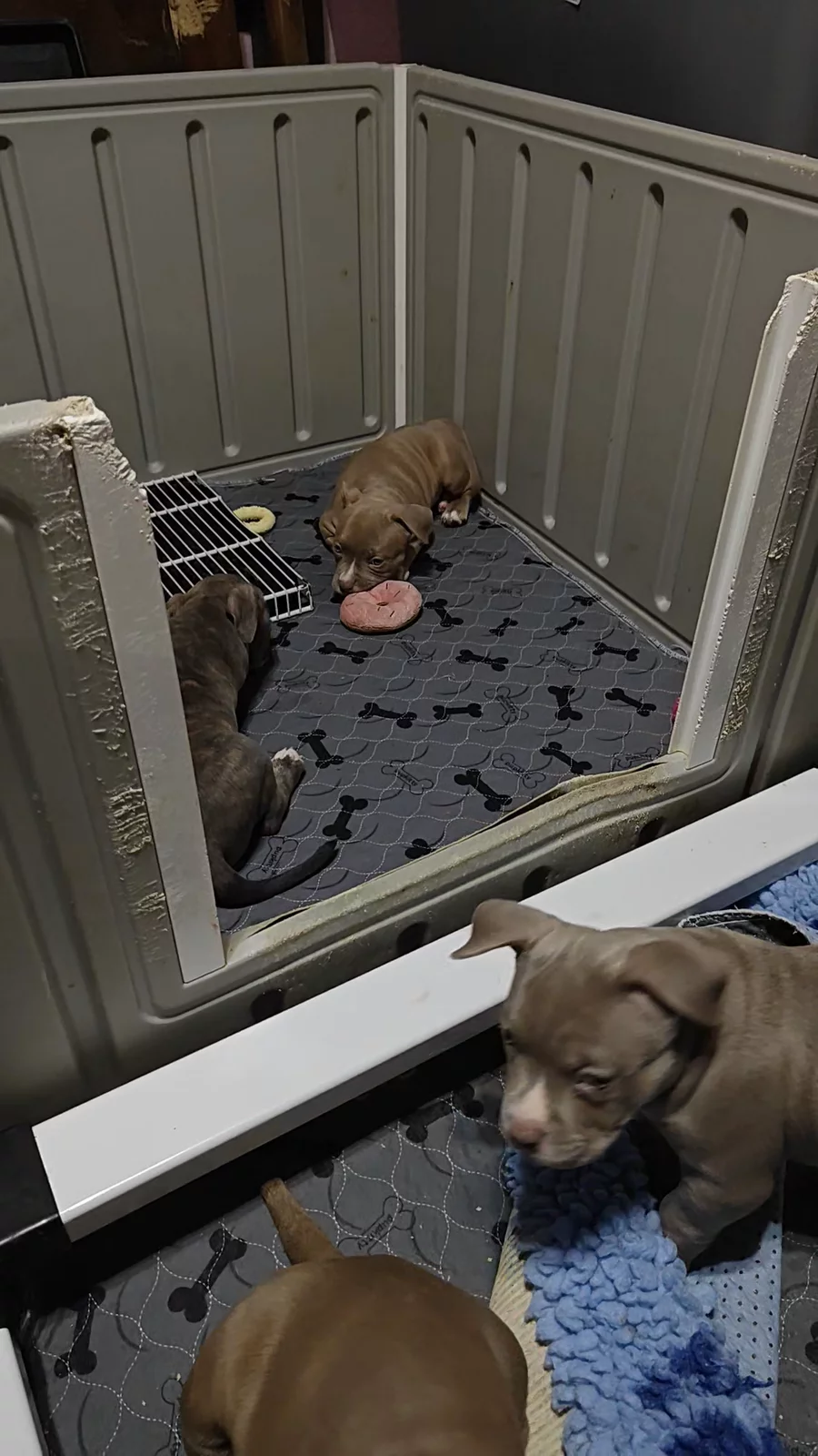 Puppies are scheduled for first shots on Thursday 2/26. They will be 8 weeks on Friday.