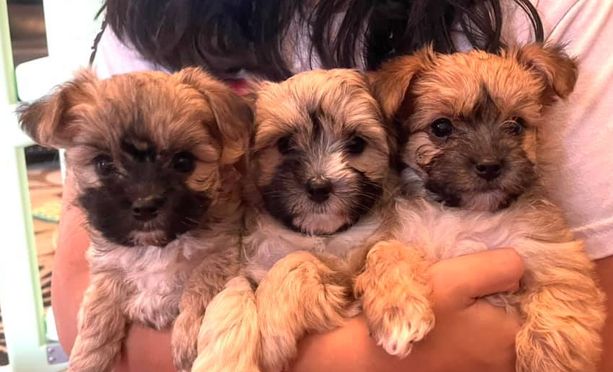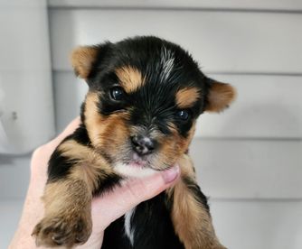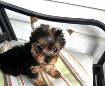 Our Morkie puppies include black & tan tri-color, white and tan, and black and gold. Colors will vary depending on the parent dogs.