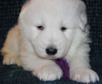 Pure white standard length coat with jet black nose and lip pigment. Dark eyes and excellent structure.