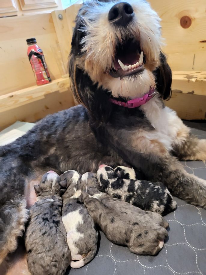 Our Bernedoodle puppies include red, brown, black and white, tri-color, phantom, blue merle, and merle. Goldendoodle puppies include apricot, red, chocolate, black, phantom, and parti. Colors will vary depending on the parent dogs.