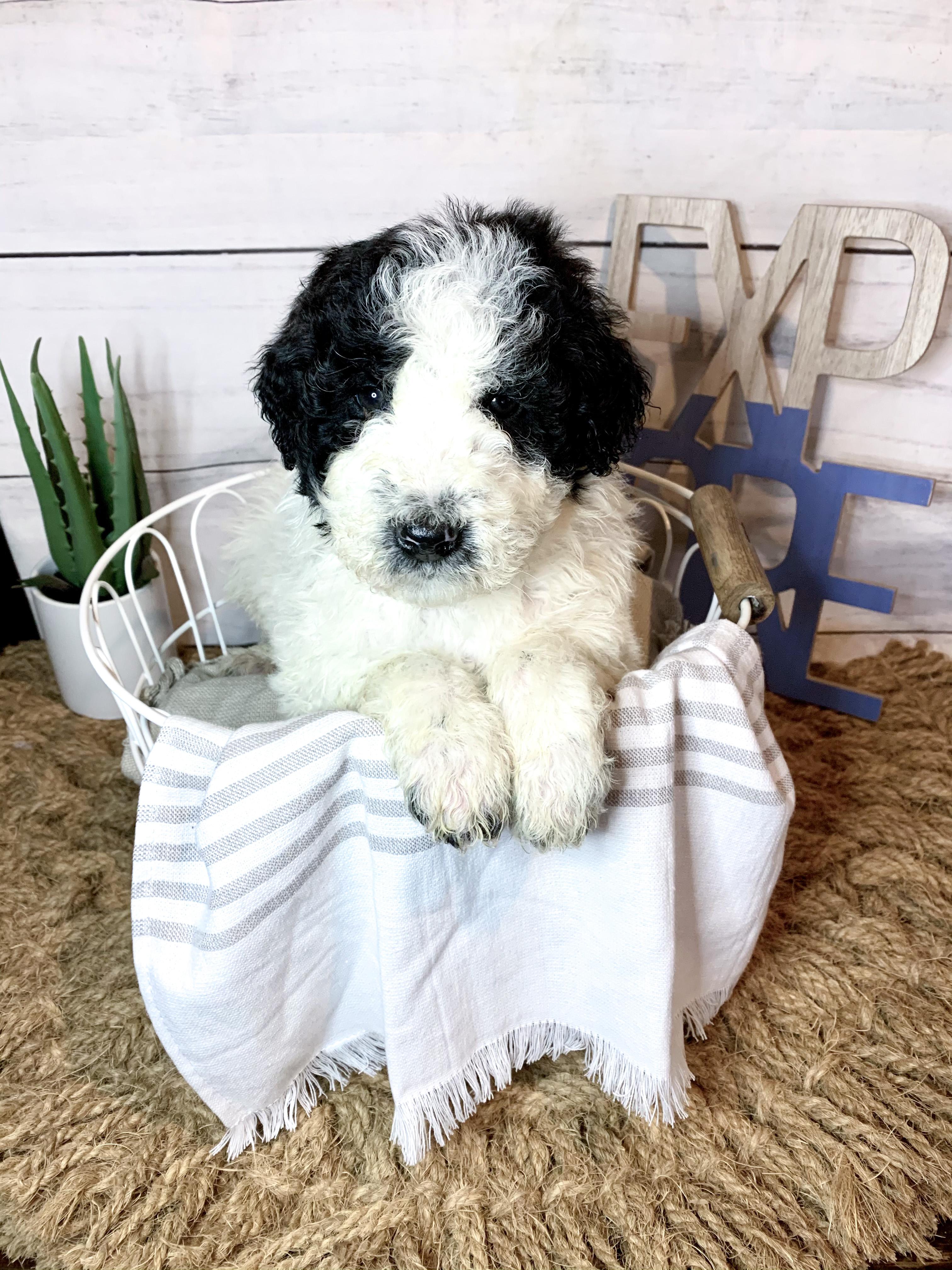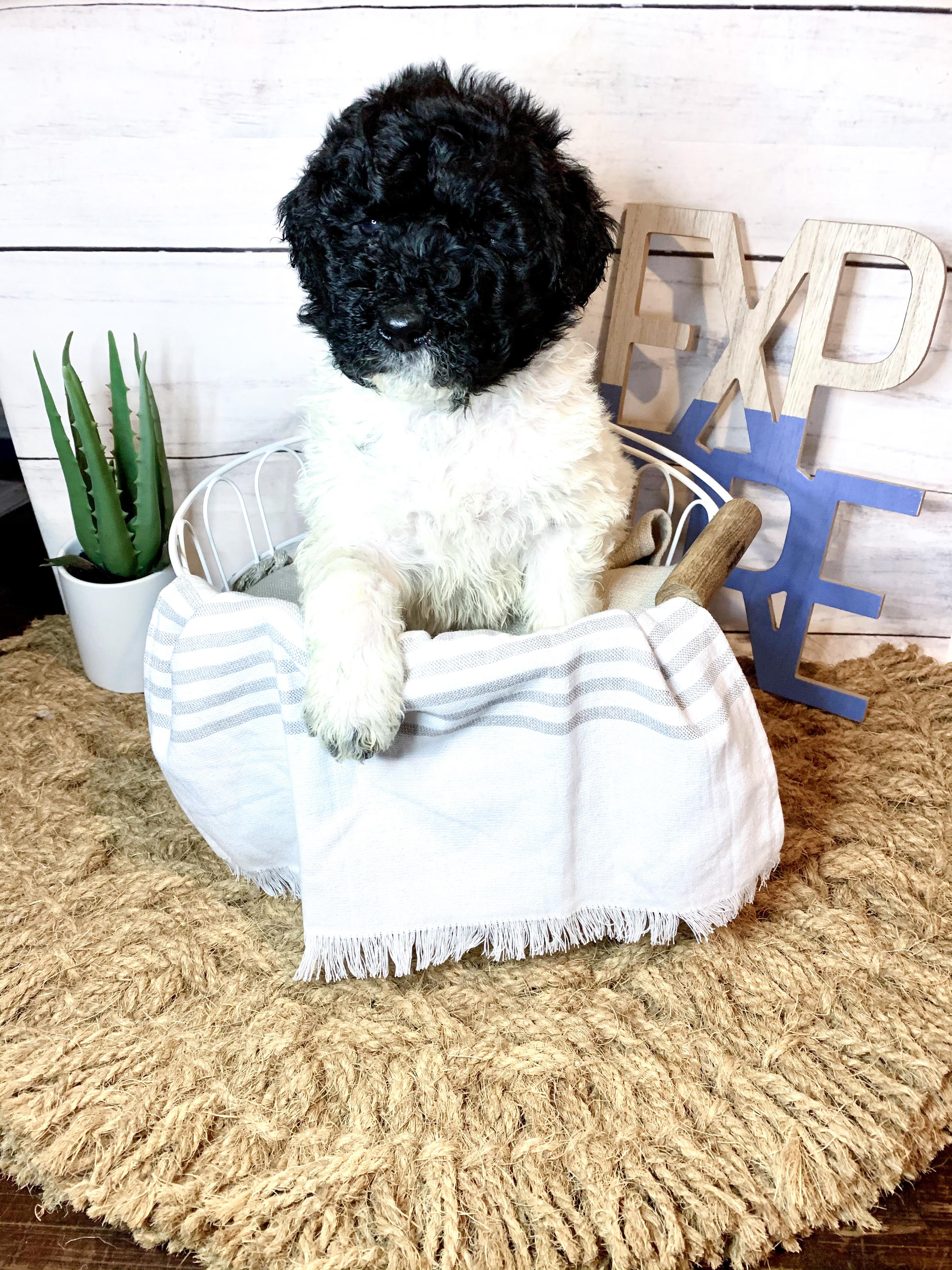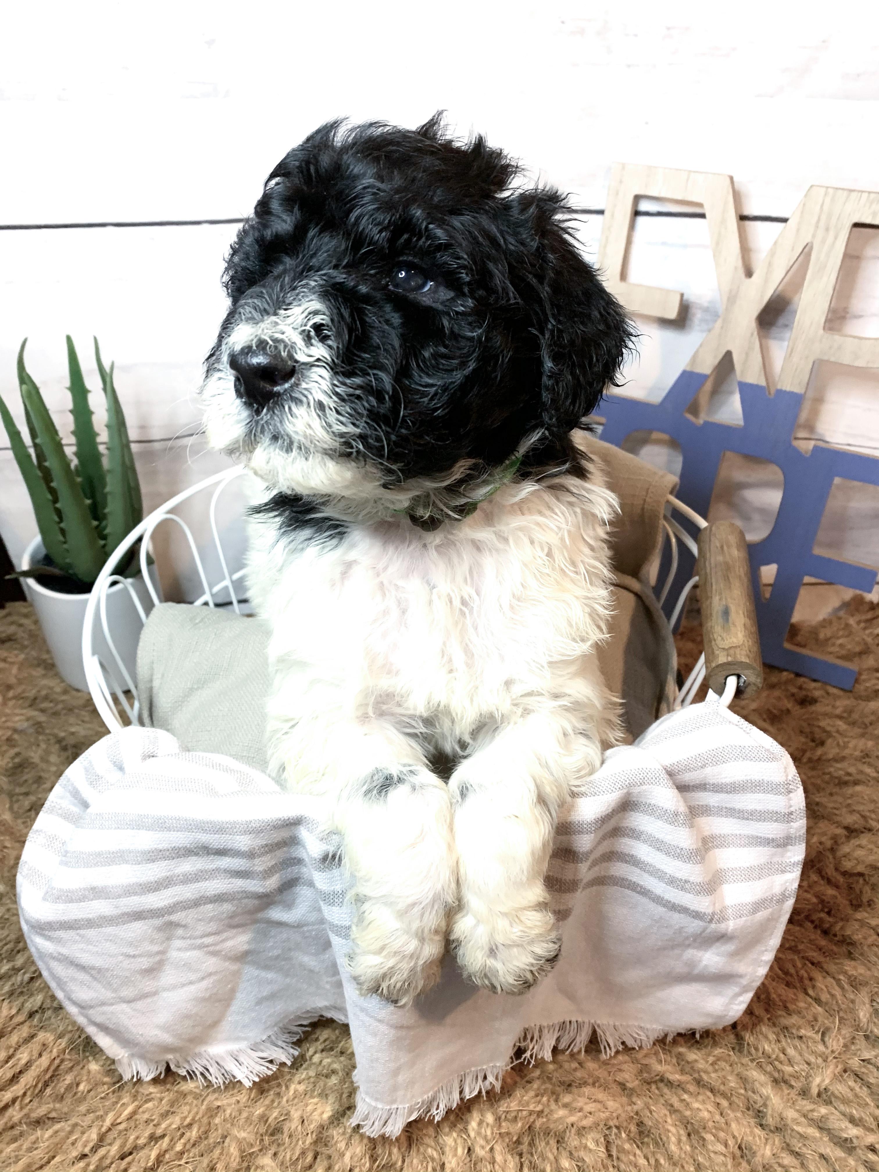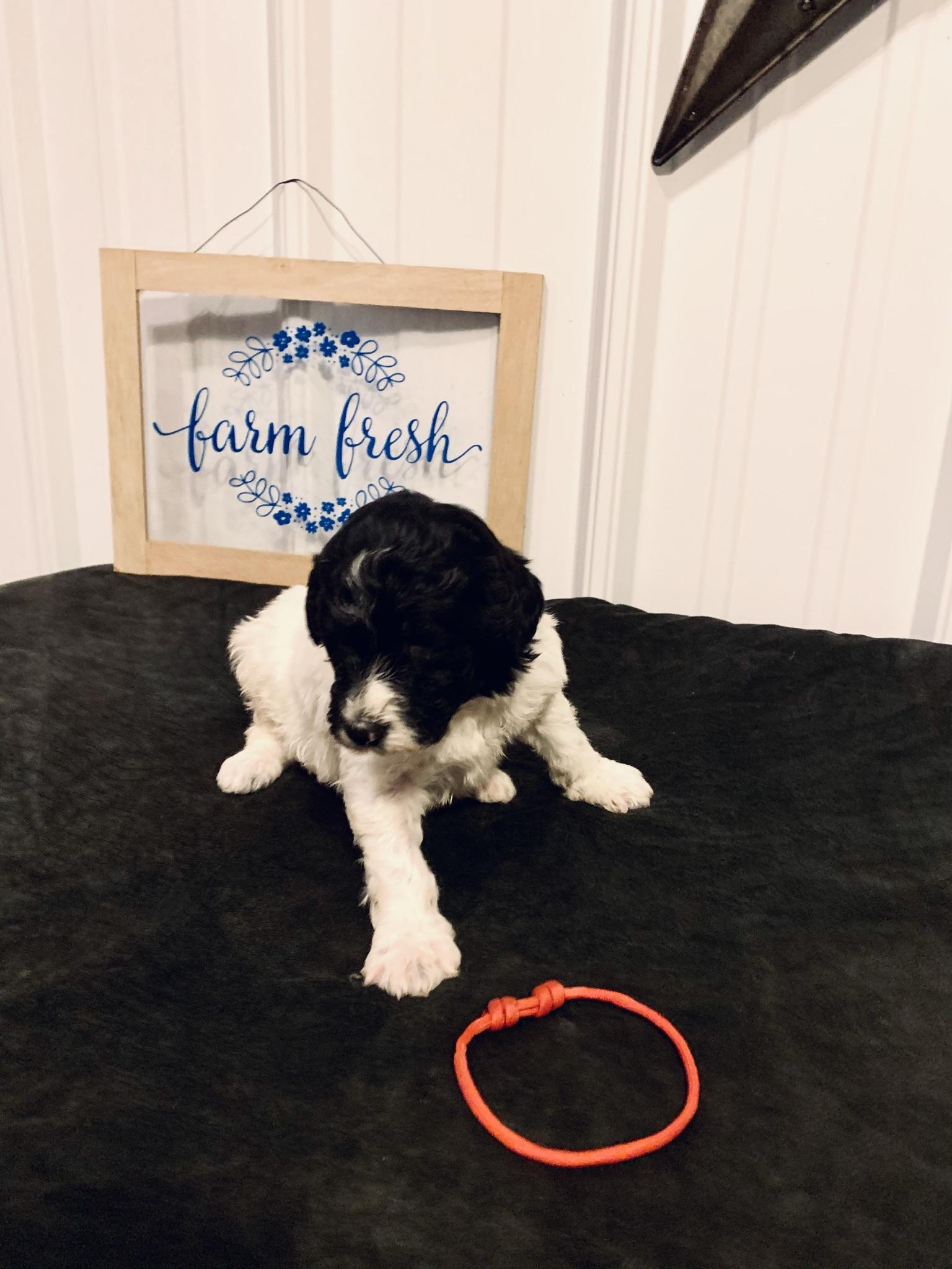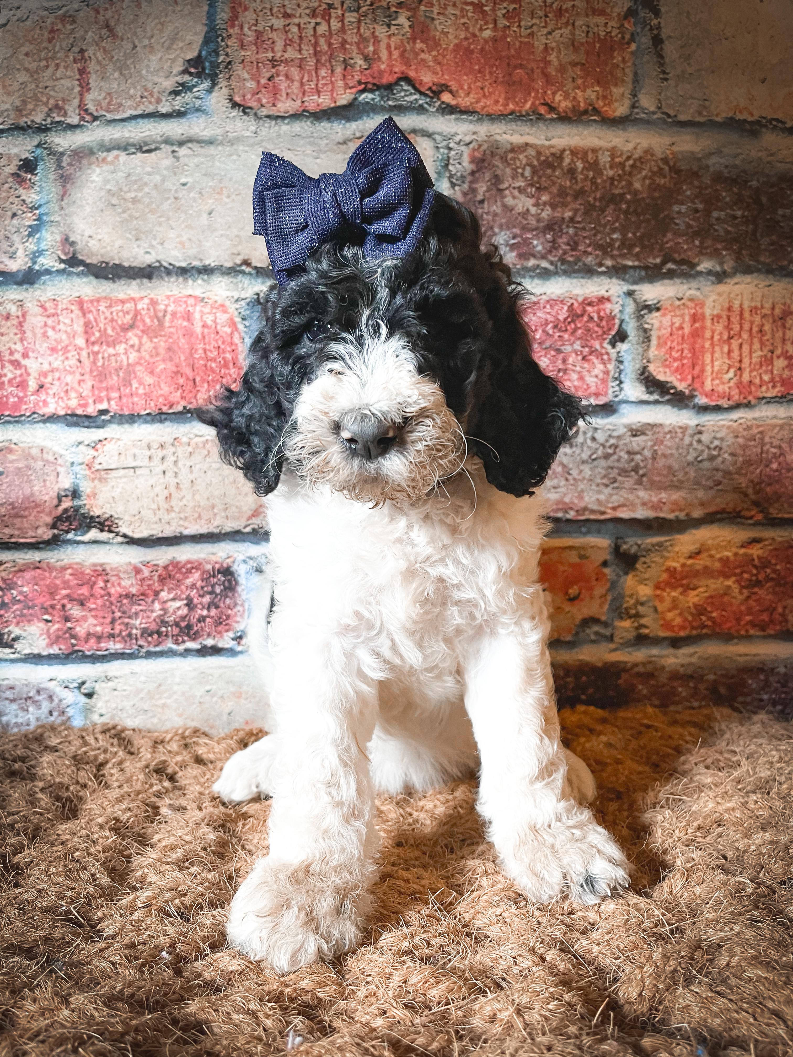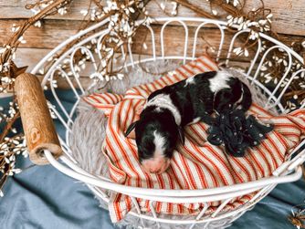 Our Bernedoodle puppies include sable and tri-color. Bordoodle puppies include white ticked, black, and white and black. Poodle puppies include sable, black, blue, red, silver, parti, and phantom. Colors will vary depending on the parent dogs.