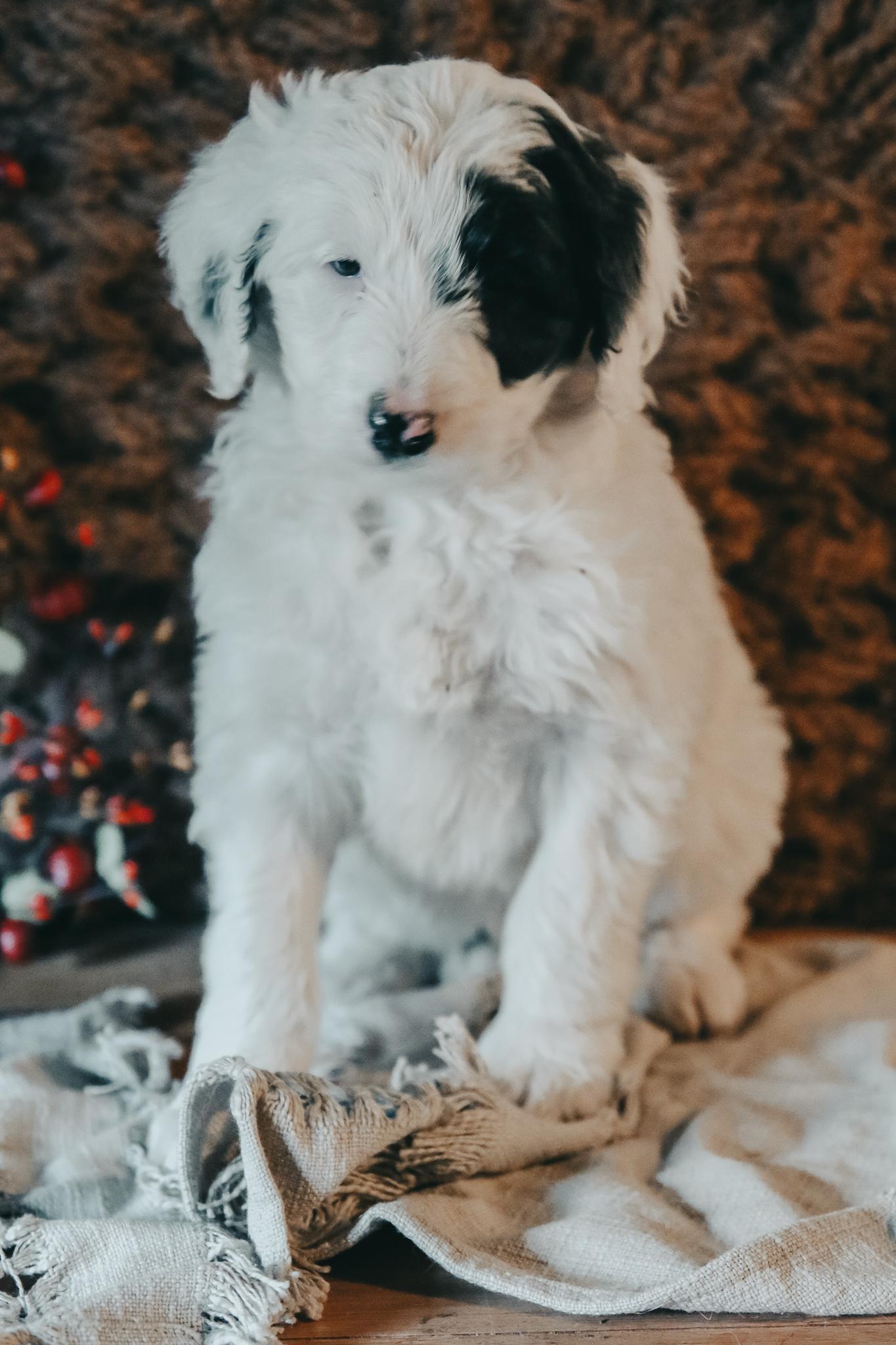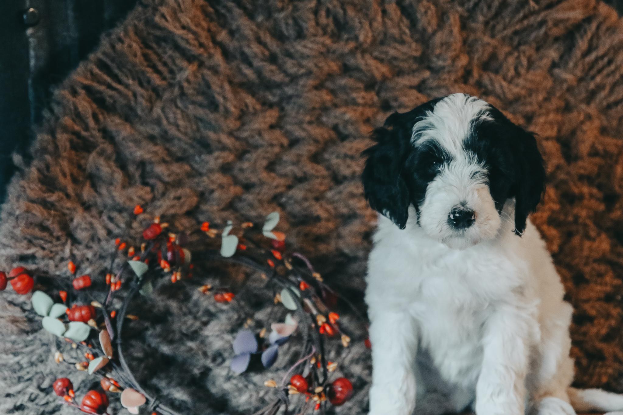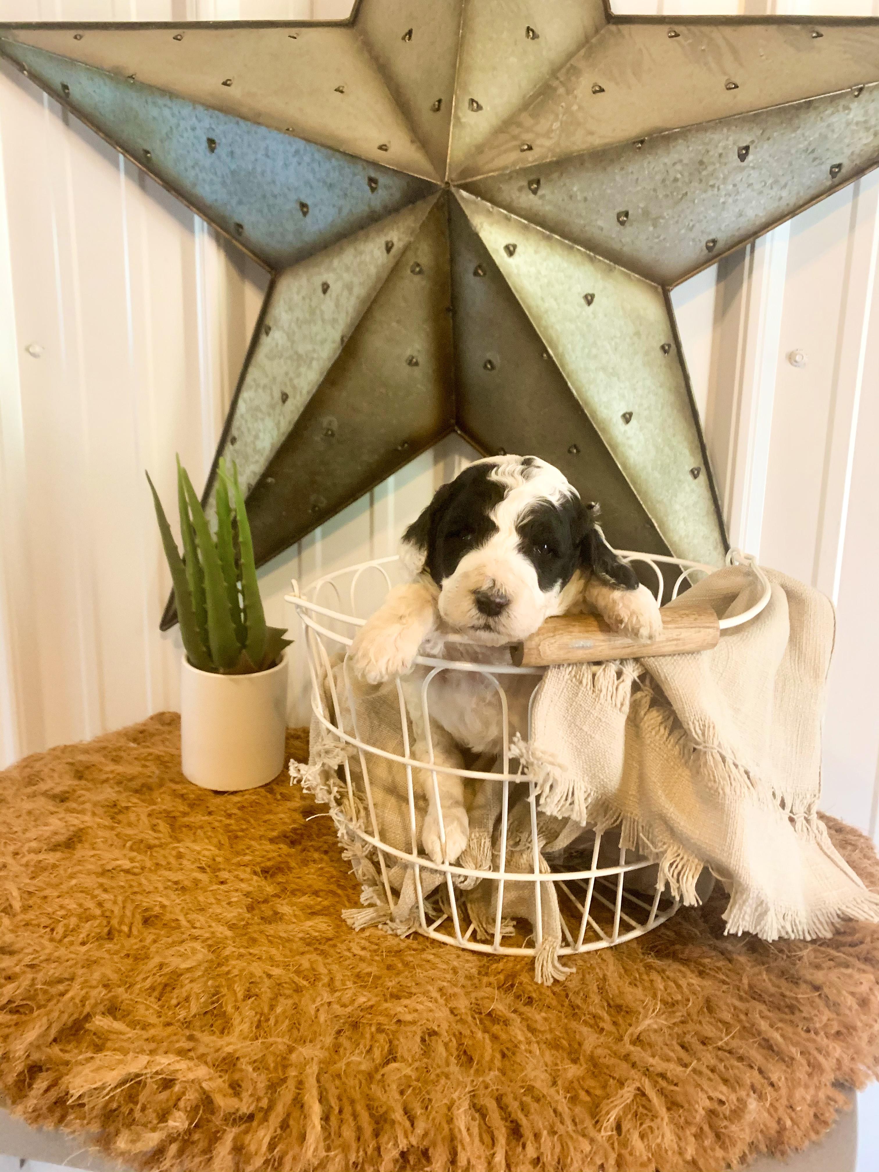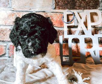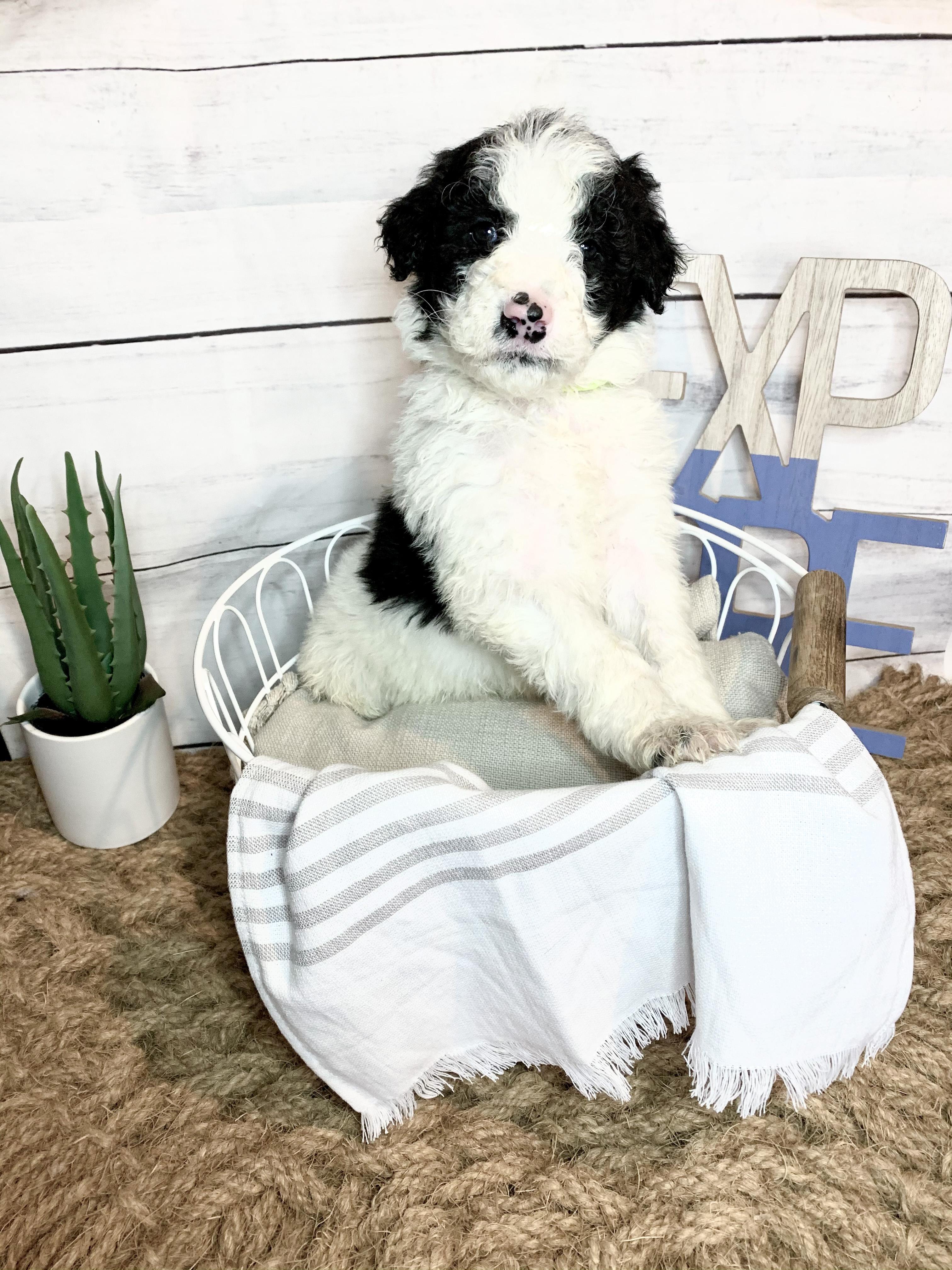 Our Bernedoodle puppies include sable and tri-color. Bordoodle puppies include white ticked, black, and white and black. Poodle puppies include sable, black, blue, red, silver, parti, and phantom. Colors will vary depending on the parent dogs.