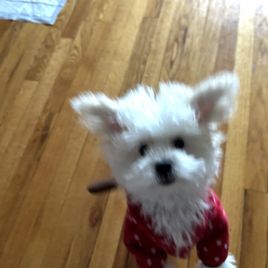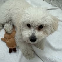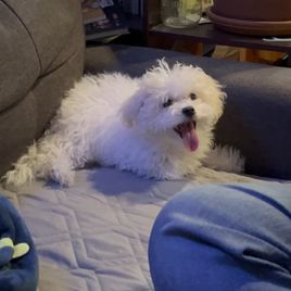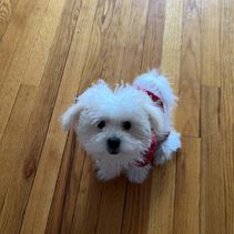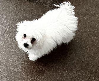 Luca is a sweet, happy, purebred Bolognese boy. His tail is always wagging. He loves to dance on his back legs (for treats). He weighs about 7.5 pounds. He loves to run and chase the girls around the house or in the yard. If the girls aren't interested in running, he will play with the cat.