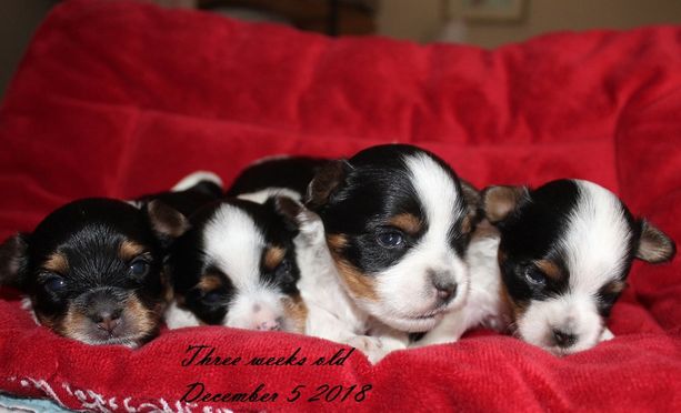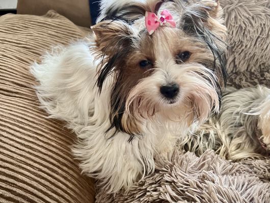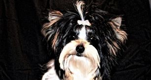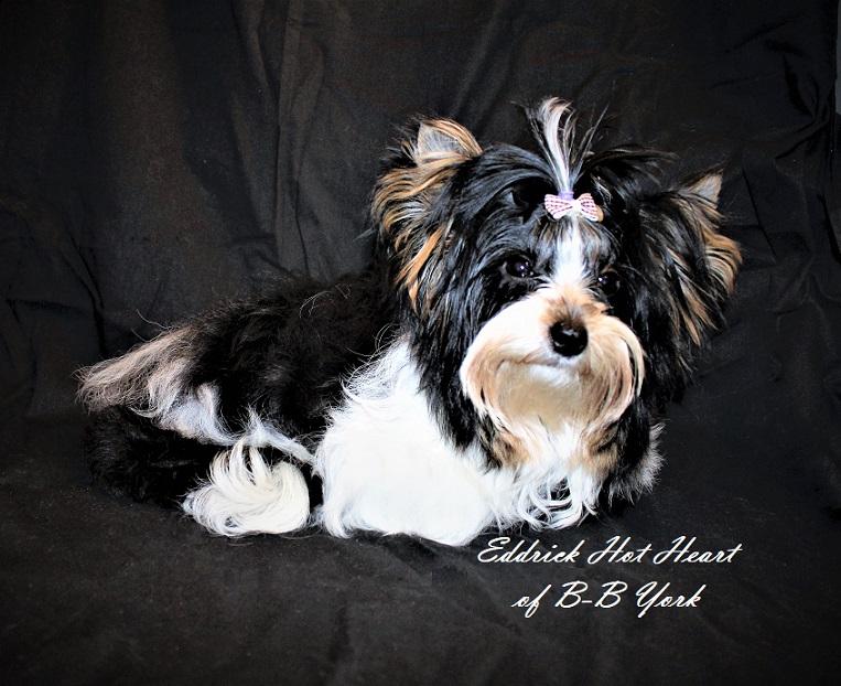 Biewer Terrier Yorkie, Black/White/ Gold. Champion sired. Up ears long tail, Short legs small body.