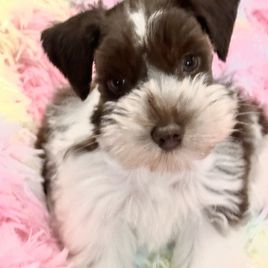 Here is what Deeva's puppies have to say! We are completely adorable! We love playing and wrestling, and we're so full of energy. But then we like to lay down and cuddle. We are now 12 weeks old. Where are you? We we are ready for you to take us to our permanent home. My brother is a liver parti, oooh liver doesn't sound so pretty, but really it's a rich chocolate color and he's beautiful! I, on the other hand, am black with a pretty white patch on my chest. They say my color might change a bit, but who knows? I'm going to be beautiful no matter what colors I end up being! My tiny little brother is like me and could end up being a dark salt & pepper or even black and silver. But he's about the size of a peanut 🥜, well maybe a little bigger than a peanut, but he's going to be a tiny tot. I'm supposed to be a toy size just like my liver parti brother. That means I'll probably be between 8 and 10 pounds. If you are interested in any of us, you better hurry and pick one of us out!