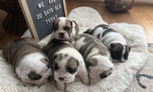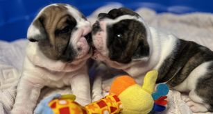 Our puppies include red and white, brindle, and fawn and white. Colors will vary depending on the parent dogs.