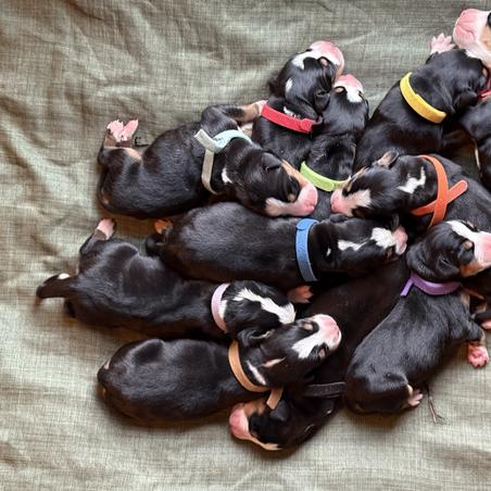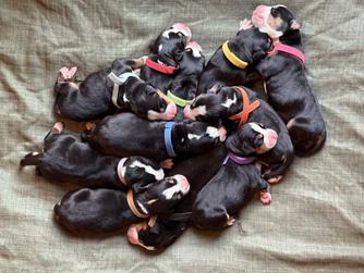 Our puppies are black, white and red. Colors will vary depending on the parent dogs.