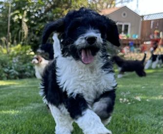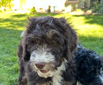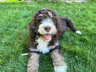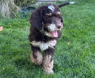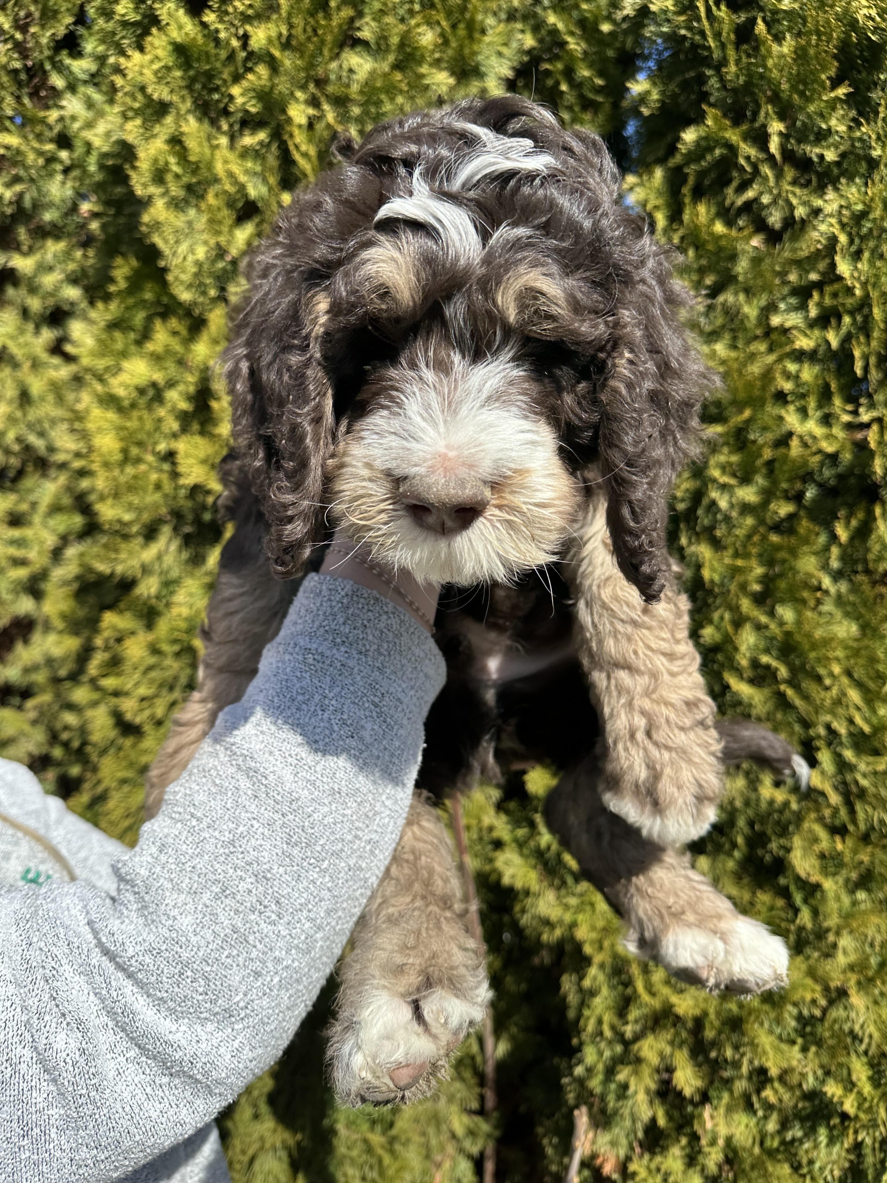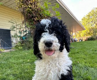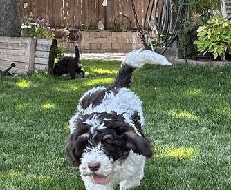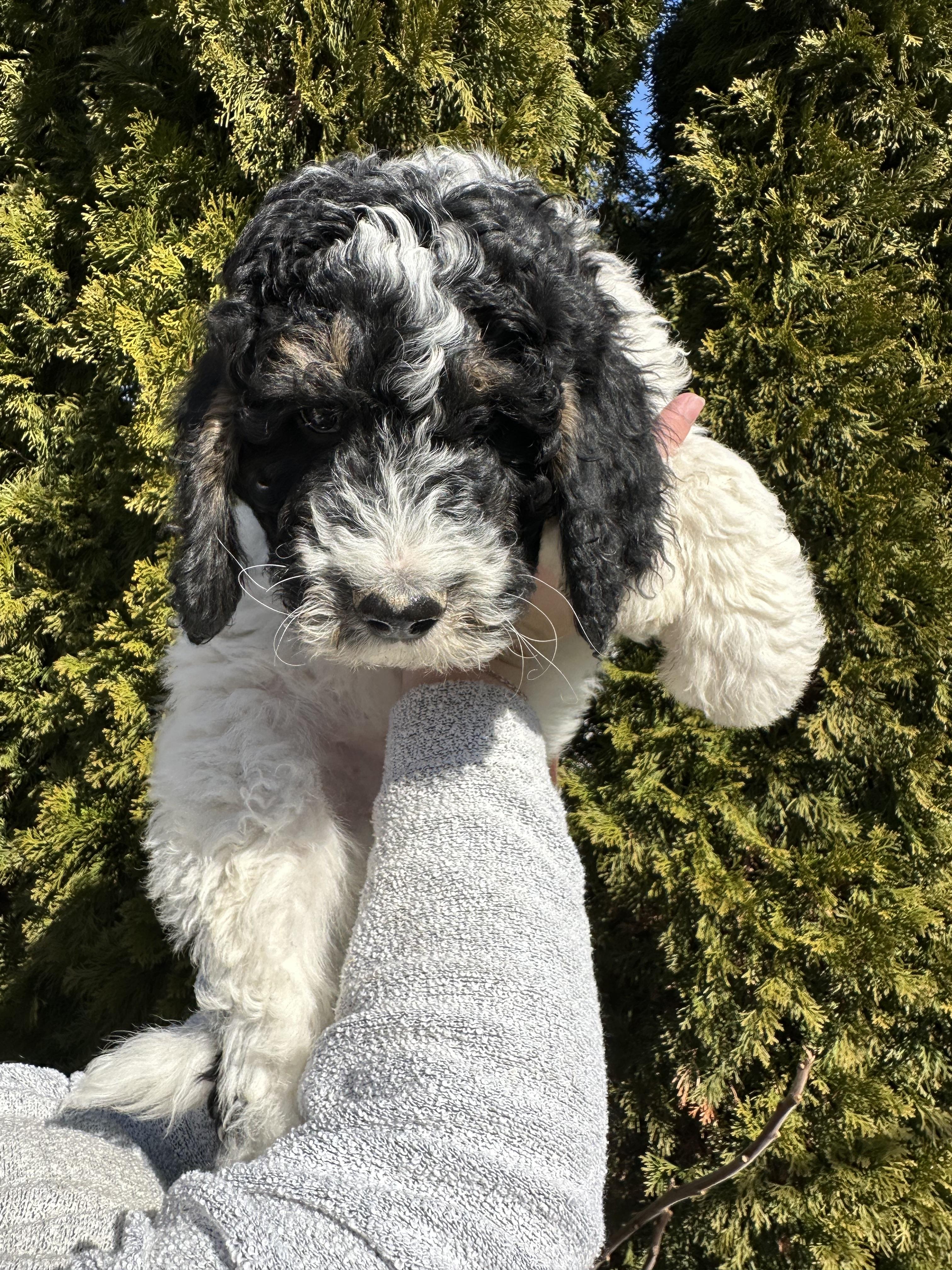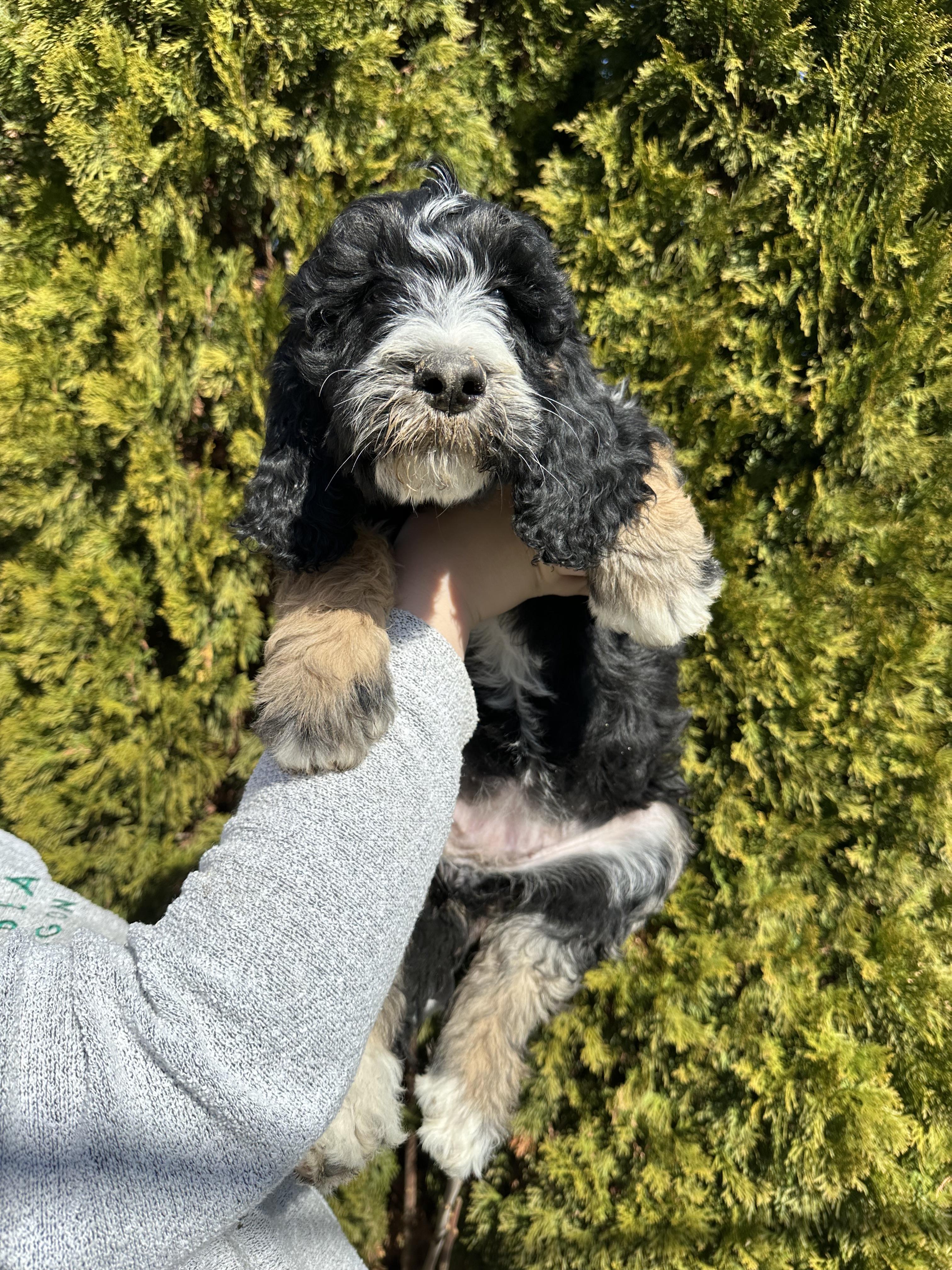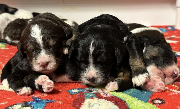 Our Bernedoodle puppies include black and white, tri-color, and phantom. Poodle puppies include black, brown, parti, and phantom. Colors will vary depending on the parent dogs.