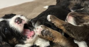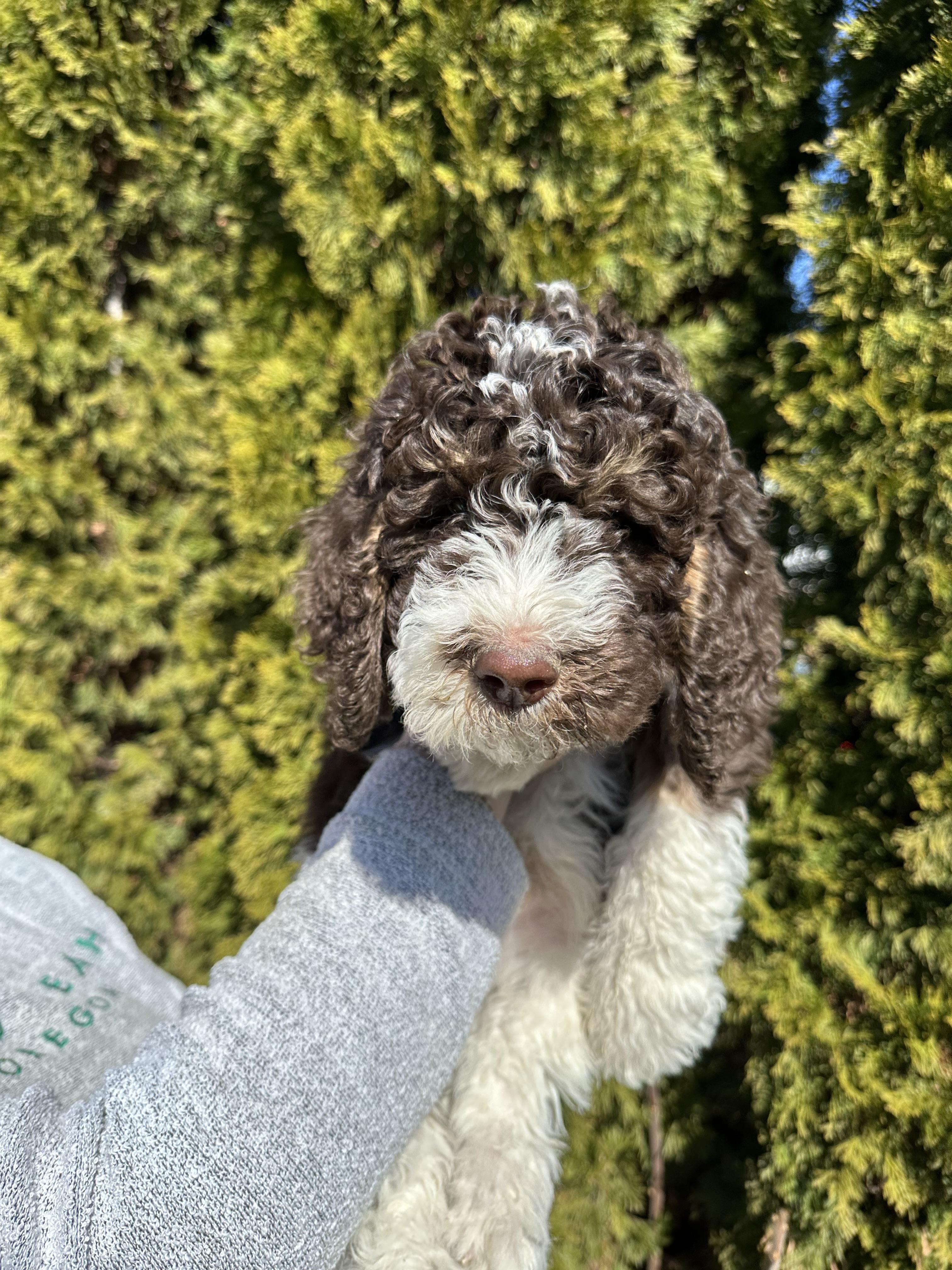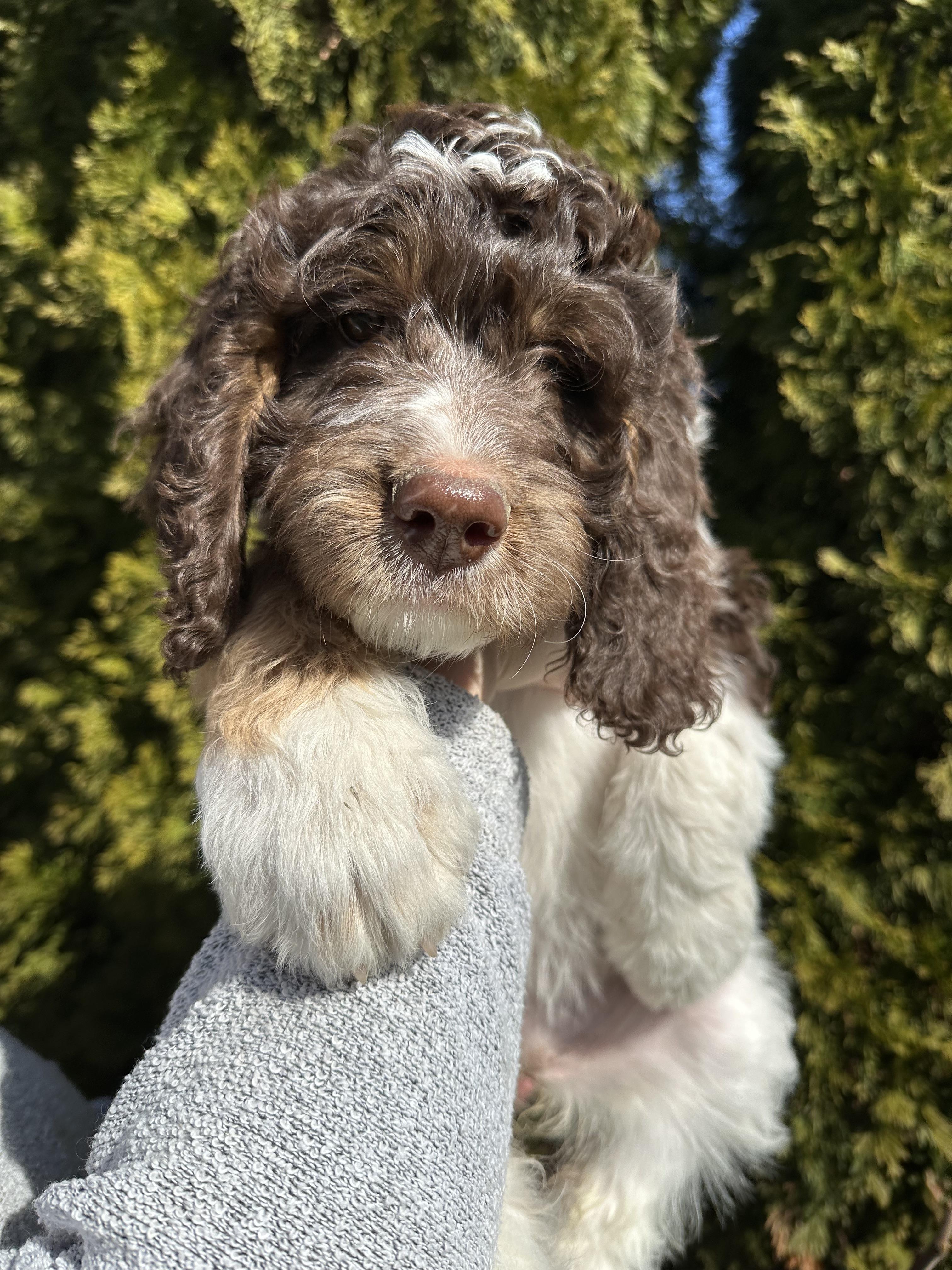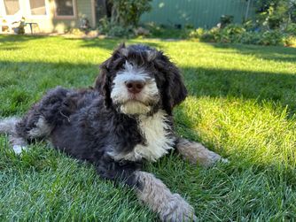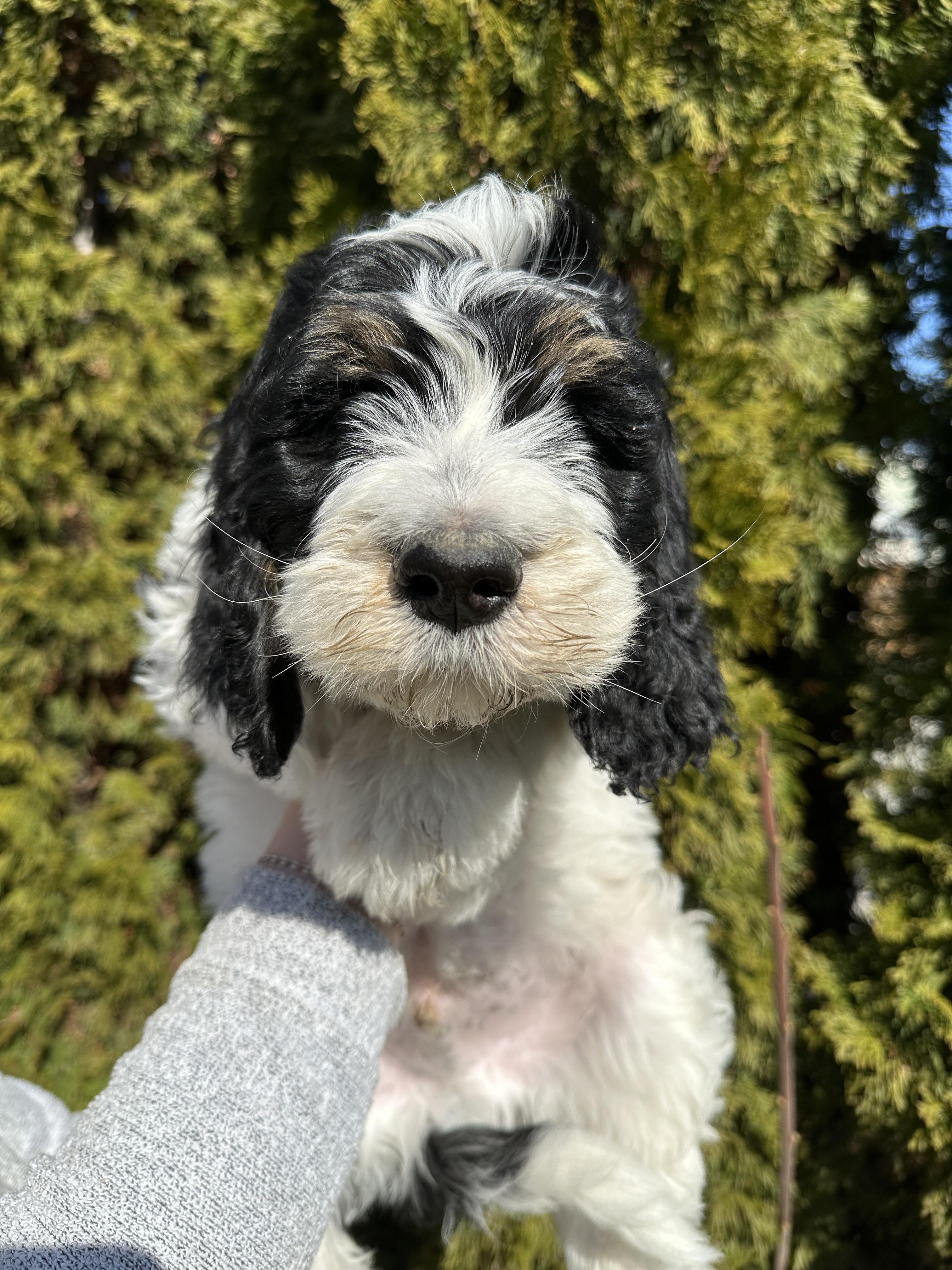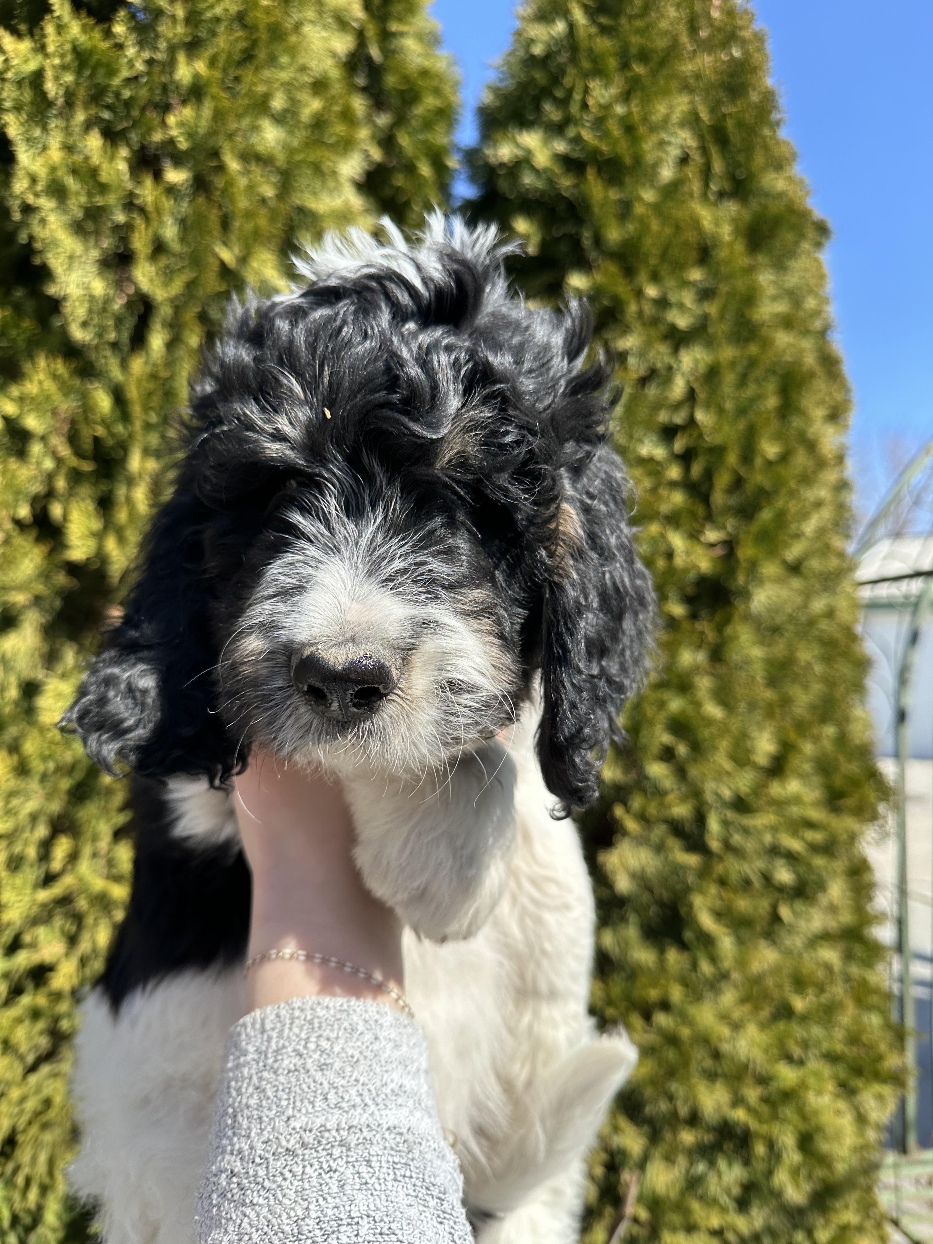 Our Bernedoodle puppies include black and white, tri-color, and phantom. Poodle puppies include black, brown, parti, and phantom. Colors will vary depending on the parent dogs.