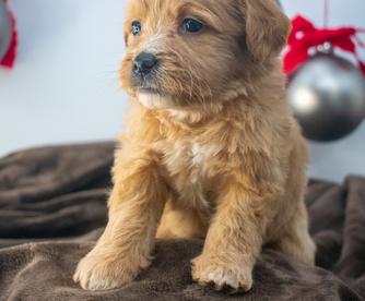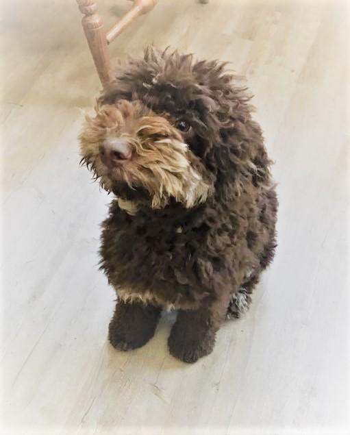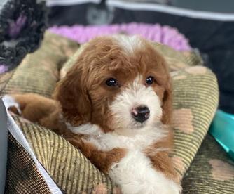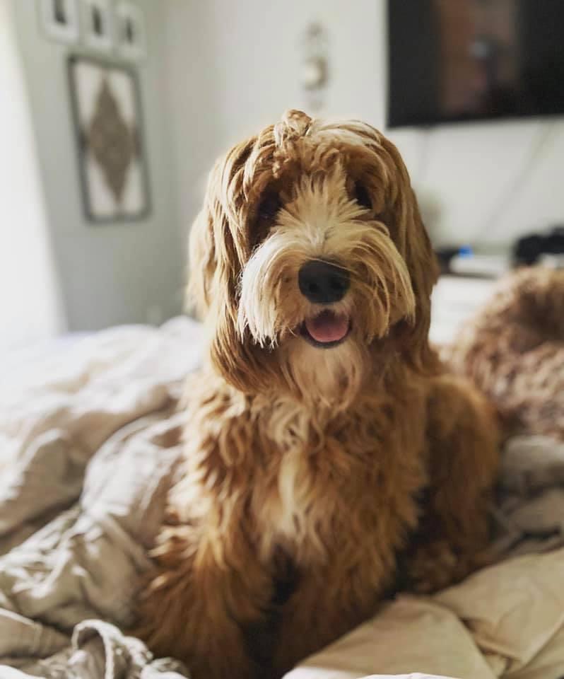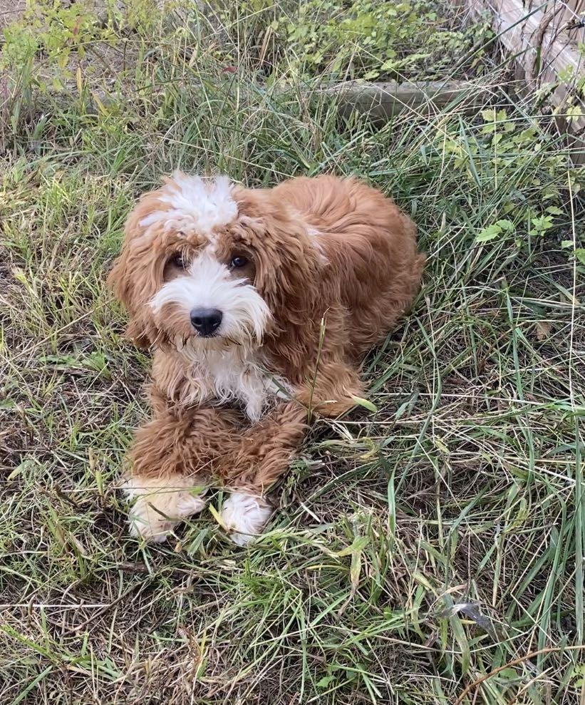 Pongo is a small in stature miniature F1b Golden-Irishdoodle with AMAZING furnishing and shaggy coat! Pongo would spend his days curled in lap if I let him, and gets along with other dogs and people.