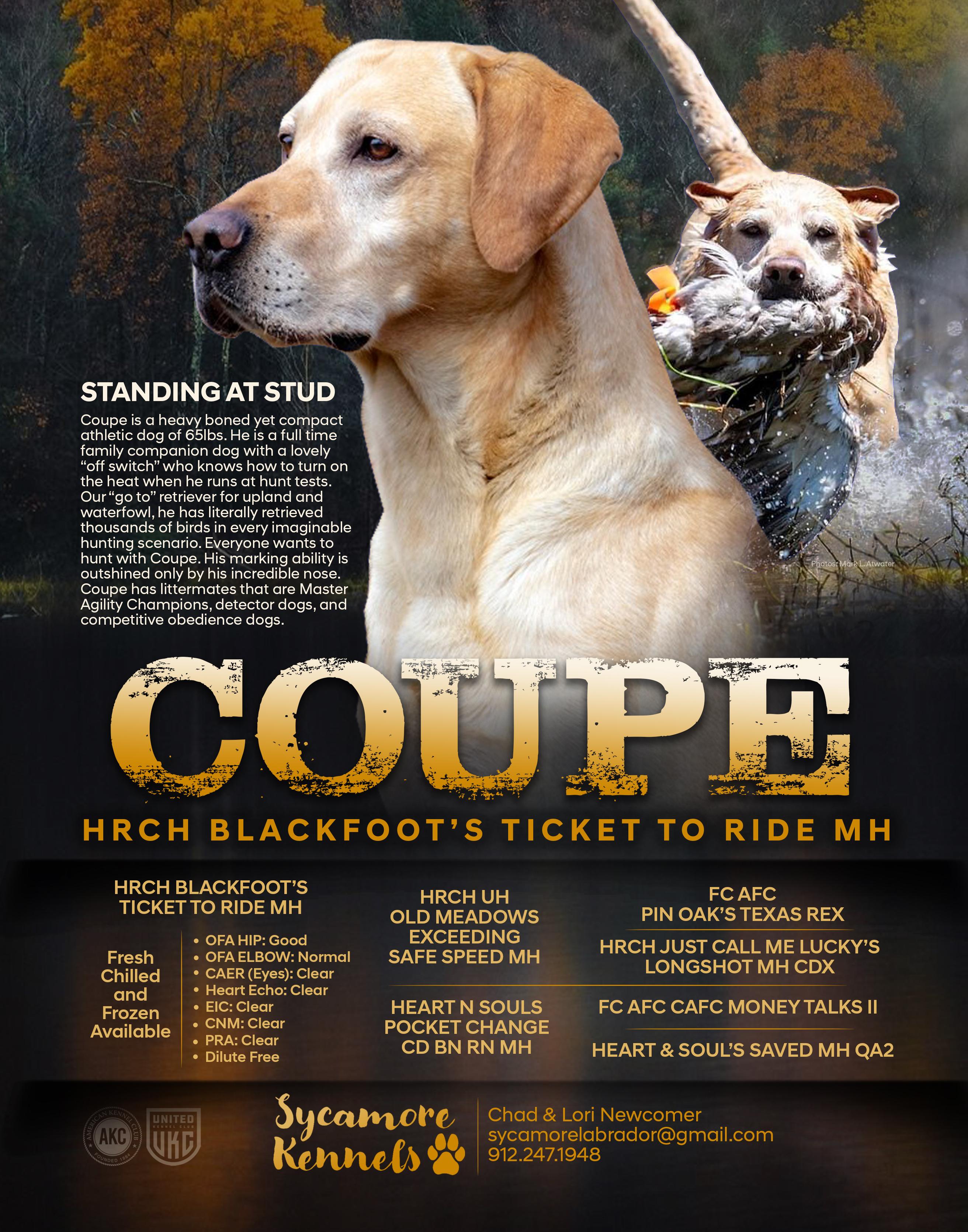 Coupe is a male Labrador Retriever. Carefully selected as a great representative of his breed, Chad & Lori decided to make him part of their program. Chad & Lori has passed Good Dog’s screening process, which involved a review of their breeding practices, environment, and the mental and physical health of their dogs.