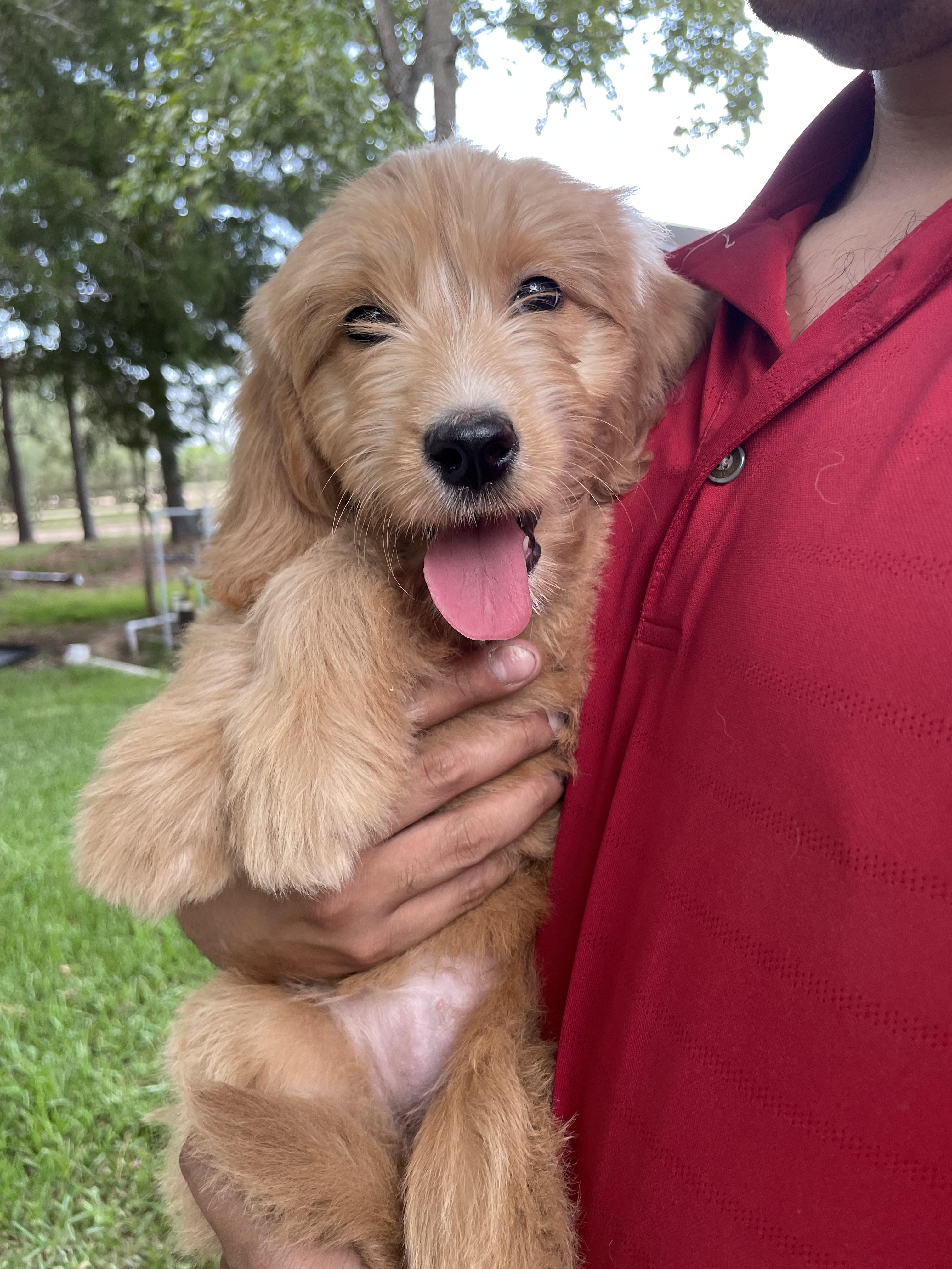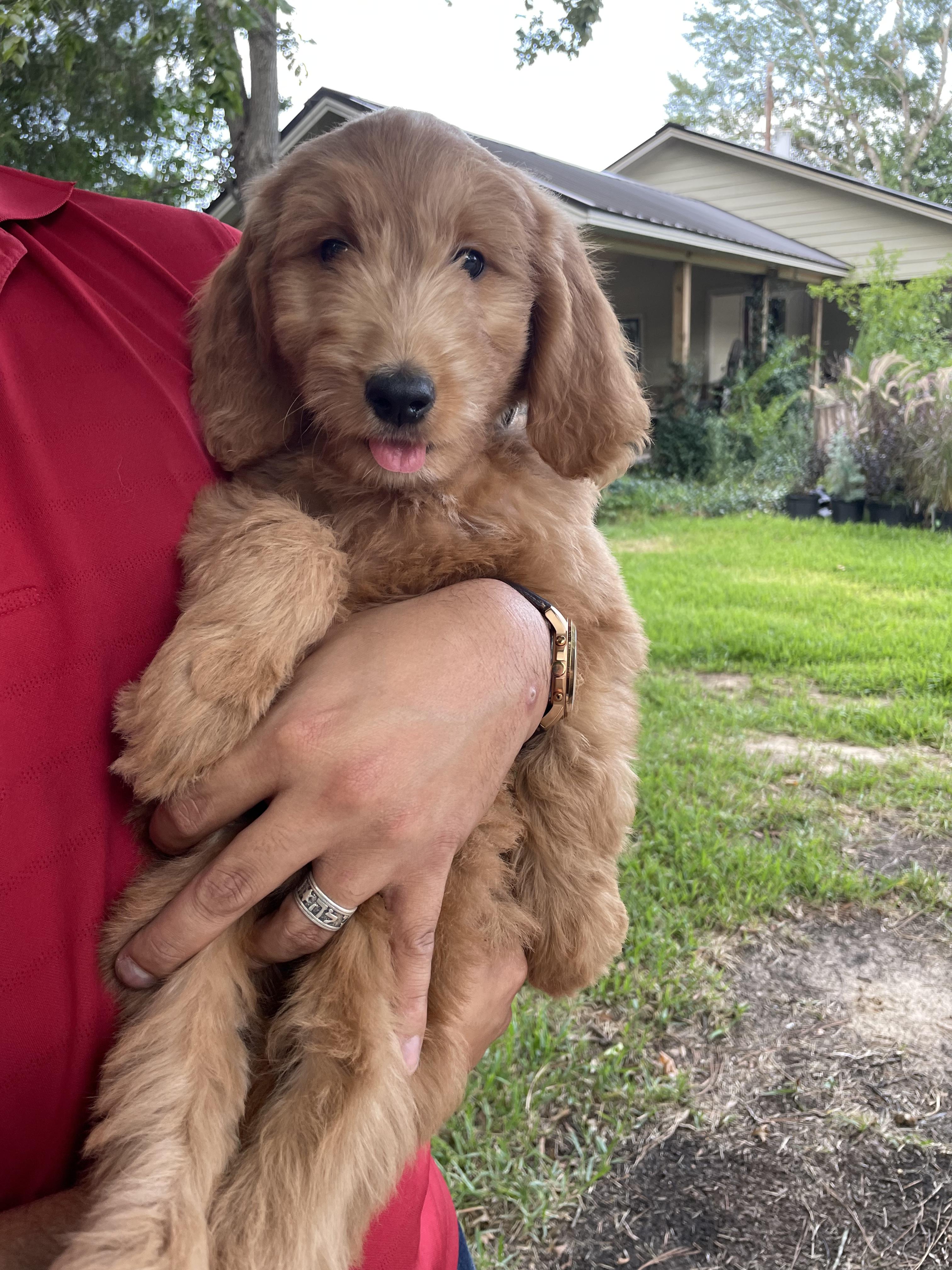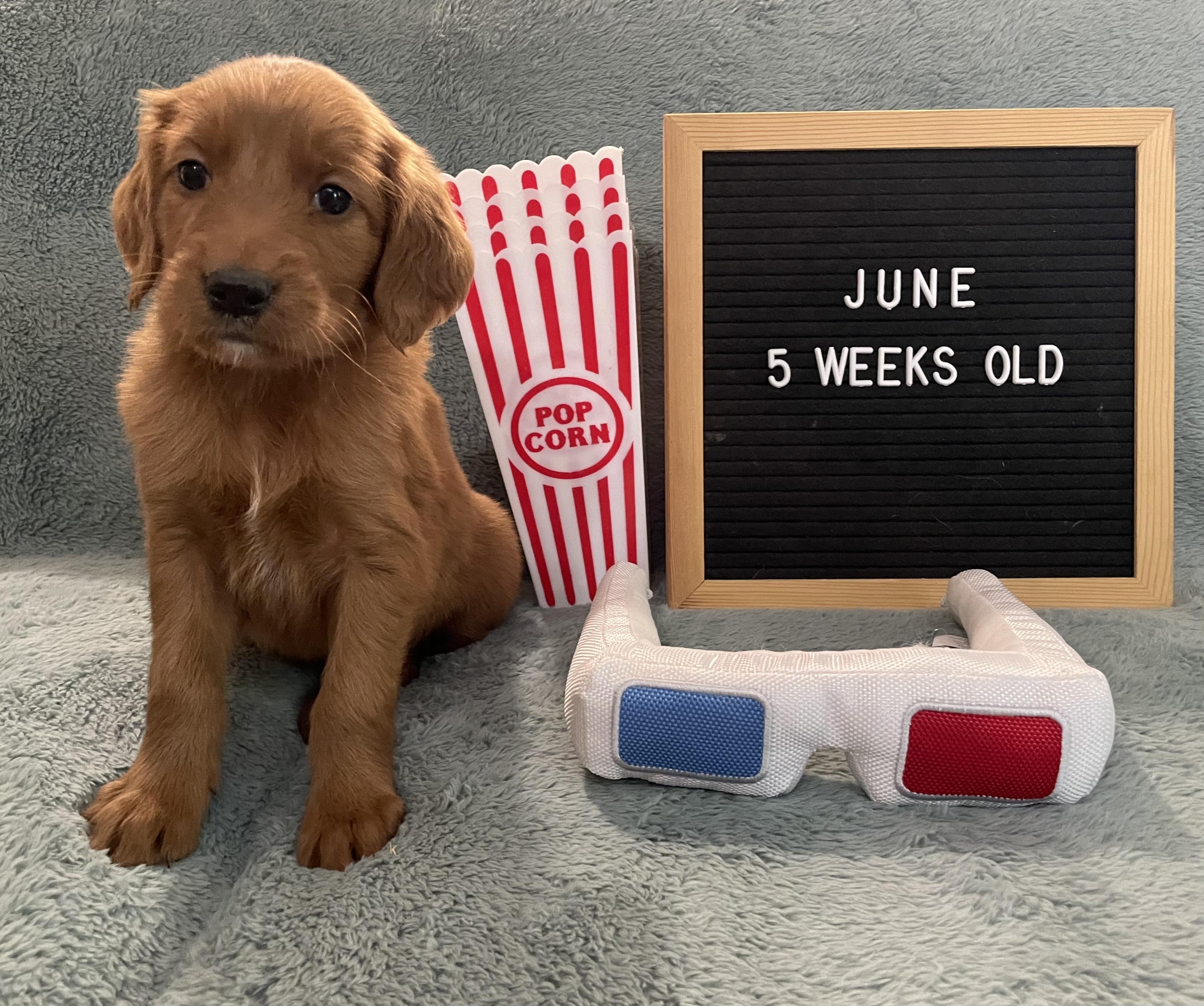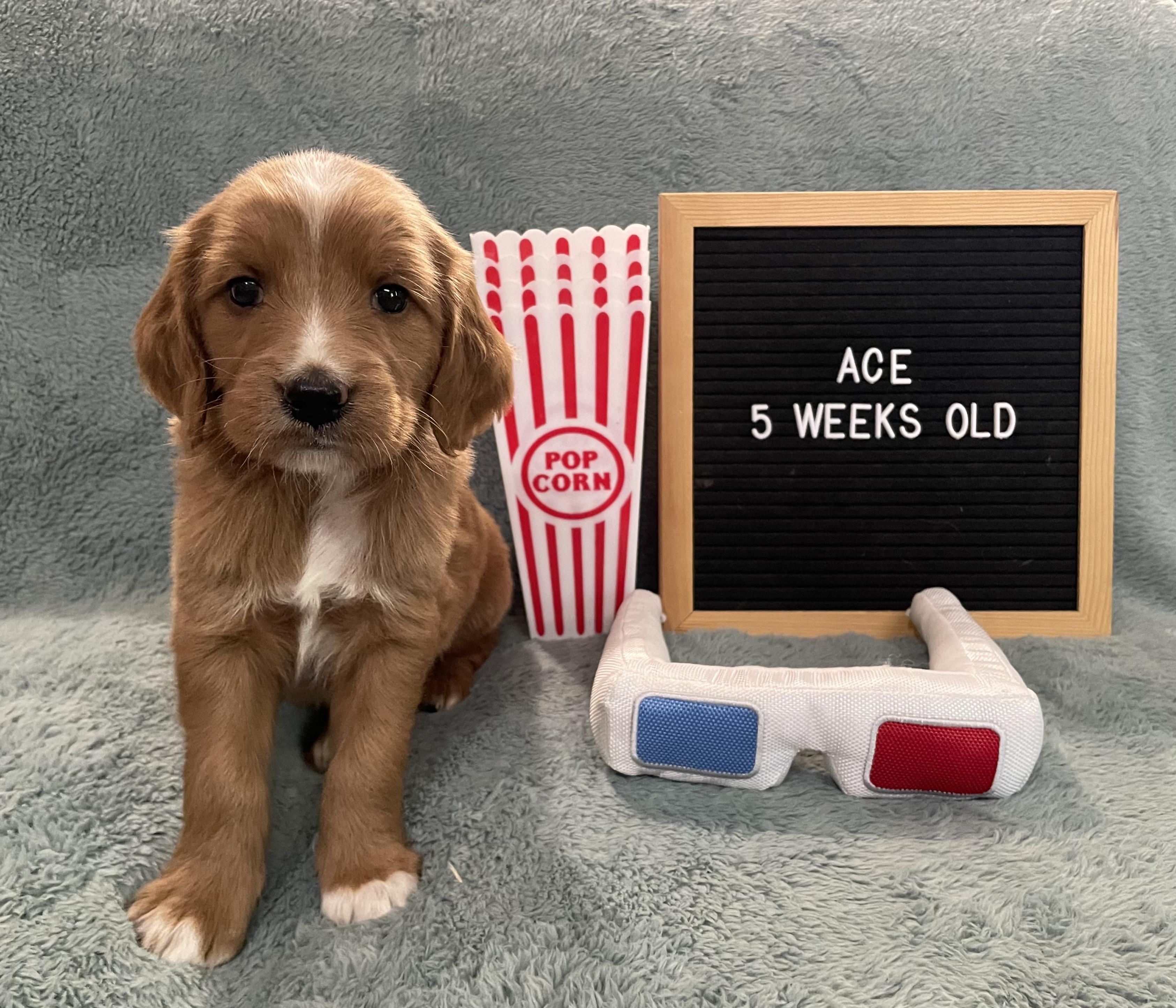 Our Golden Retriever puppies are light golden. Goldendoodle puppies include cream, apricot, and red. Aussiedoodle puppies include blue merle, red merle, black and white, and black tri-color. Colors will vary depending on the parent dogs.