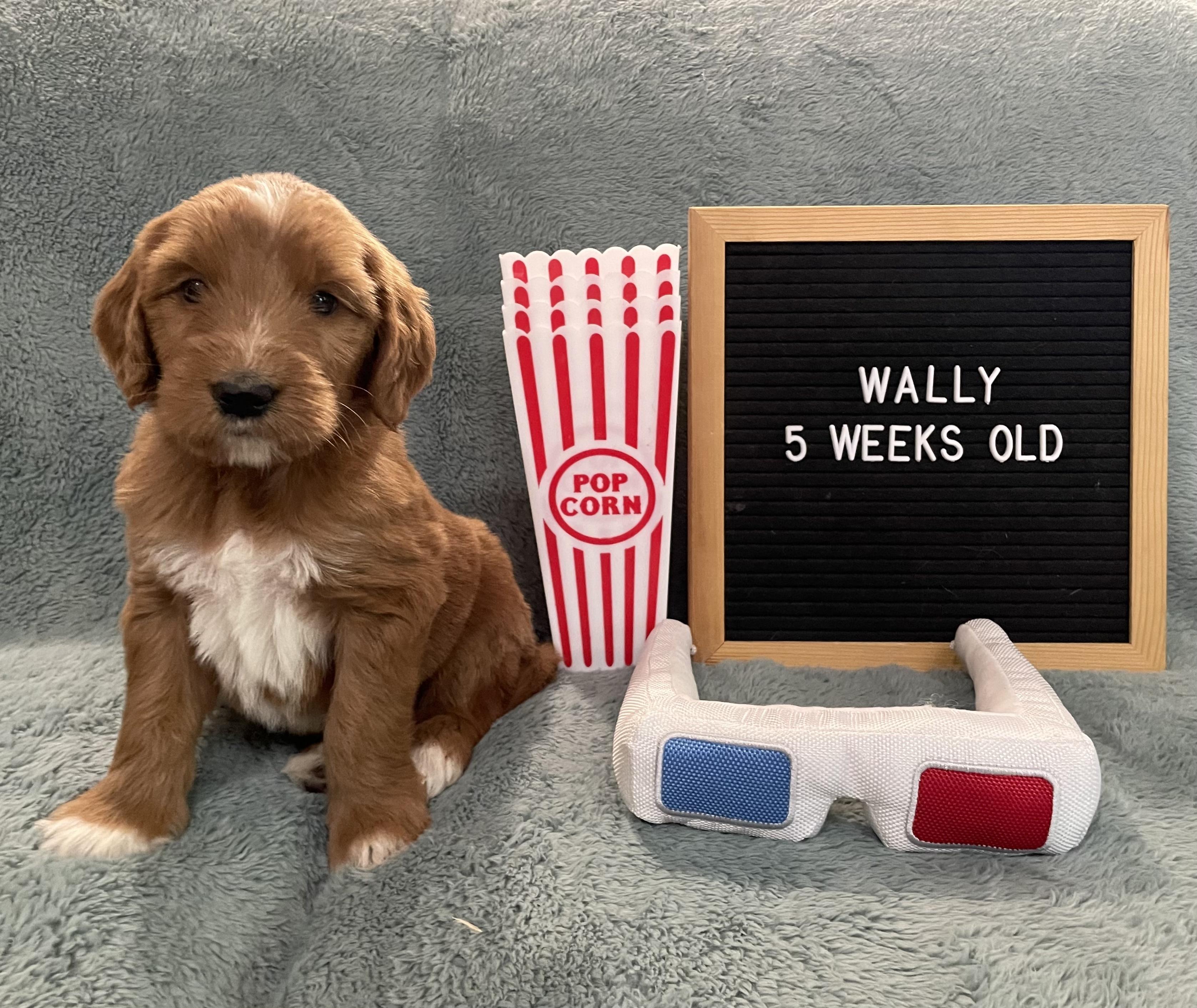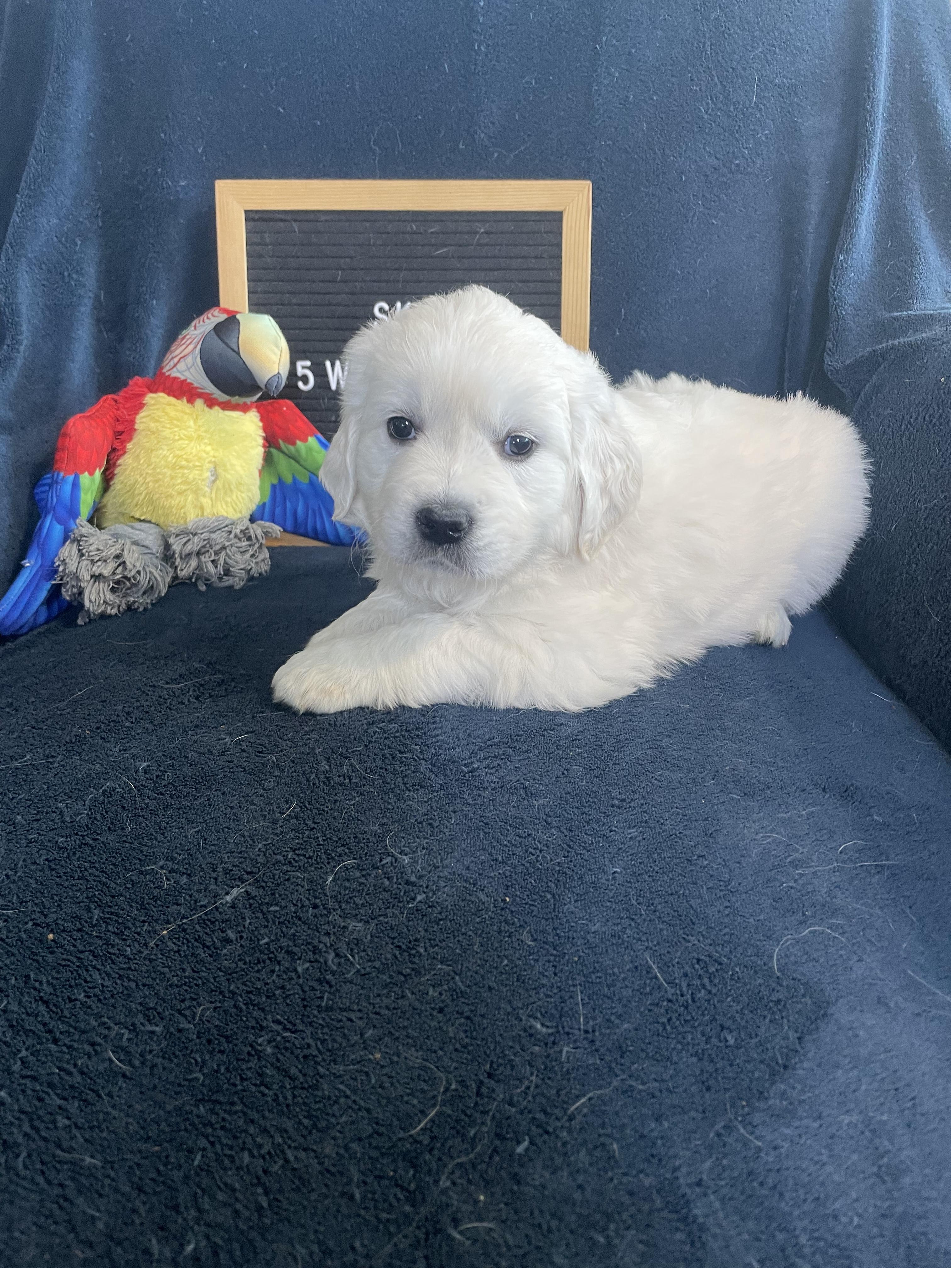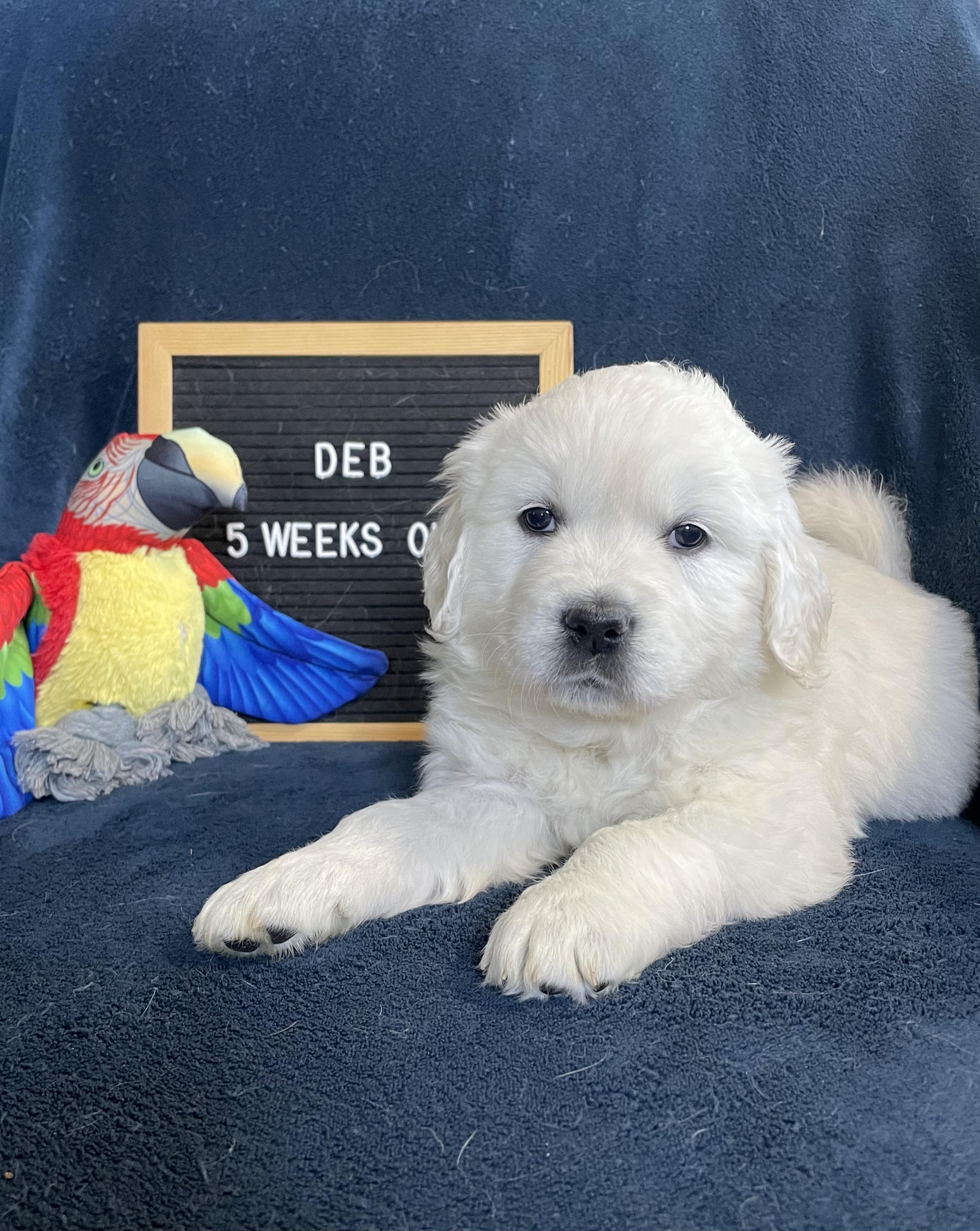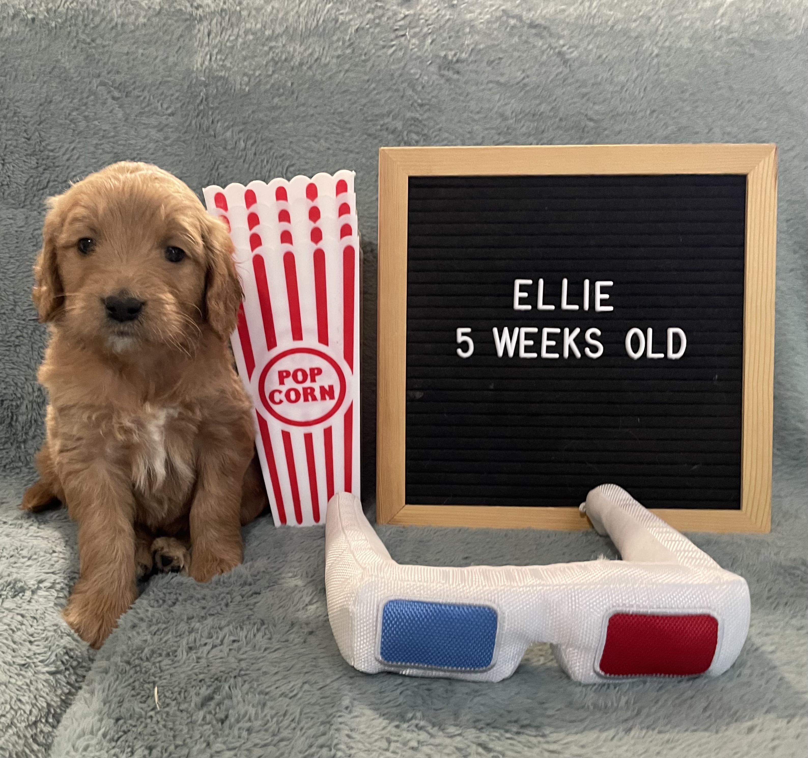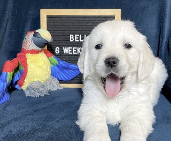 Our Golden Retriever puppies are light golden. Goldendoodle puppies include cream, apricot, and red. Aussiedoodle puppies include blue merle, red merle, black and white, and black tri-color. Colors will vary depending on the parent dogs.