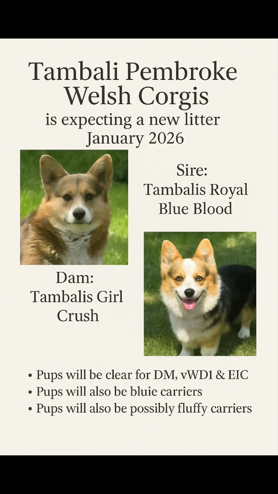 Tambali Pembroke Welsh Corgis reports to performing the health tests below on their breeding dogs. Ask your breeder about the tests performed on the parents of your litter. Learn more about health testing for Pembroke Welsh Corgis.
