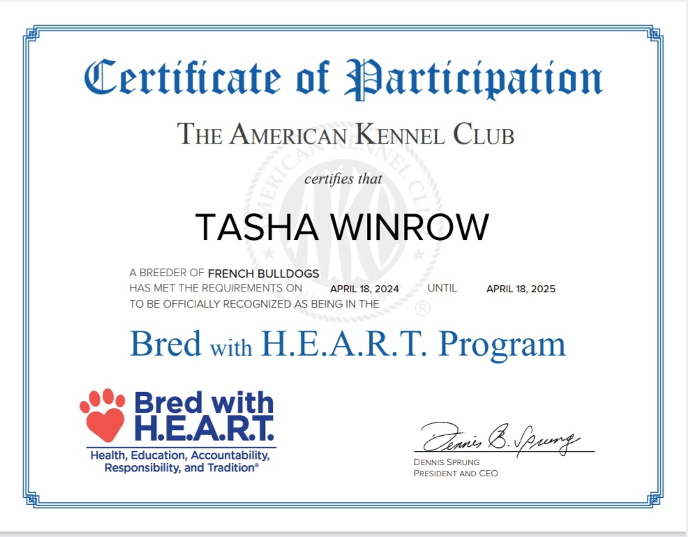 Tasha's Frenchies meets or exceeds our community standards in these areas: