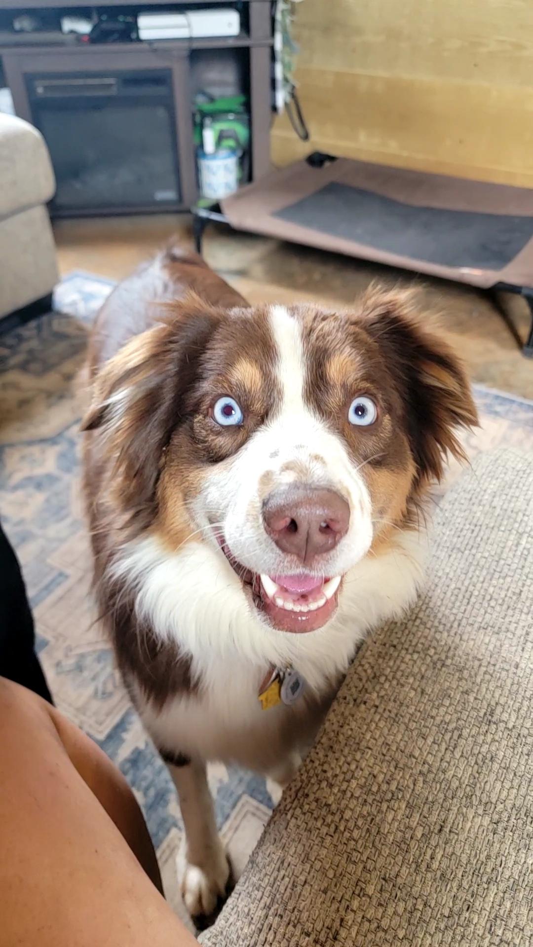 Ember is a red tri with blue eyes. She loves her moma like no other and follows her wherever she goes. Ember had a rough start to life as she contracted parvo at 7 weeks old at the breeders. She is a fighter though and came through just fine.