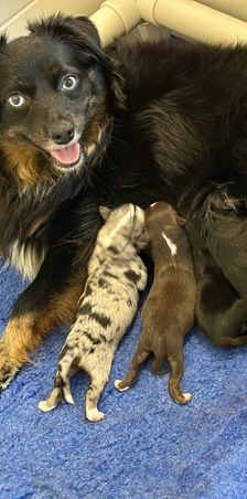 Our Toy Australian Shepherd puppies include black tri, blue merle, red merle, and red tri. Miniature American Shepherd puppies include red tri-color, black tri, red merle, and blue merle. Colors will vary depending on the parent dogs.