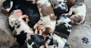 Our puppies include red merle, blue merle, red, and black tri-color. Colors will vary depending on the parent dogs.
