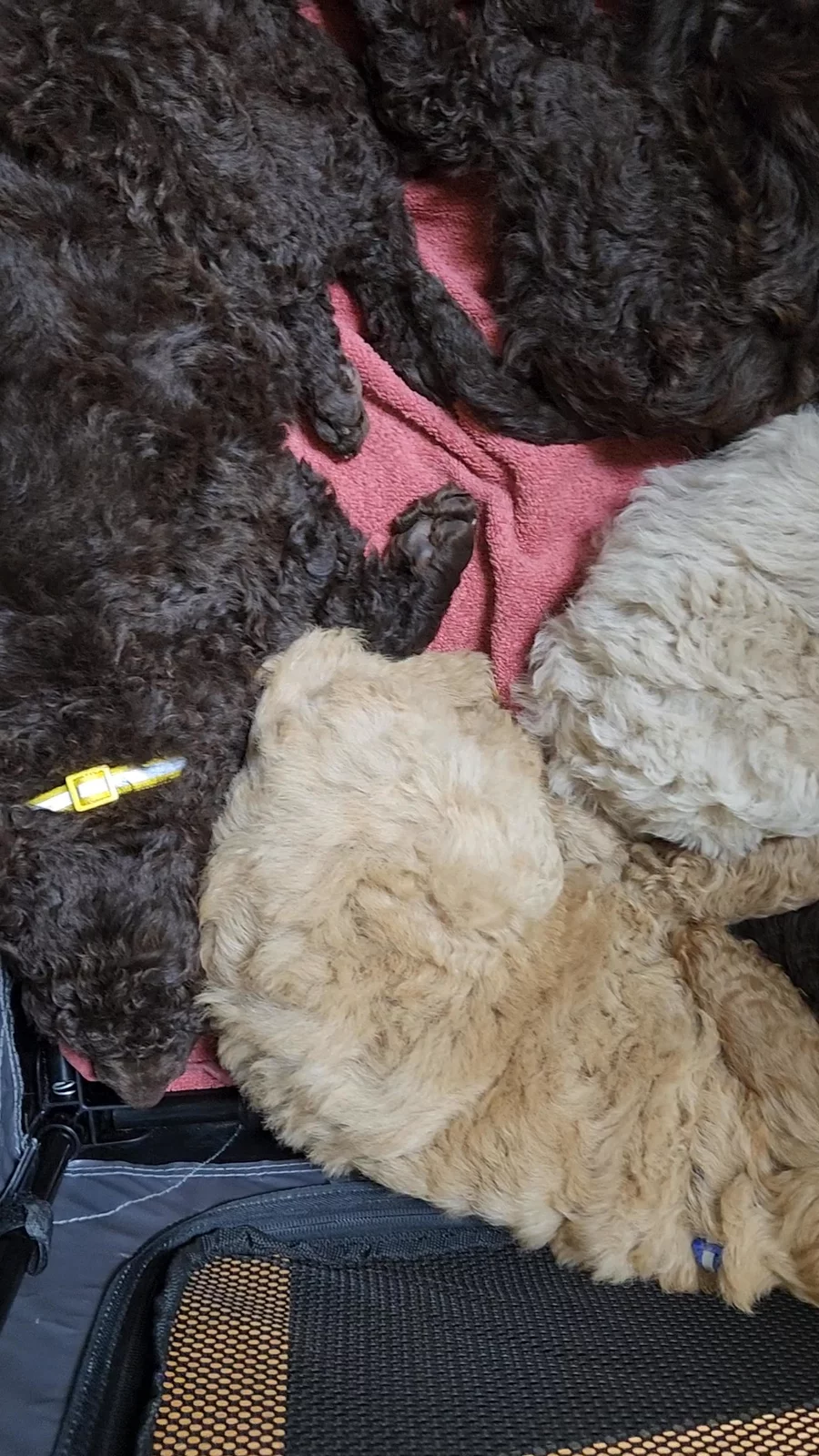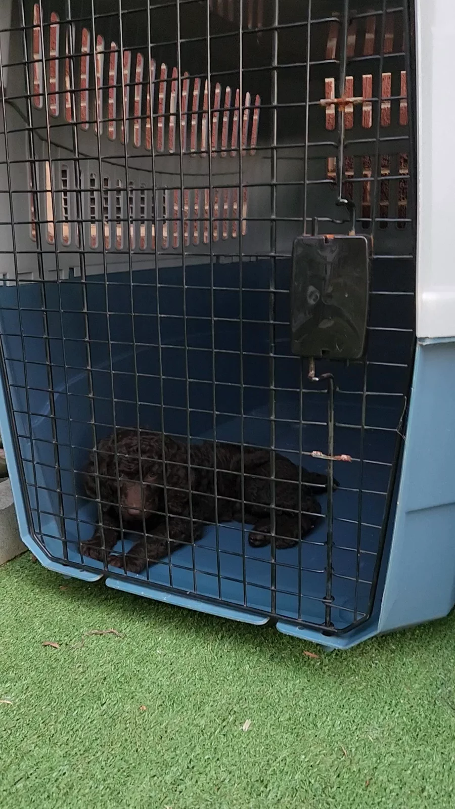 Puppies sleeping in their crates.