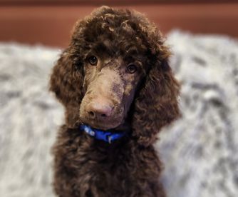 Charlie is a standard moyan poodle he is registered with AKC. He is really smart know tricks good on leash walking, Great with other animals. Loves all people adults and kids. Is Not food or treat aggressive. Very fun and easy to train. Loves to fetch balls.