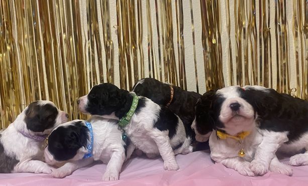 Our puppies include black and white, tri-color, and phantom. Colors will vary depending on the parent dogs.