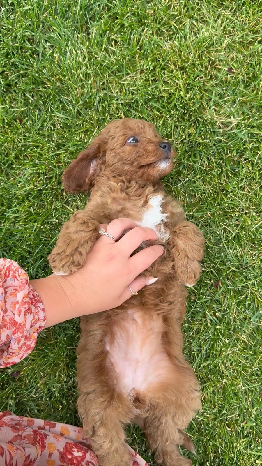 Olive is 9 weeks a looking fabulous! Her coat is a gorgeous curly red, white chest with little touches on her paws and chin of white! Not to mention her fantastic ears 🐶