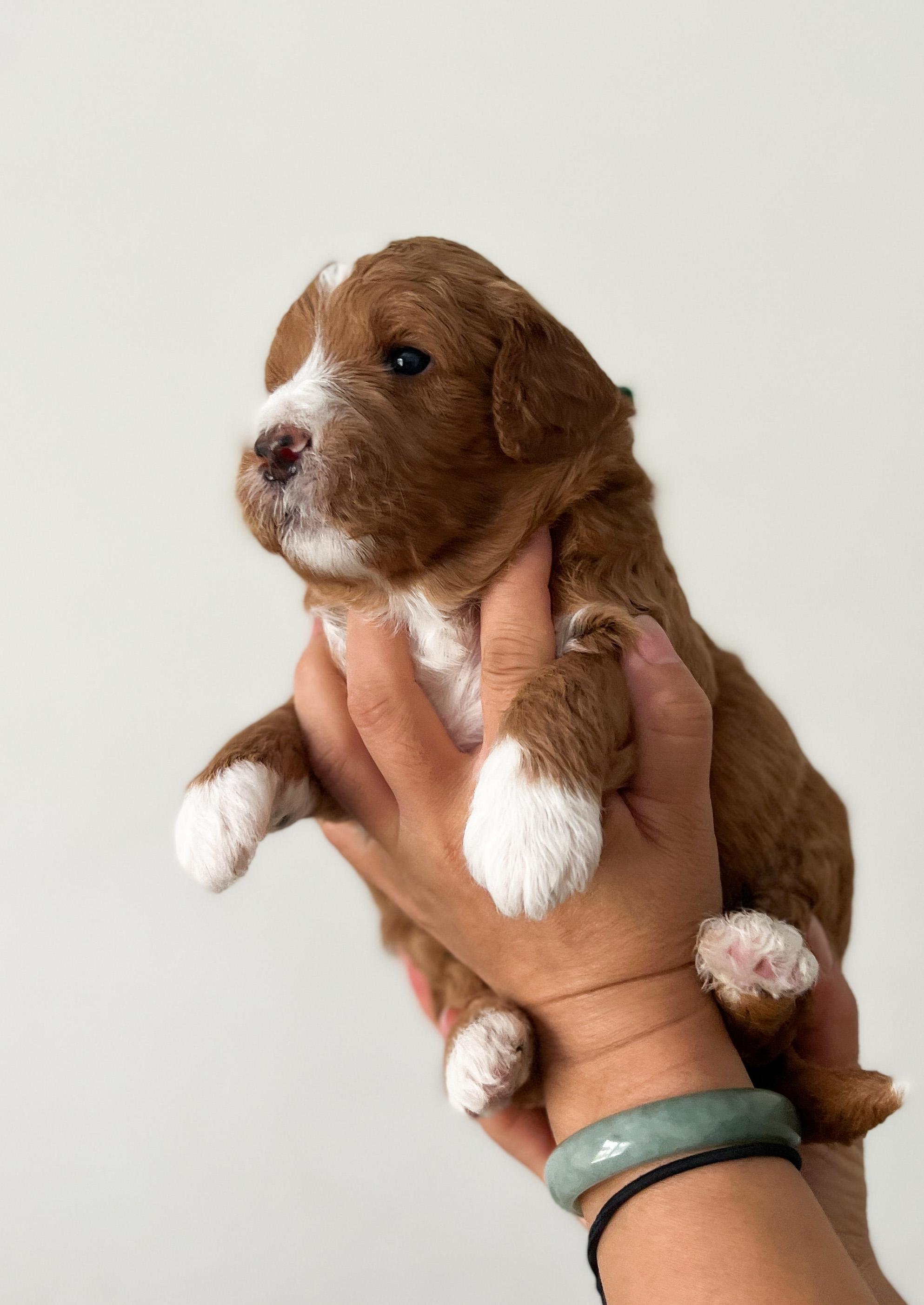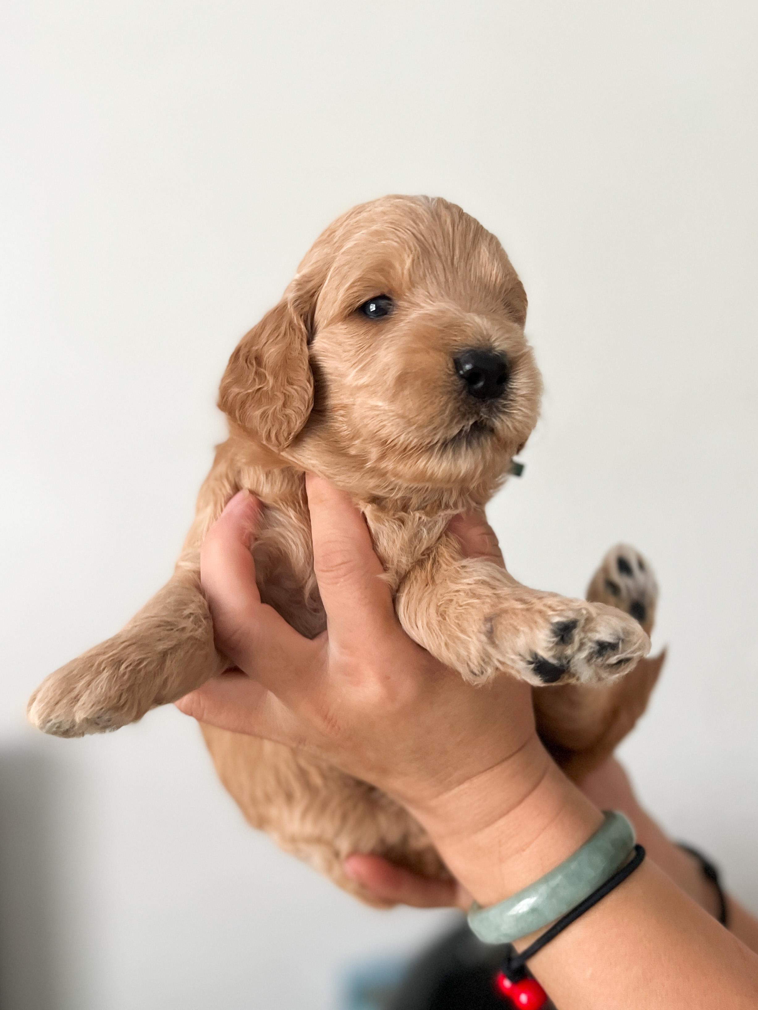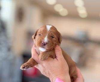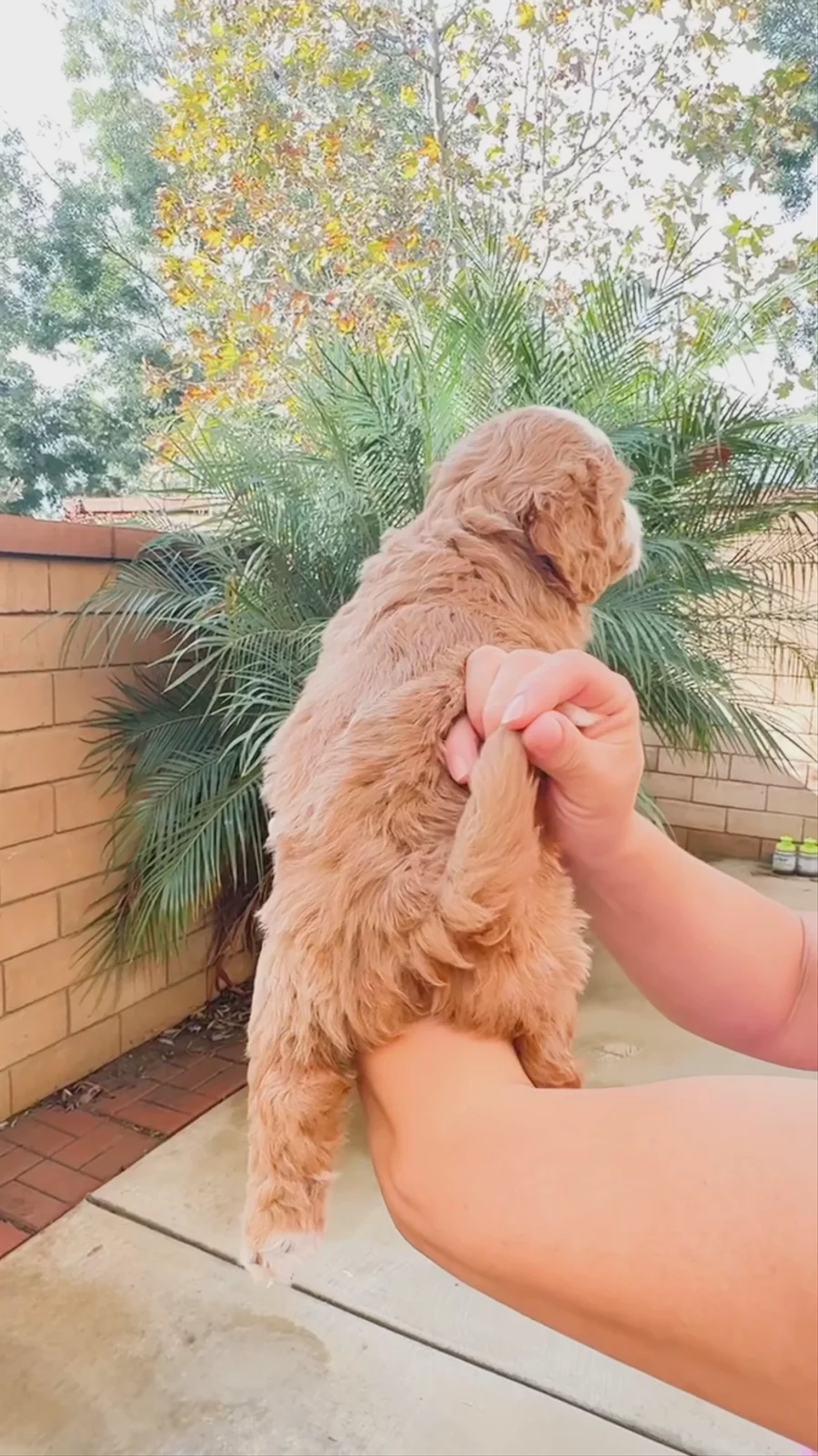 Peanut is one of our tiny little F1B Goldendoodle studs, we just love his colors and markings, little but brave full of energy, happy and playful.
