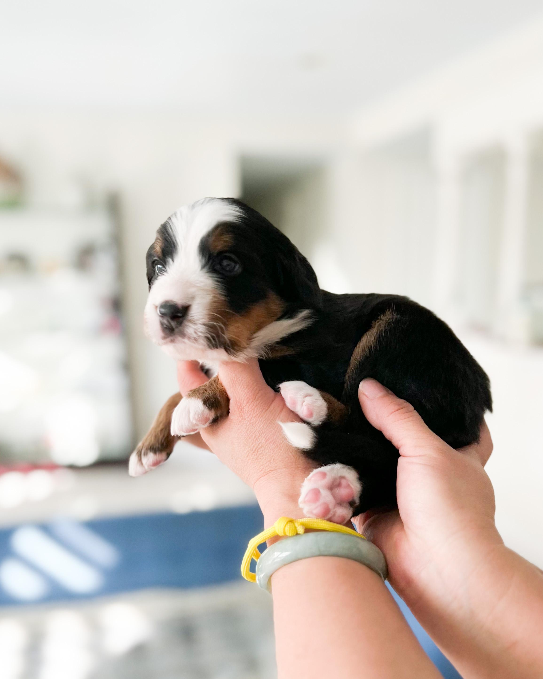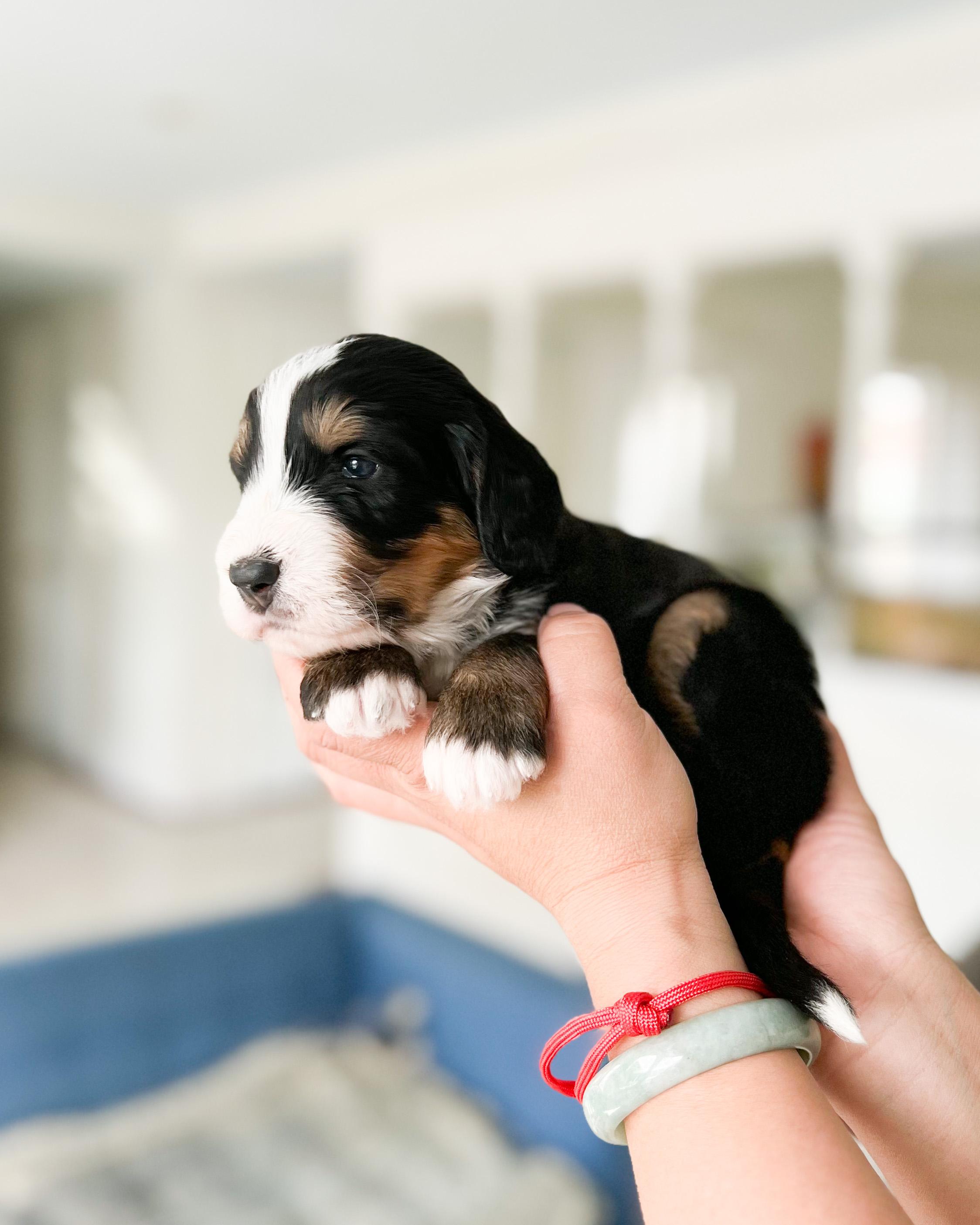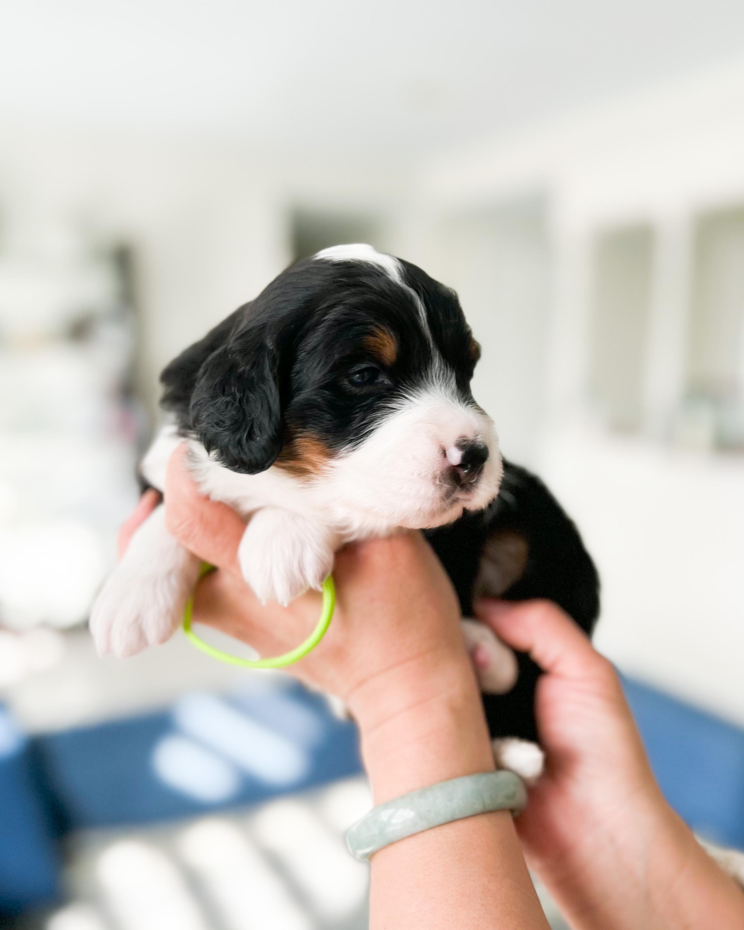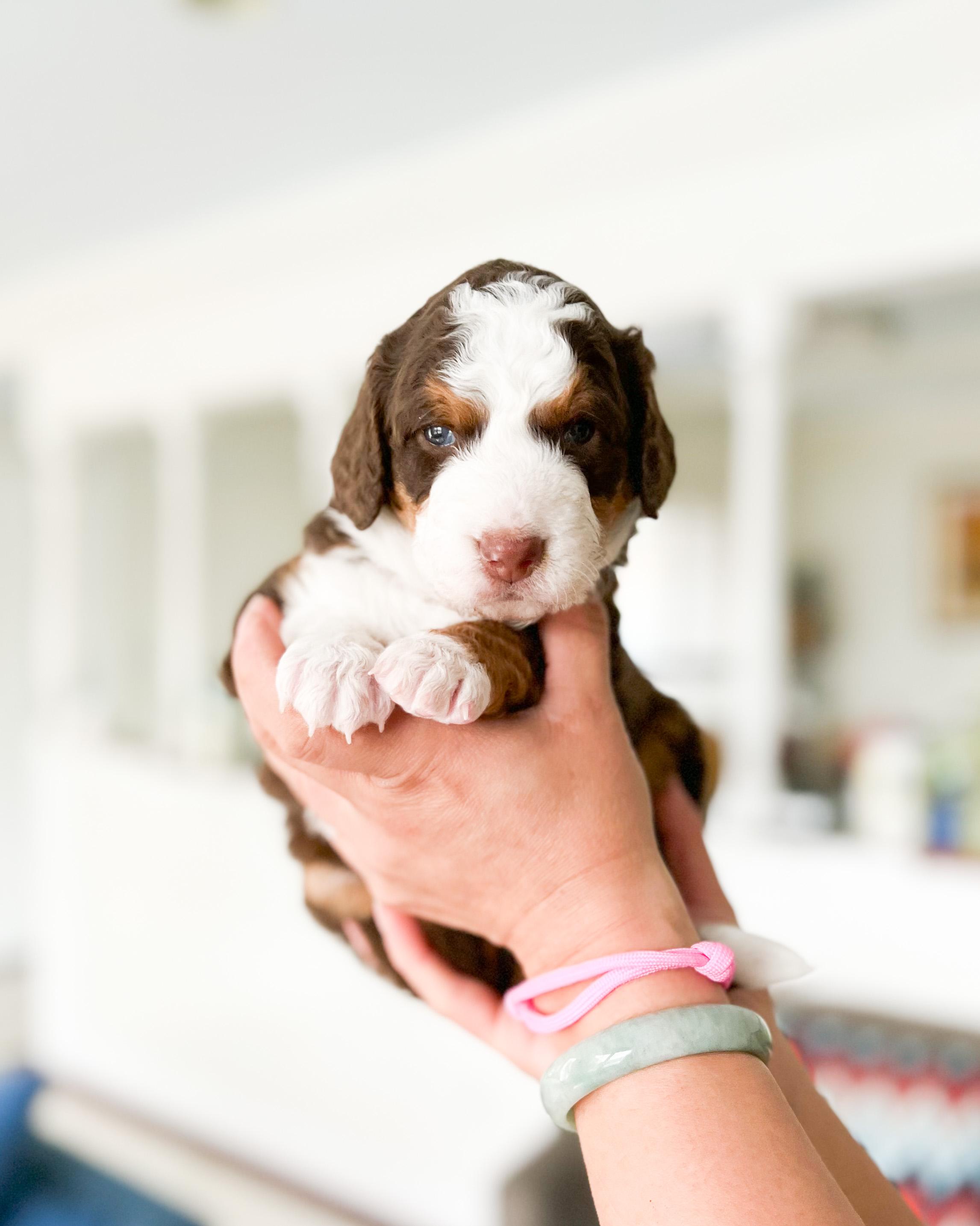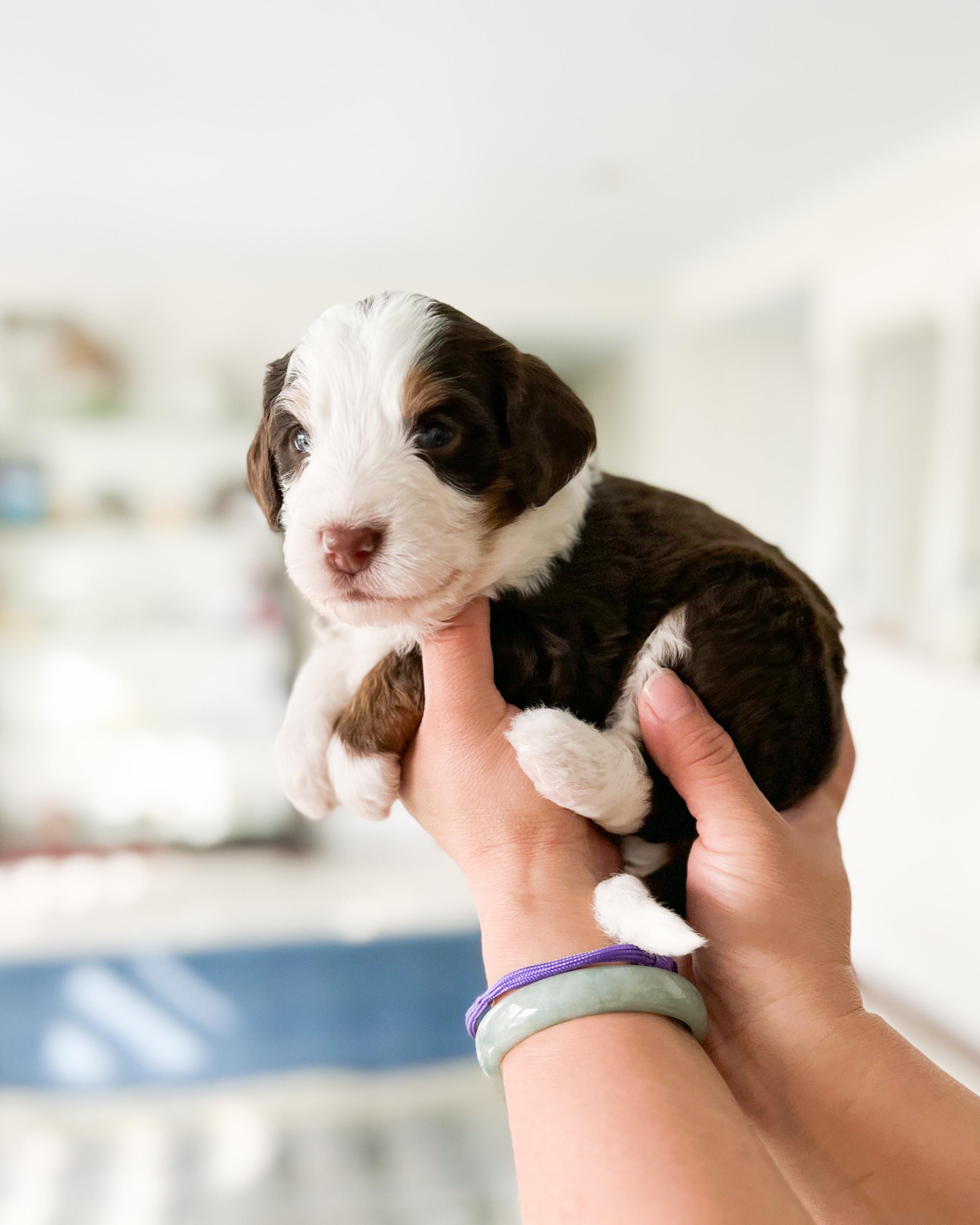 Bao Bao is from my own bloodline. She is an active happy girl and also the largest Bernedoodle mom I have. She has a Chocolate Brown Tricolor which is very rare in Bernedoodles. She just turned two years old and this is her first litter.